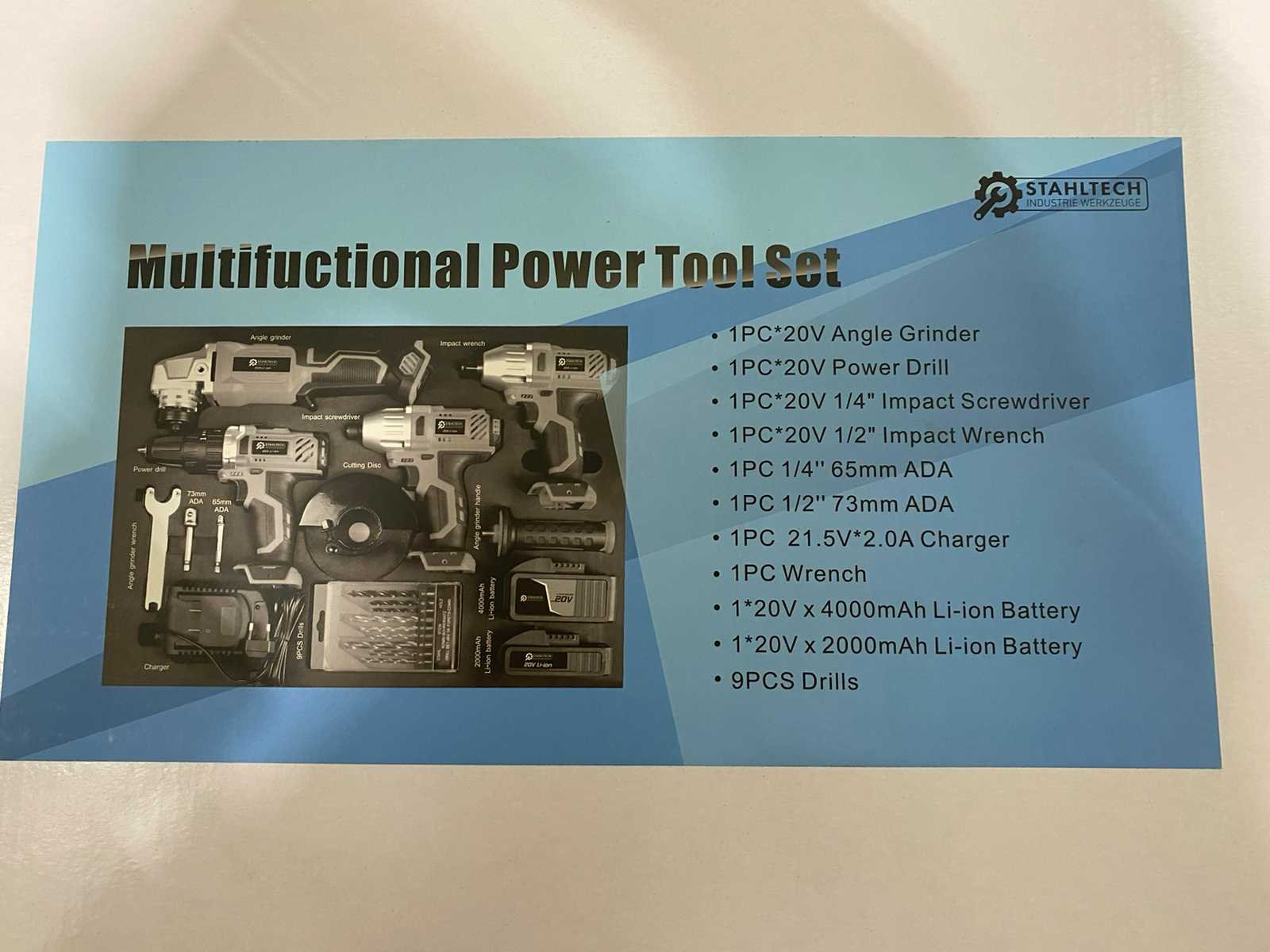<li><b>4-delige set accu gereedschappen</b></li> <li><b>Bestaande uit:</b> <ul> <li>Accu boormachine</li> <li>Accu schroefmachine</li> <li>Accu slagmoersleutel</li> <li>Accu haakse slijper</li> </ul> </li> <li><b>Inclusief:</b> Accu’s: <ul> <li>1 x lithium-ion accu 20 volt, 2000 mAh</li> <li>1 x lithium-ion accu 20 volt, 4000 mAh</li> </ul> </li> <li><b>Inclusief:</b> acculader</li> <li><b>Inclusief:</b> 9-delige borenset</li> <li><b>Inclusief:</b> 5 slijpschijven</li> <li><b>Inclusief:</b> toebehoren</li> <li><b>Goed om te weten:</b> foam inlay voor de laden van een gereedschapswagen</li> <li><b>Afmeting:</b> 52,5 x 38,5 cm</li> <li><b>Staat:</b> Ongebruikt, in de originele verpakking</li> No Merk: Stahlgruppe