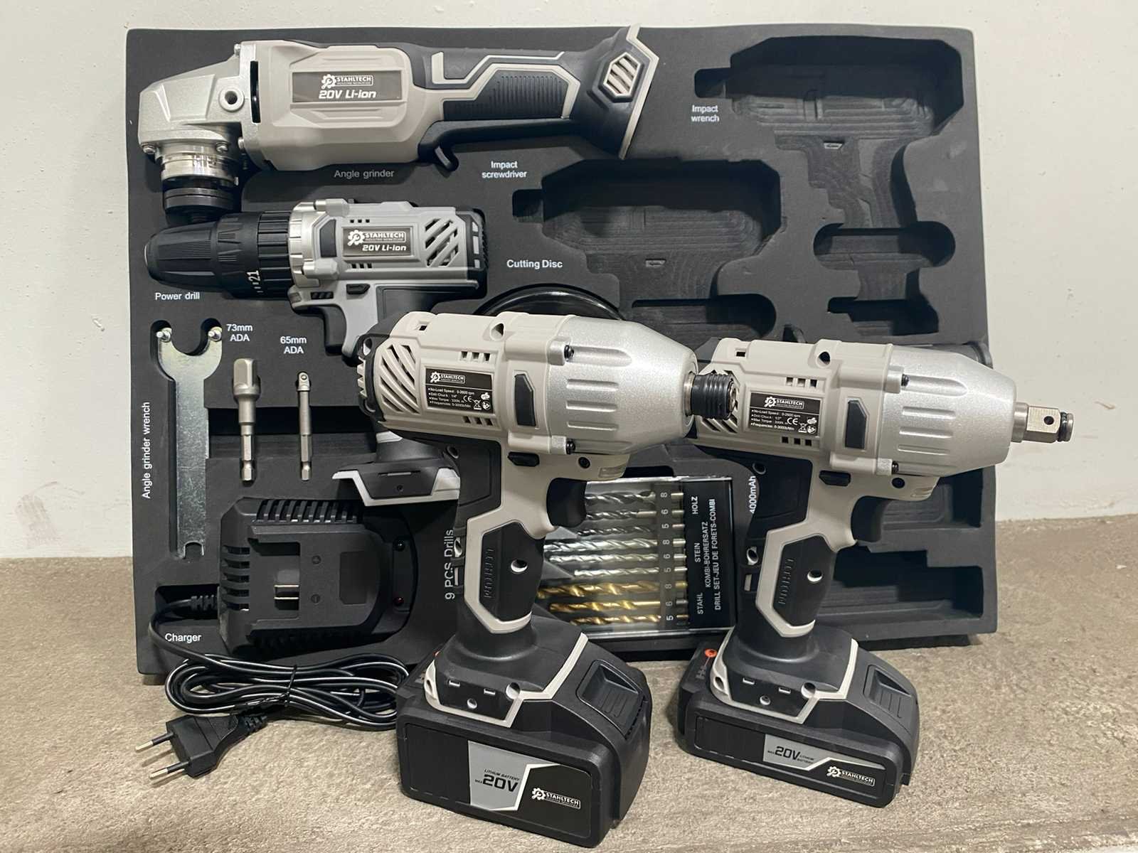<li><b>4-delige set accu gereedschappen</b></li> <li><b>Bestaande uit:</b> <ul> <li>Accu boormachine</li> <li>Accu schroefmachine</li> <li>Accu slagmoersleutel</li> <li>Accu haakse slijper</li> </ul> </li> <li><b>Inclusief:</b> Accu’s: <ul> <li>1 x lithium-ion accu 20 volt, 2000 mAh</li> <li>1 x lithium-ion accu 20 volt, 4000 mAh</li> </ul> </li> <li><b>Inclusief:</b> acculader</li> <li><b>Inclusief:</b> 9-delige borenset</li> <li><b>Inclusief:</b> 5 slijpschijven</li> <li><b>Inclusief:</b> toebehoren</li> <li><b>Goed om te weten:</b> foam inlay voor de laden van een gereedschapswagen</li> <li><b>Afmeting:</b> 52,5 x 38,5 cm</li> <li><b>Staat:</b> Ongebruikt, in de originele verpakking</li> Nee Merk: Stahlgruppe