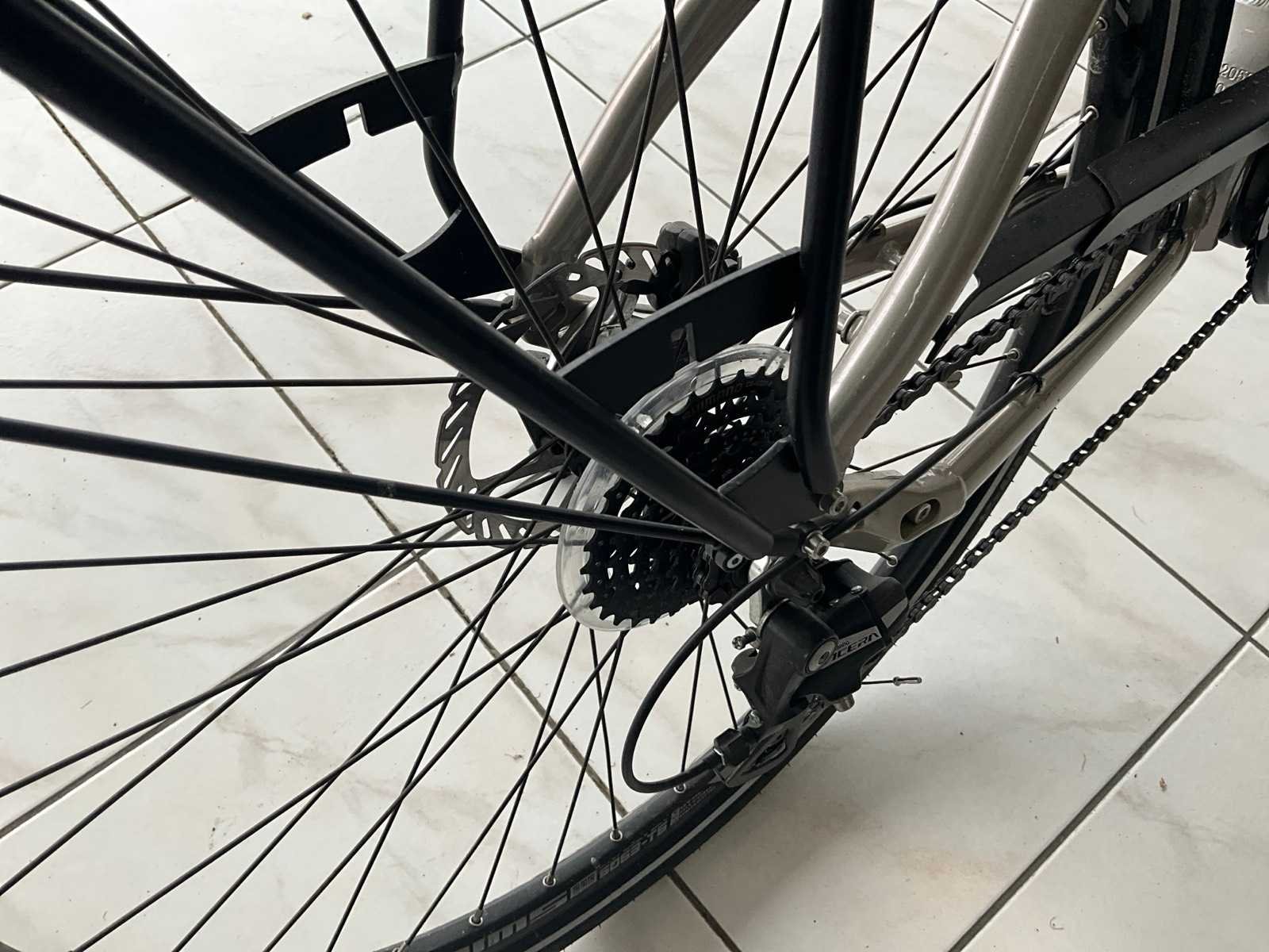 Voorzien van Shimano versnellingen, Minerva elektromotor met batterij No Merk: Minerva Model: Volos Ebk Motorpositie: Midden Remsysteem: Schijven Voorvering: true Versnellingen: 8 Framemaat: 28’’