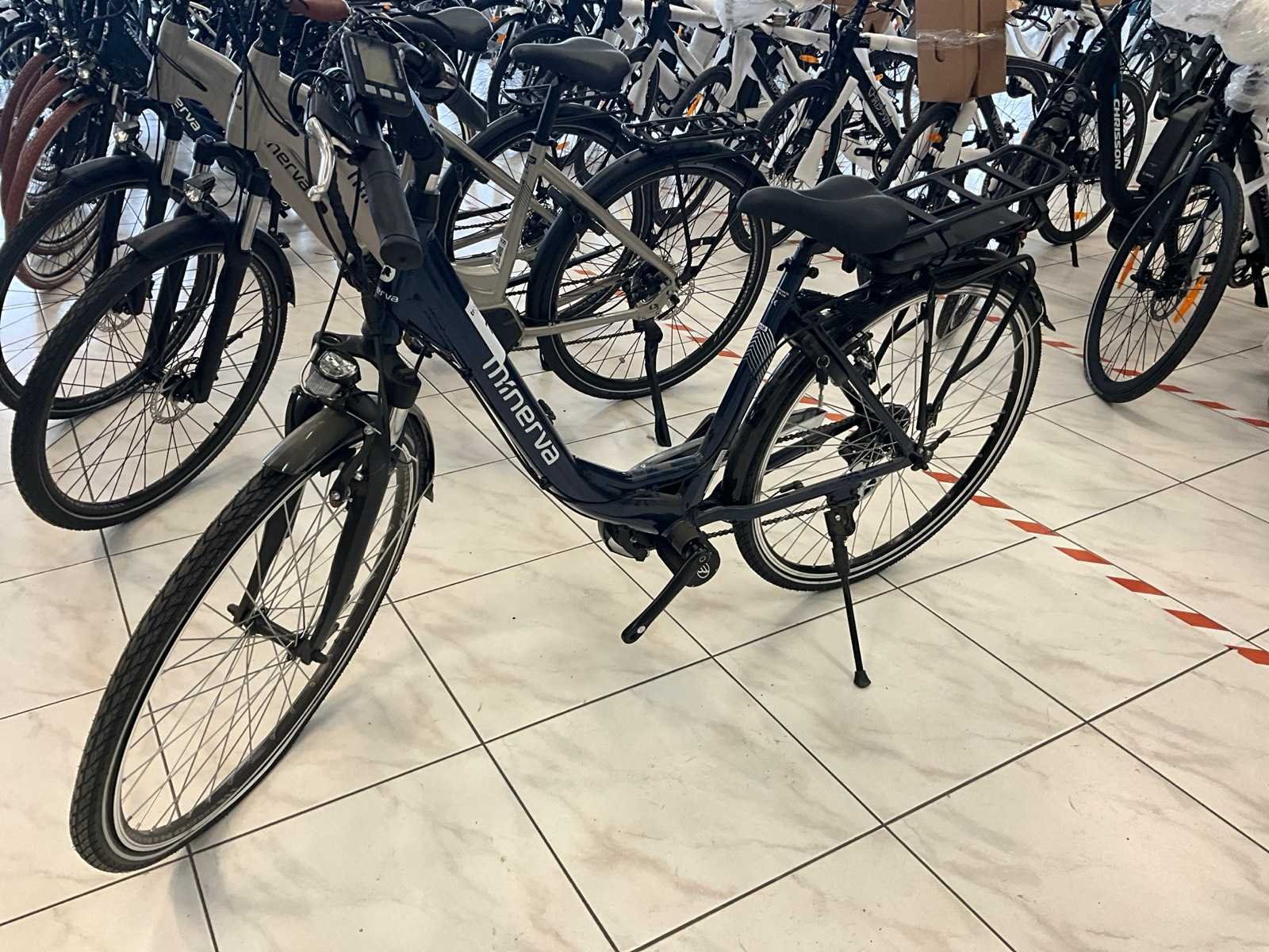 Voorzien van Shimano versnellingen, Minerva elektromotor met batterij No Merk: Minerva Model: E BK Motorpositie: Midden Remsysteem: Blokjes Voorvering: true Versnellingen: 7 Framemaat: 28’’
