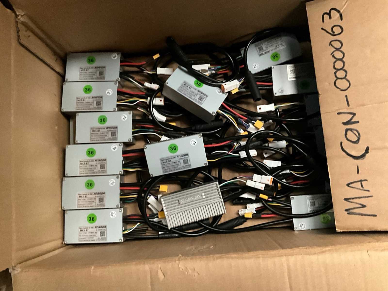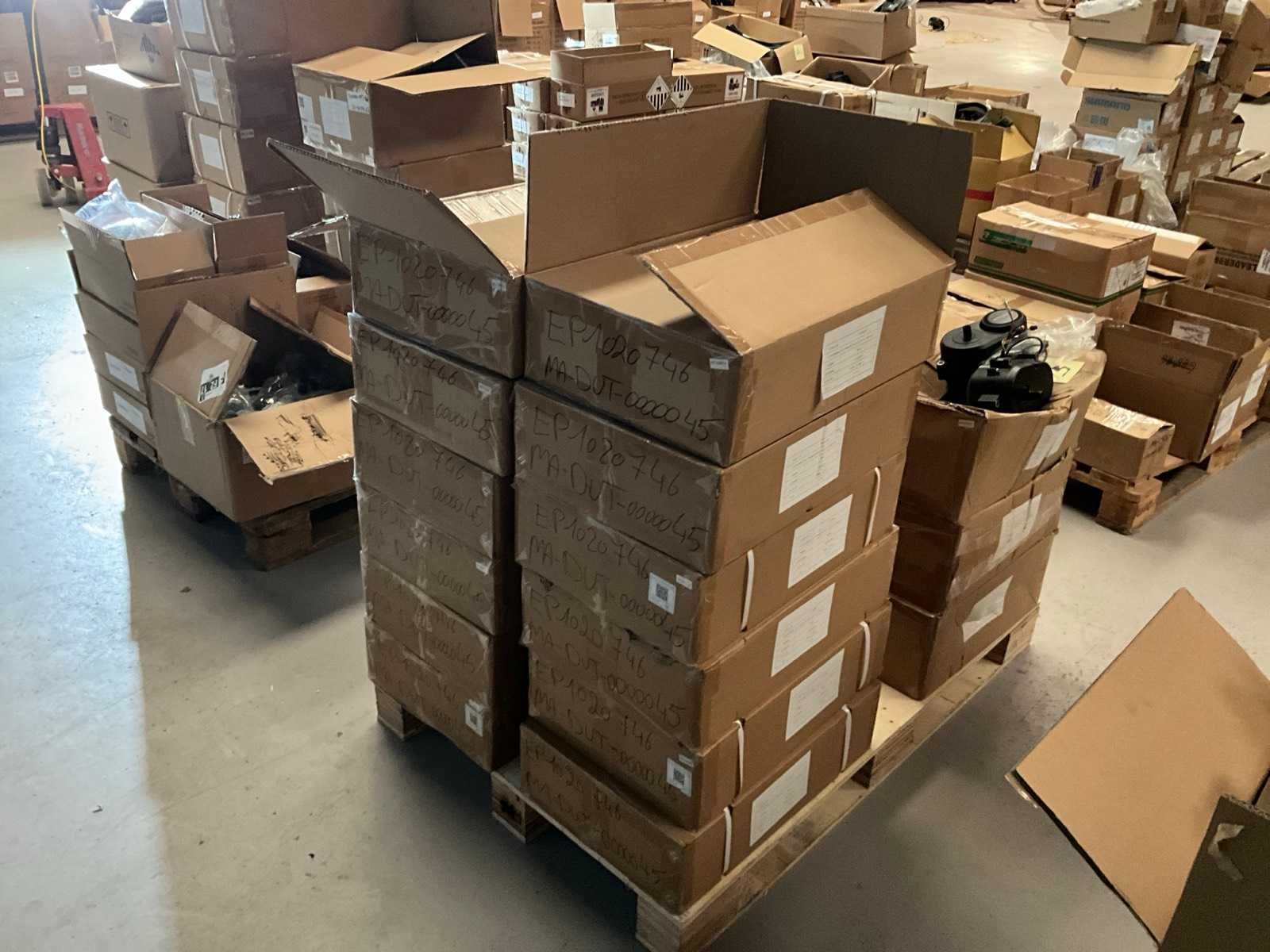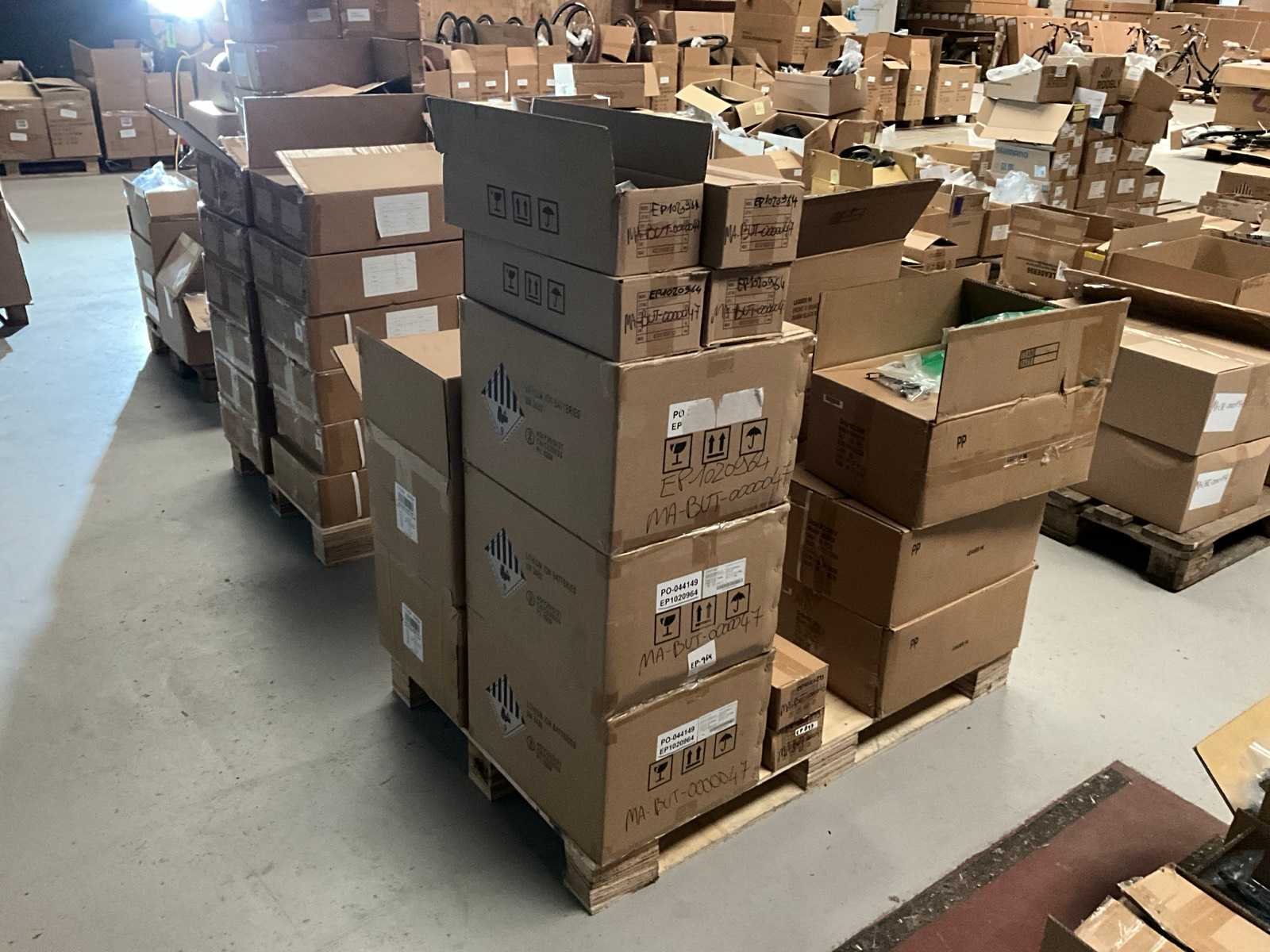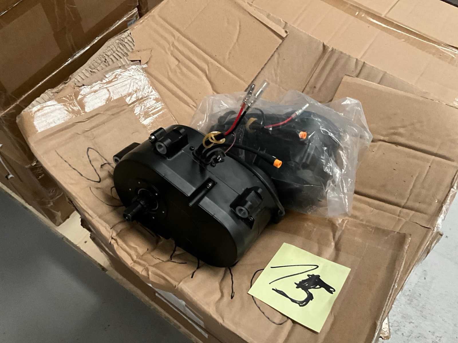 Bestaand uit 3x pallet met inhoud bestaande uit sensoren-bekabeling-batterij doc-in platen, 12x karton electro wielmotoren-6x karton middenmotoren-LI-ION batterijen type 4G/Y26/S/21 in 3x karton-2x karton opladers-7x karton wielremmen, enz.. No
