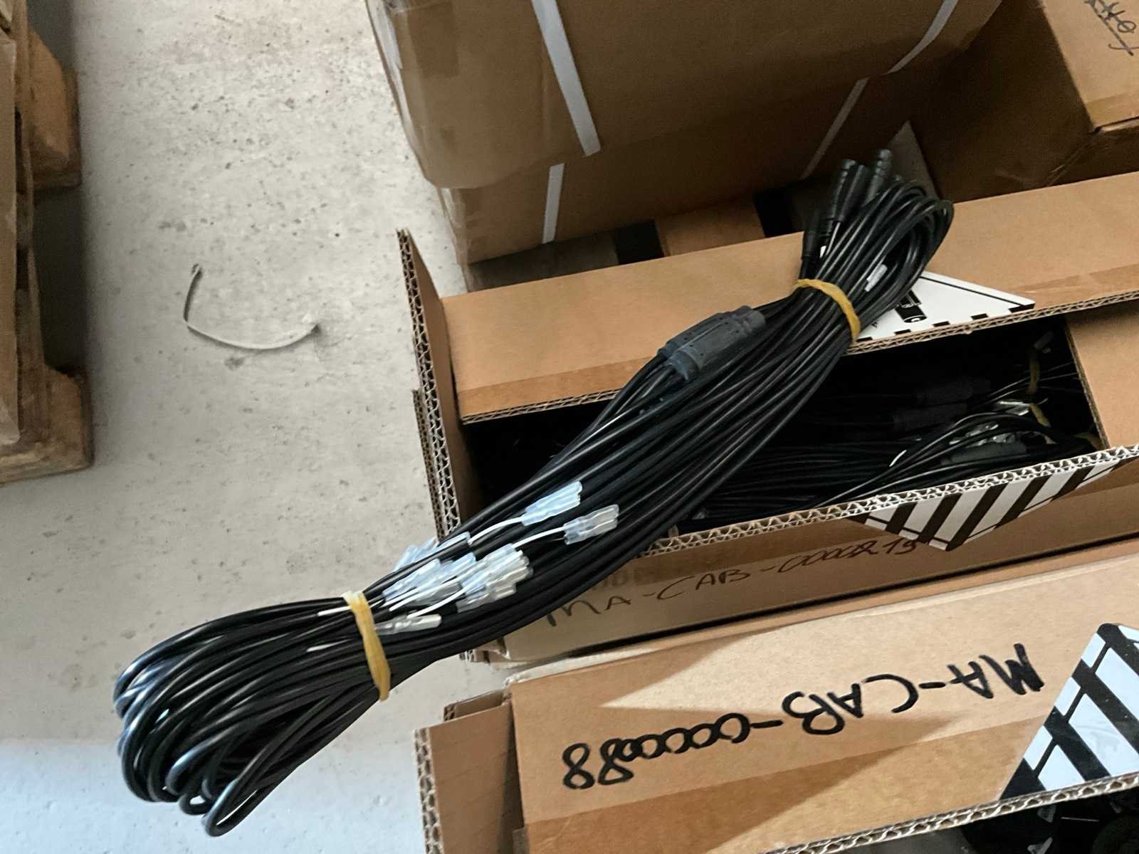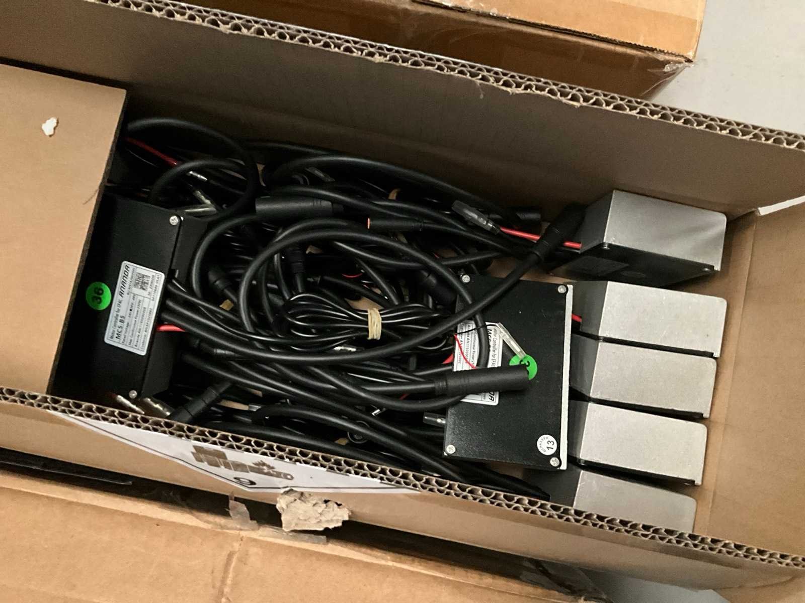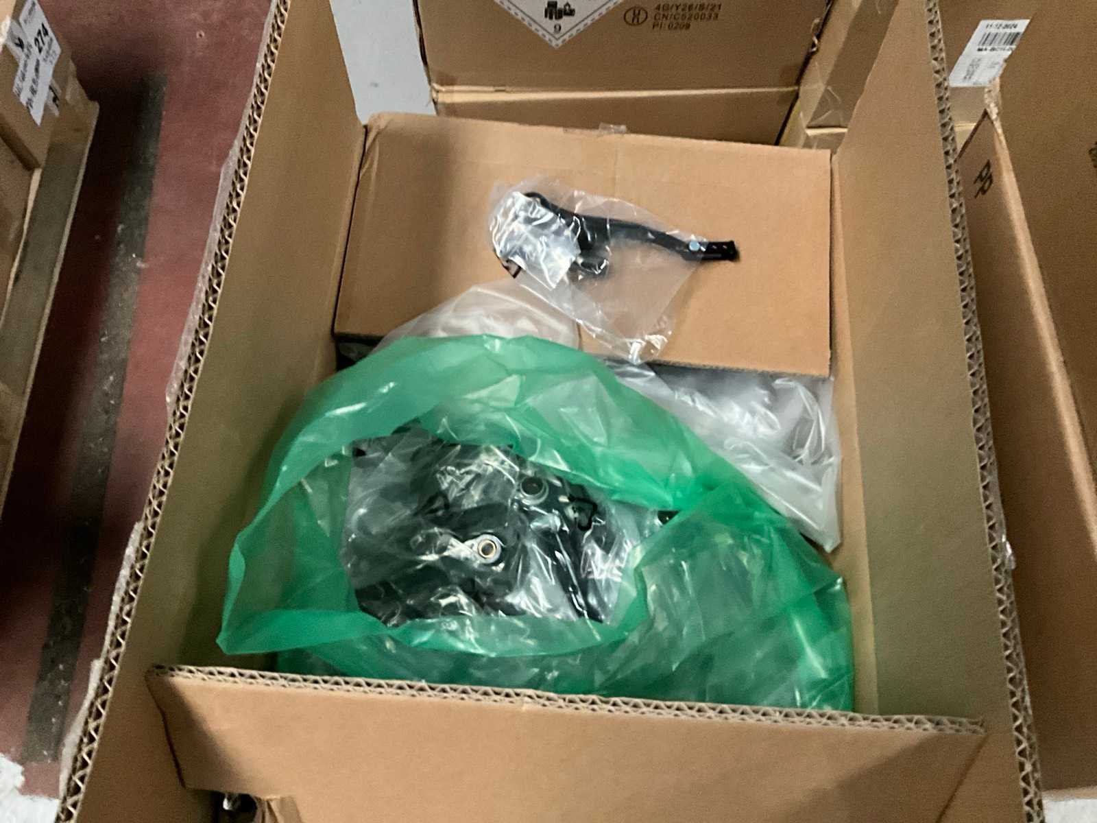 Bestaand uit 3x pallet met inhoud bestaande uit sensoren-bekabeling-batterij doc-in platen, 12x karton electro wielmotoren-6x karton middenmotoren-LI-ION batterijen type 4G/Y26/S/21 in 3x karton-2x karton opladers-7x karton wielremmen, enz.. No