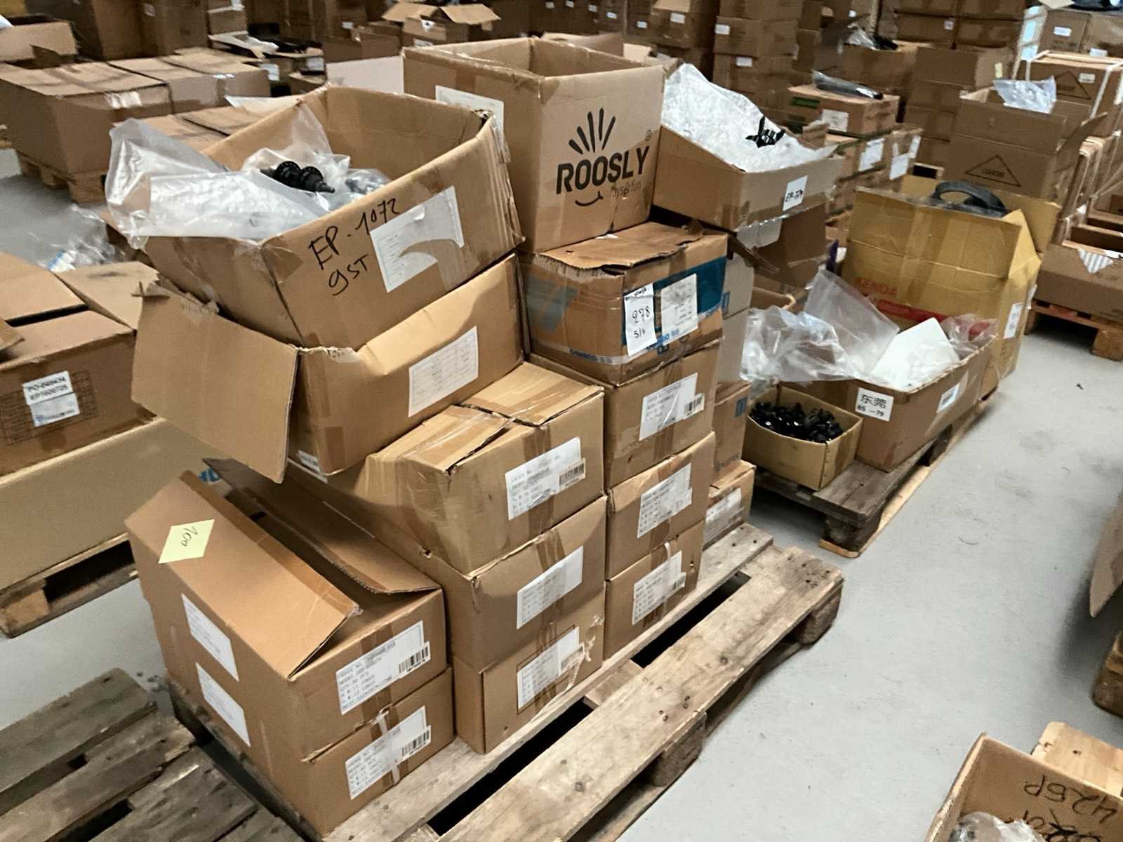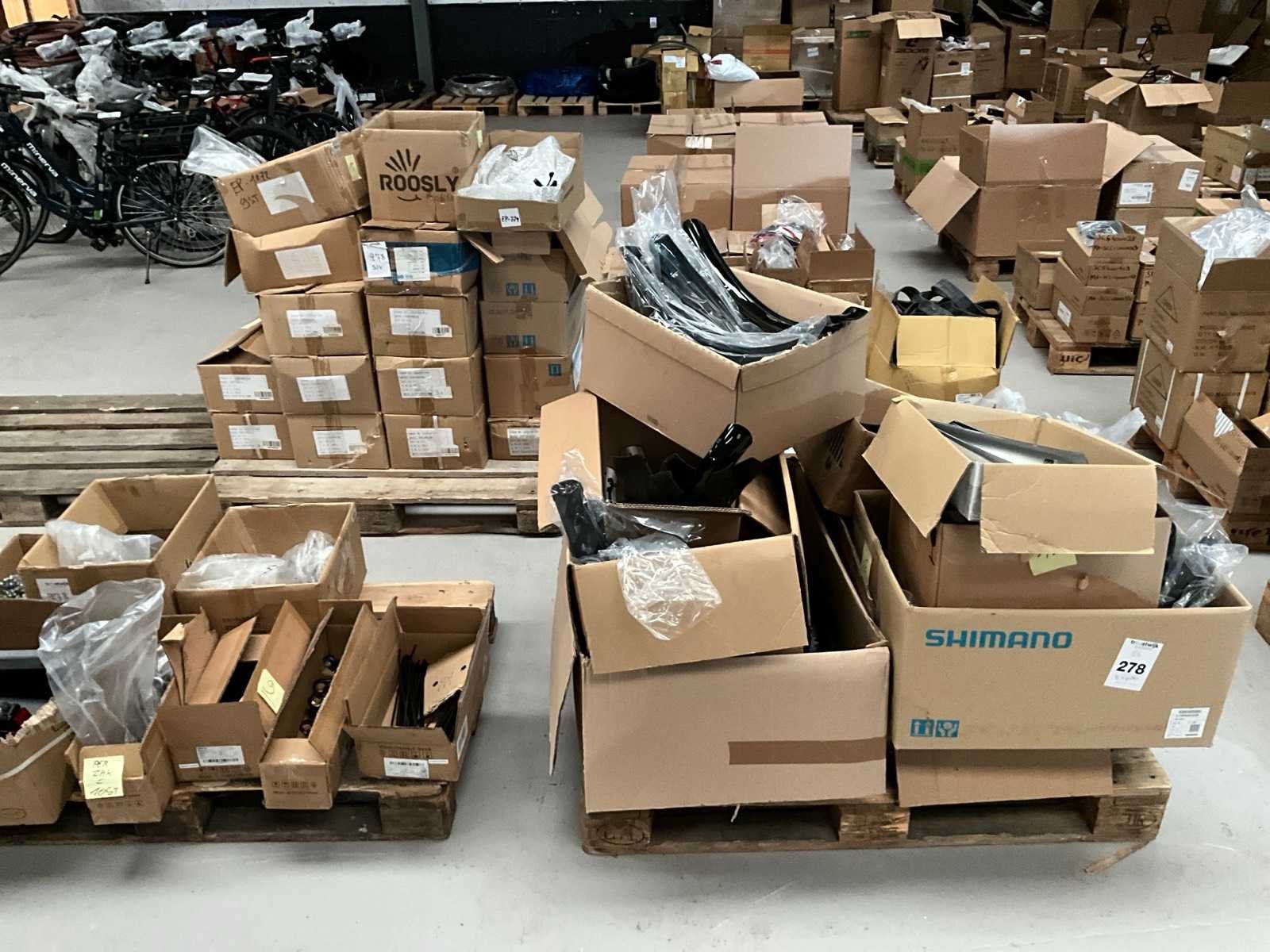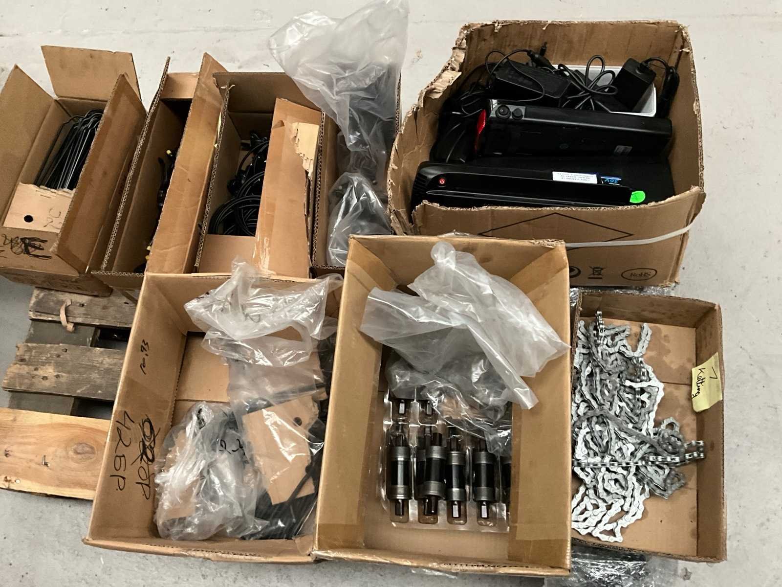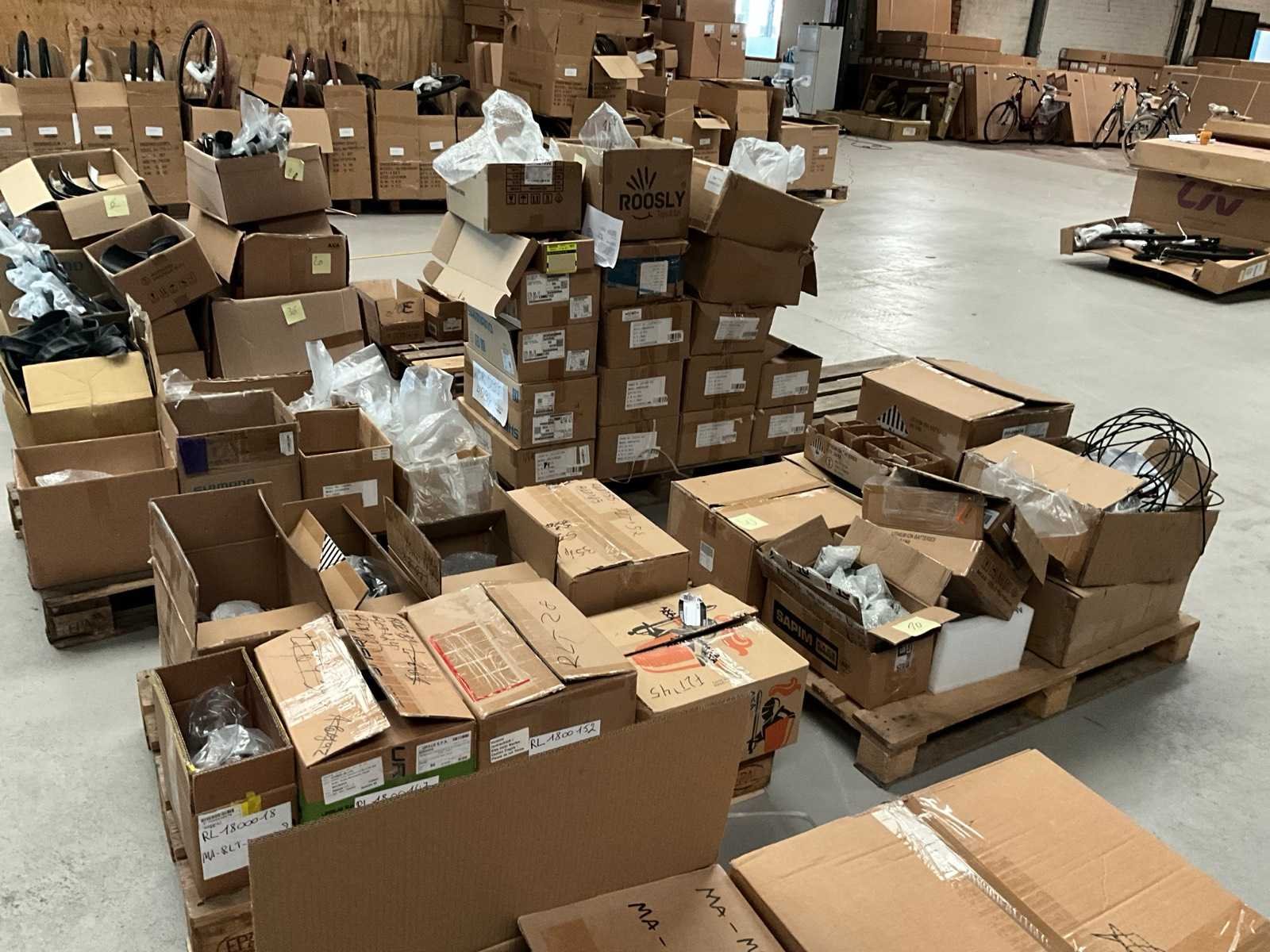 Bestaand uit 6x pallet met inhoud bestaande uit spatborden, hydraulische handremmen, wielnaven, tandwielen, versnellingsapparaten, binnenbanden, voor een achterlichten, enz… No