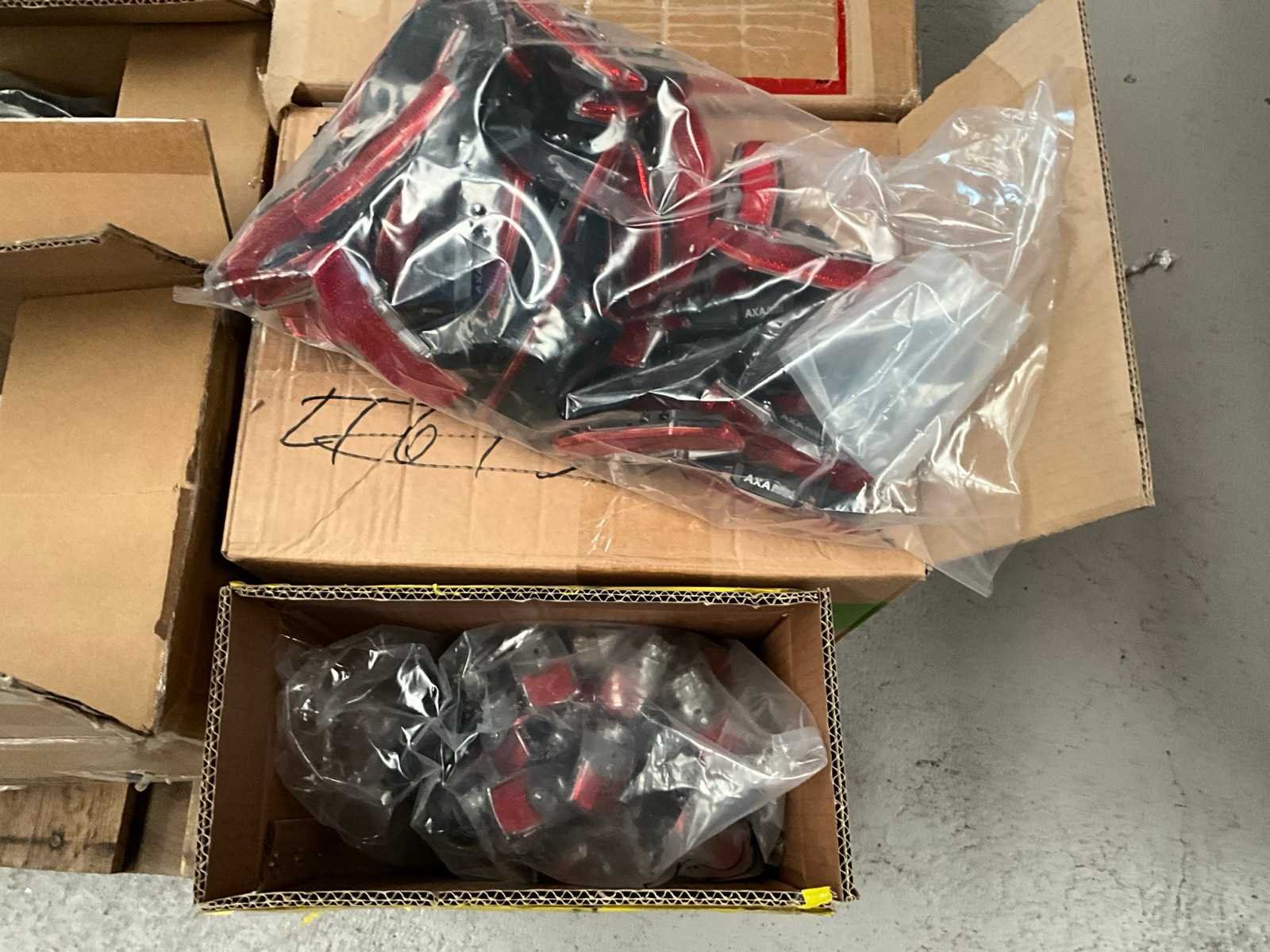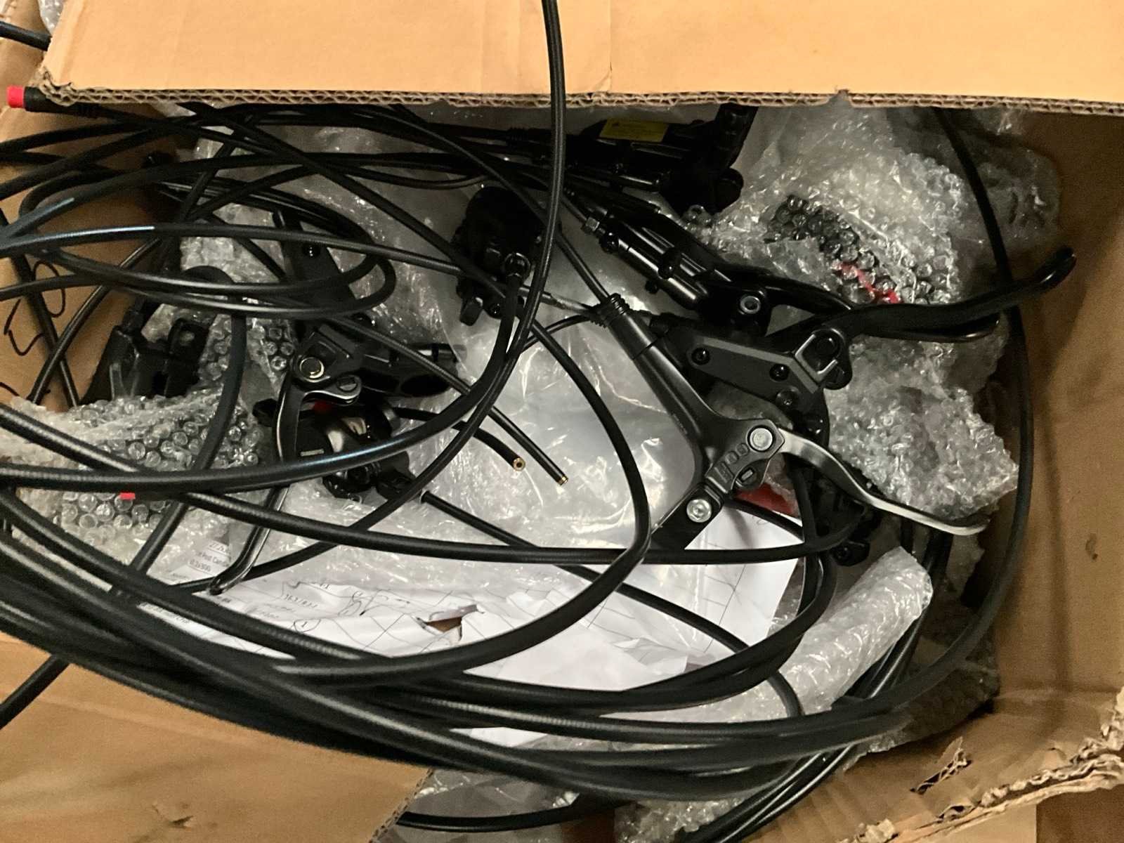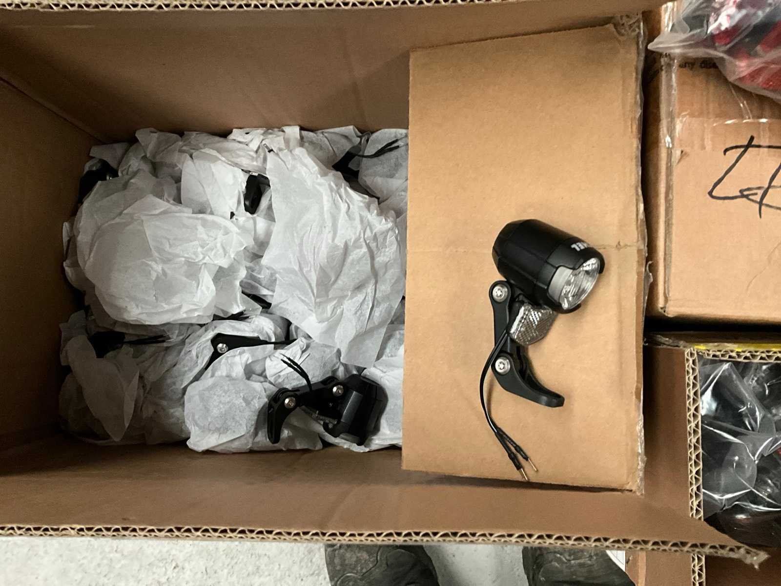 Bestaand uit 6x pallet met inhoud bestaande uit spatborden, hydraulische handremmen, wielnaven, tandwielen, versnellingsapparaten, binnenbanden, voor een achterlichten, enz… No