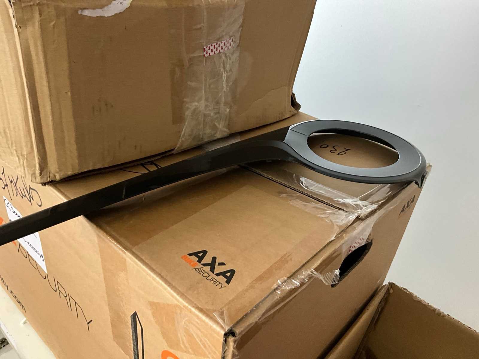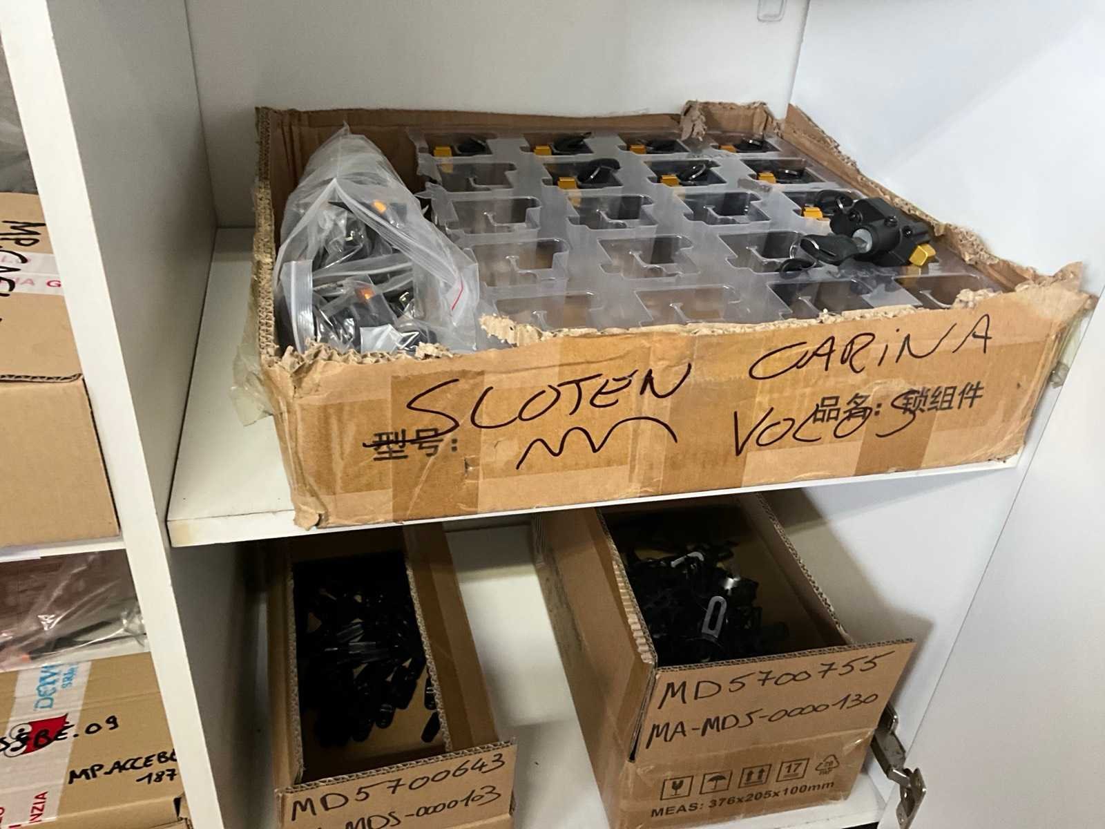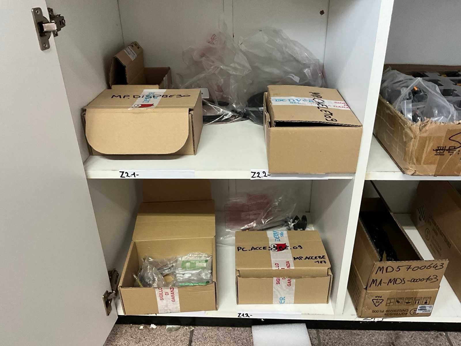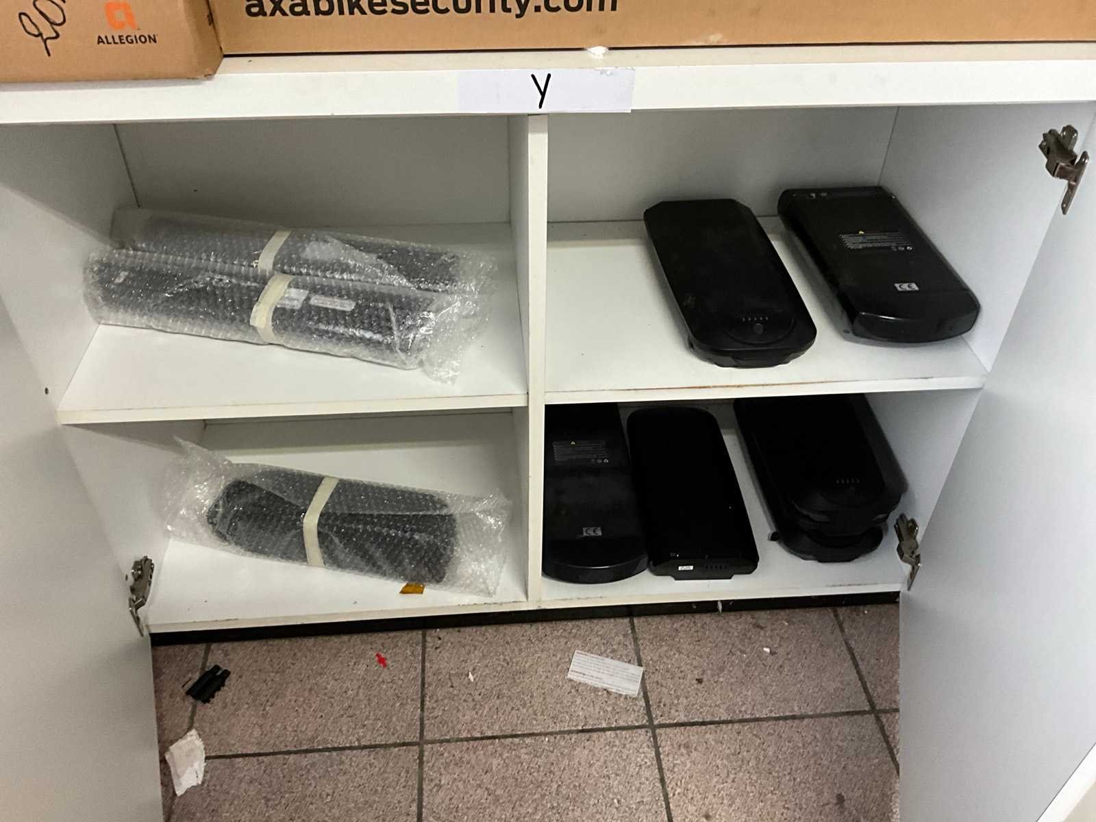 Bestaand uit tandwielen, remblokjes, verlichting, ketting bescherming, bedieningskastjes E-bike, wielsloten +circa 10 diverse fietsbatterijen, enz.., in en op lage kast nr 12+13 en in de midden ruimte No
