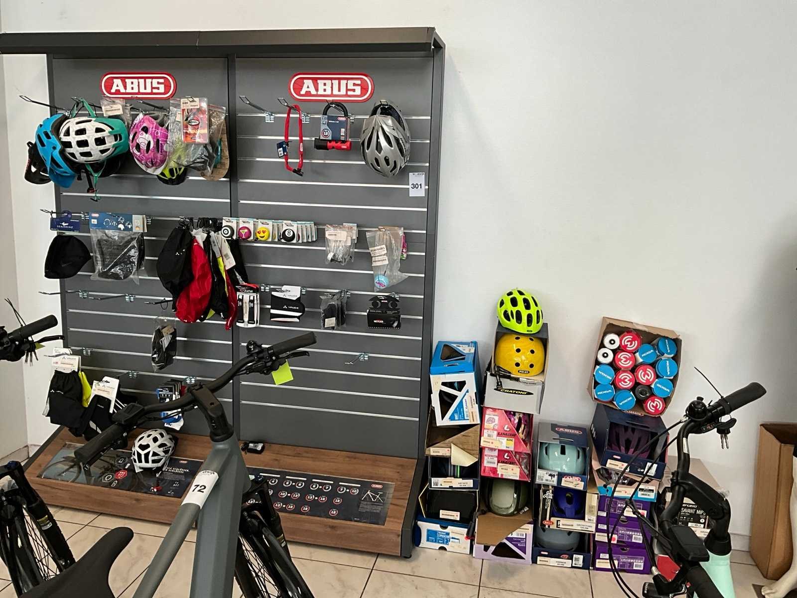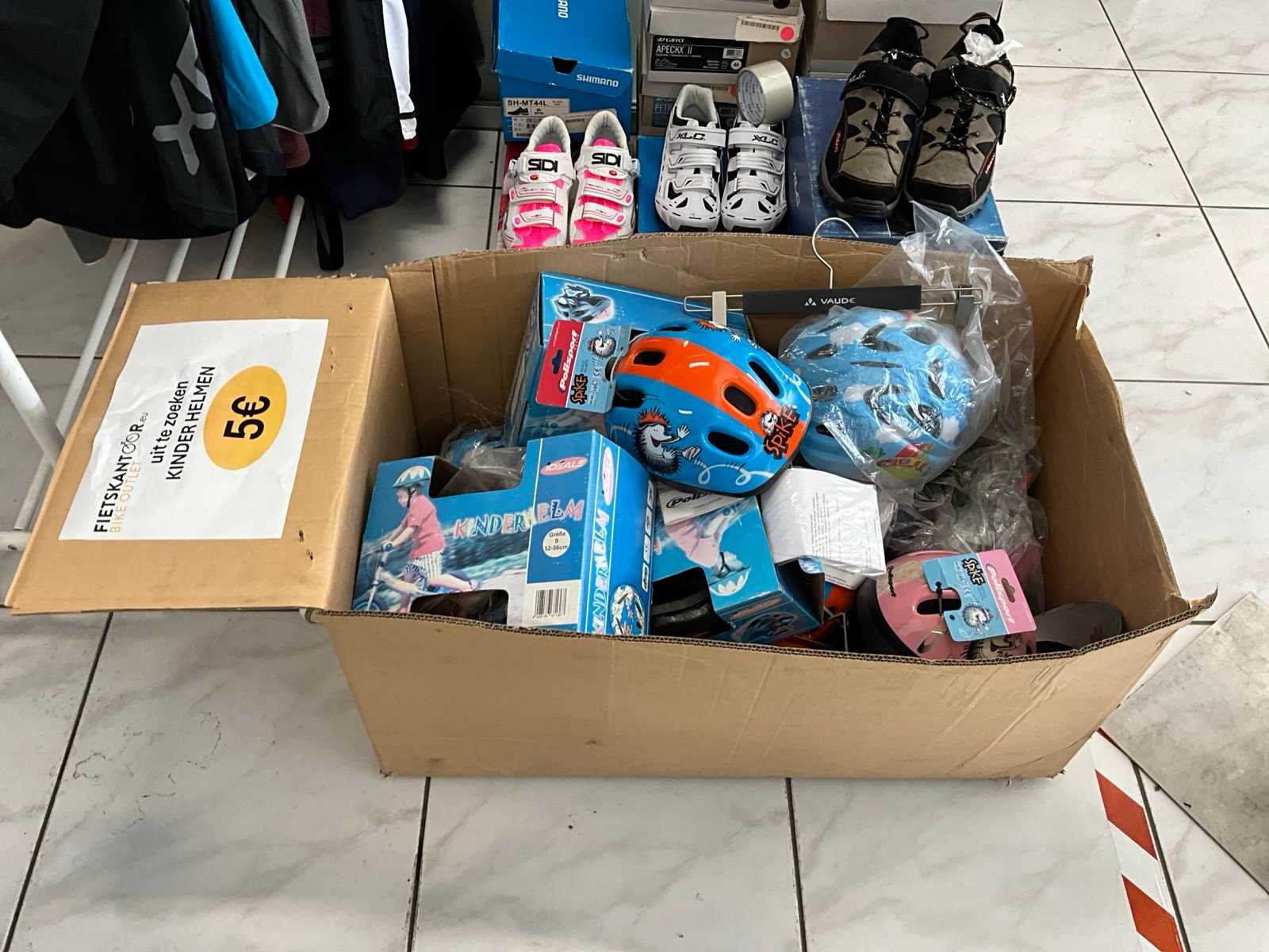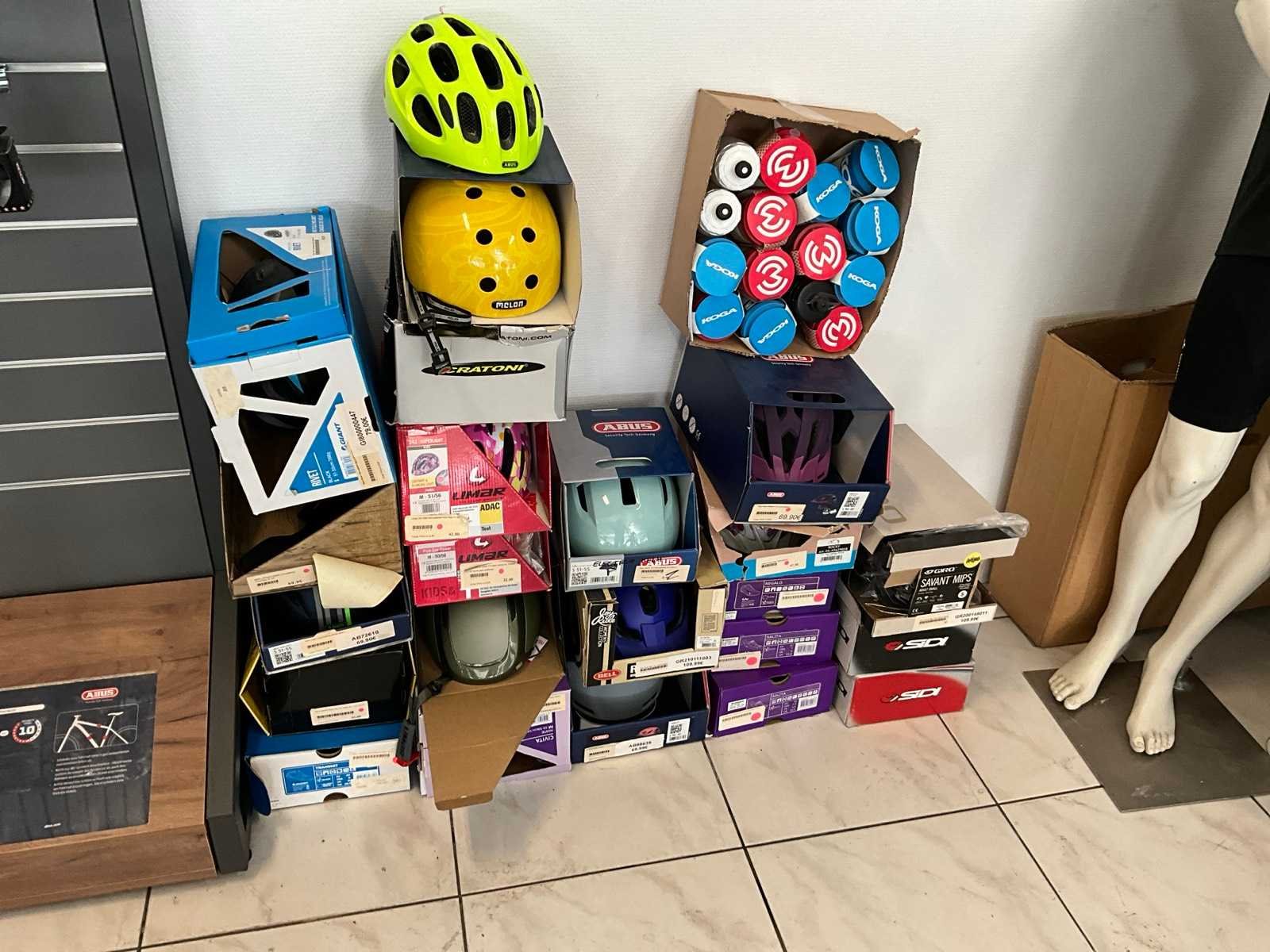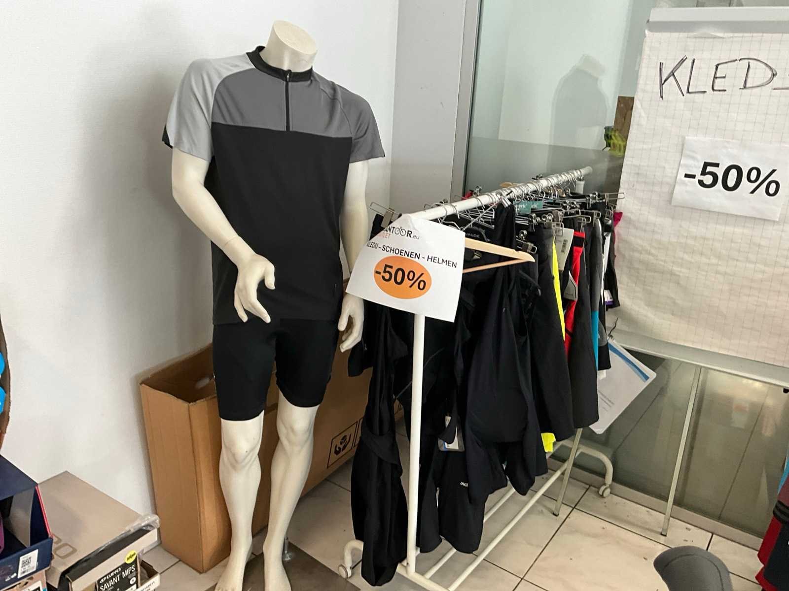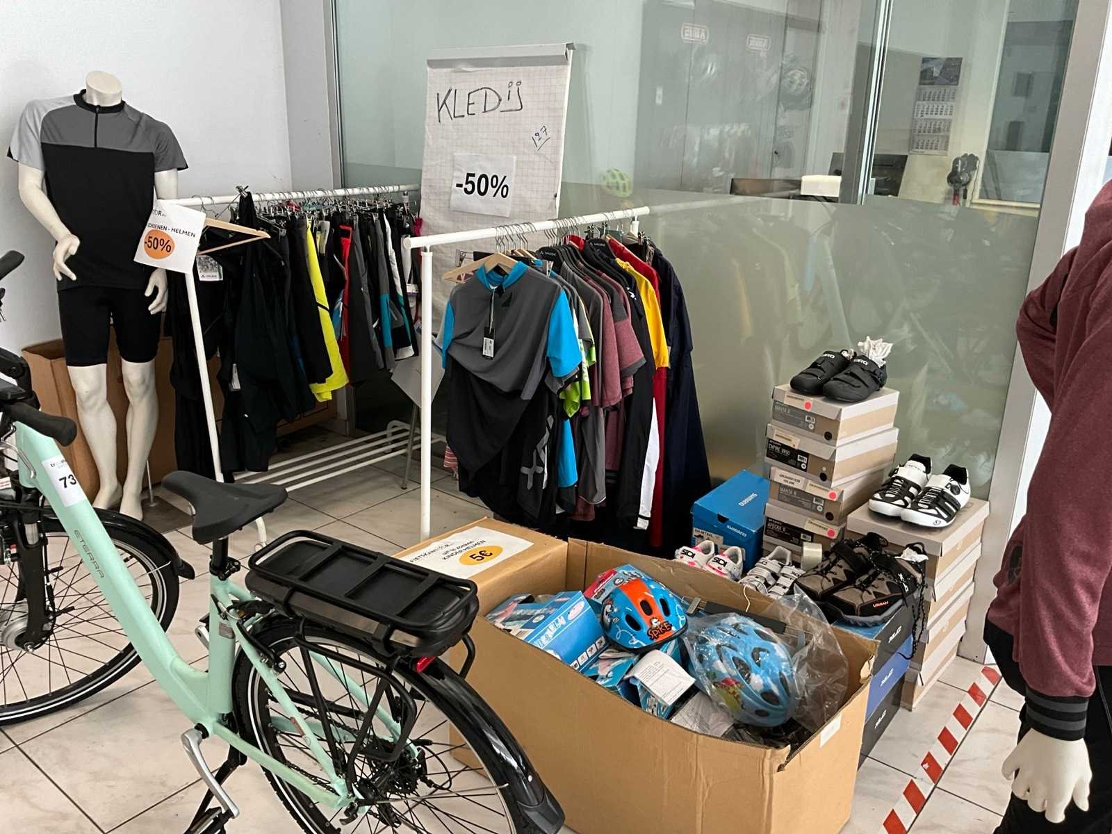 Bestaand uit 2x hangrekje met diverse fietskledij, +circa 15 fietsschoenen, circa 20 fietshelmen, 2x paspop, hangrek met inhoud No