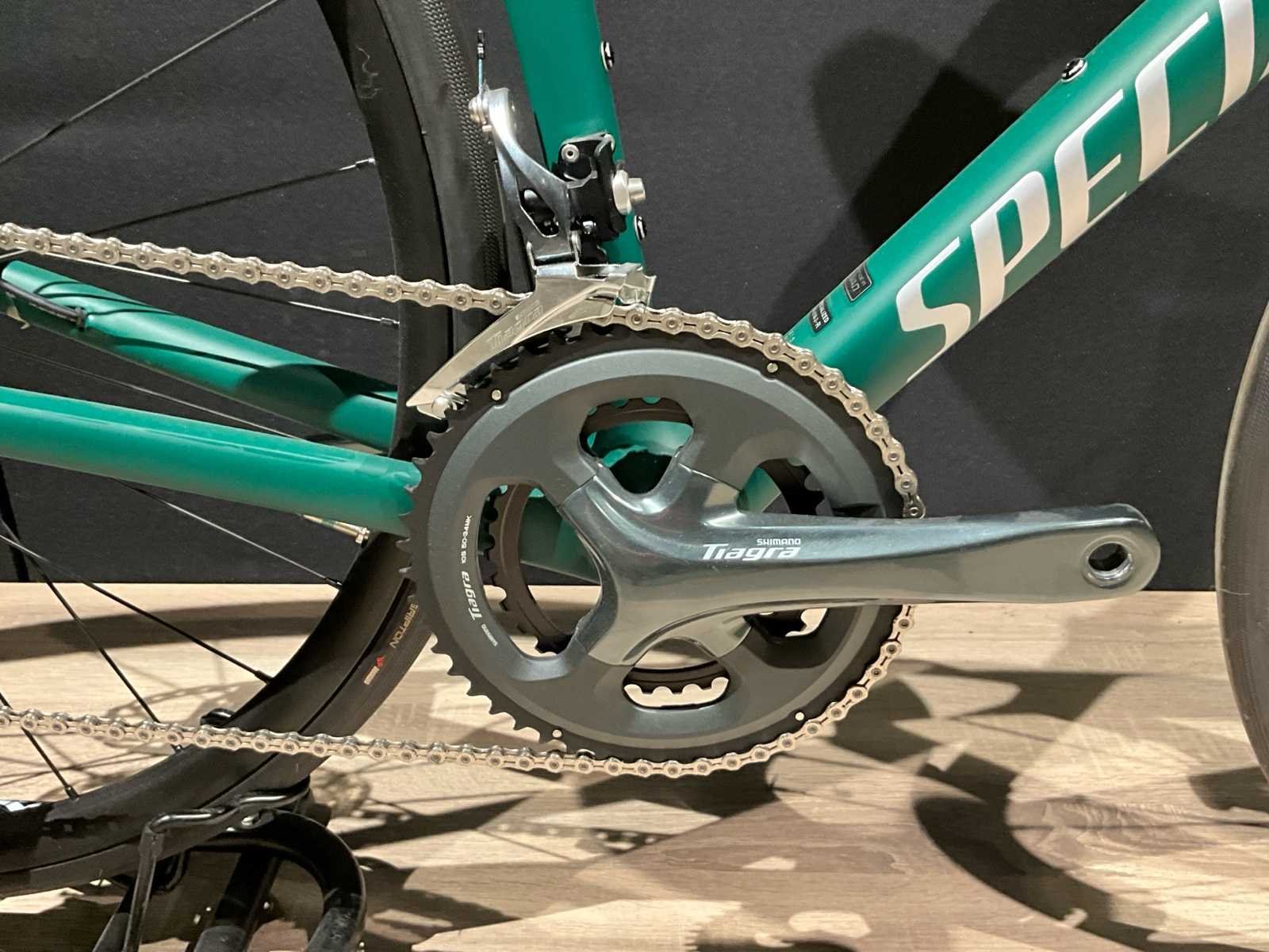 Nieuw en gemonteerd. Carbon frame / Shimano tiagra mechanisch 2x10sp / Aluminium wielset / Maat 44 Zie foto’s voor details. No Merk: Specialized Model: TARMAC SL6 PNGRN/LTSIL 44