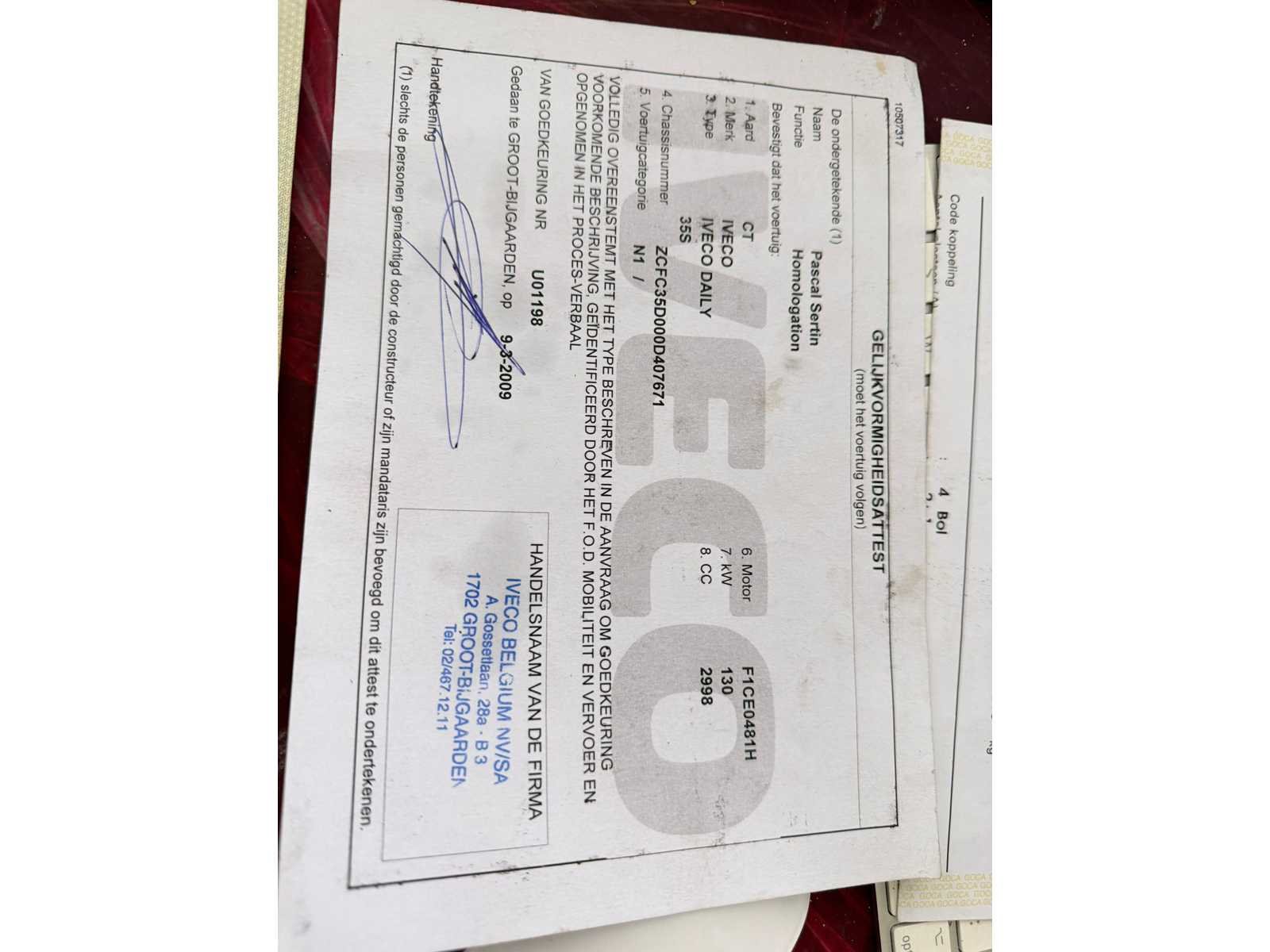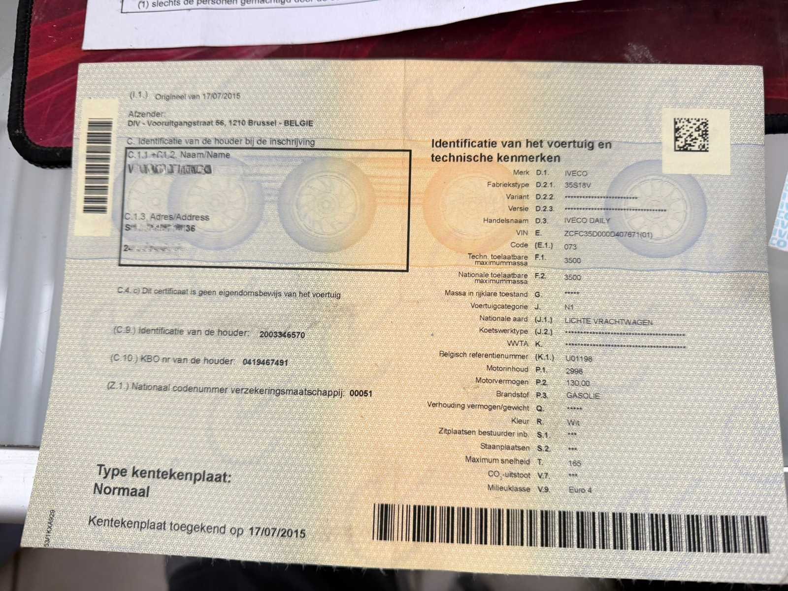 Iveco Daily in werkende staat (start en rijdt). Servoriem is defect; radiator dient gecontroleerd te worden. Inschrijvingsbewijs onvolledig: enkel deel 1 aanwezig, deel 2 ontbreekt. Certificaat van Overeenstemming (COC) aanwezig. Wordt verkocht in de staat dat deze zich bevind. Nee Merk: Iveco Type: Daily 3.0 HTP 35S18 Bouwjaar: 2009 Chassisnummer: ZCFC35D000D407671 Afgelezen kilometerstand: 339413km Vermogen (kW): 130kW Brandstof: diesel Transmissie: Handgeschakeld Nationaliteit documenten: België Energielabel: Euro 4