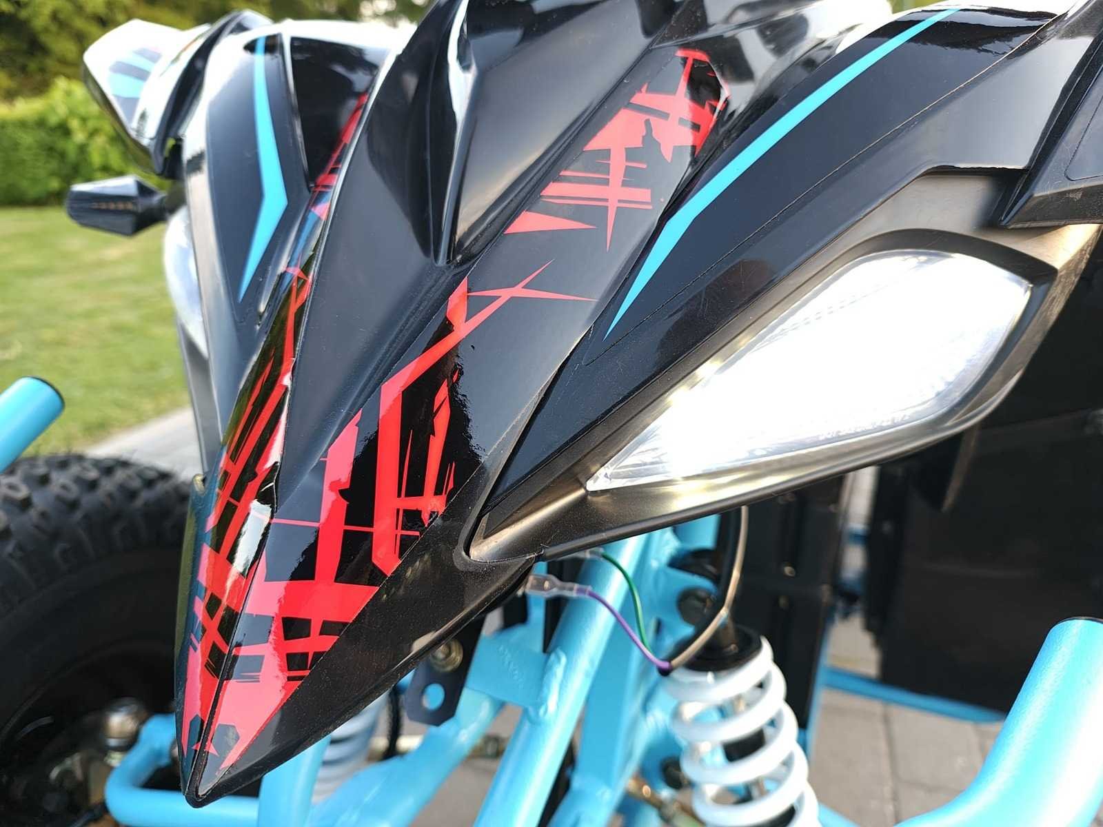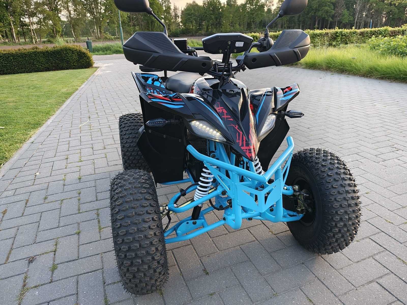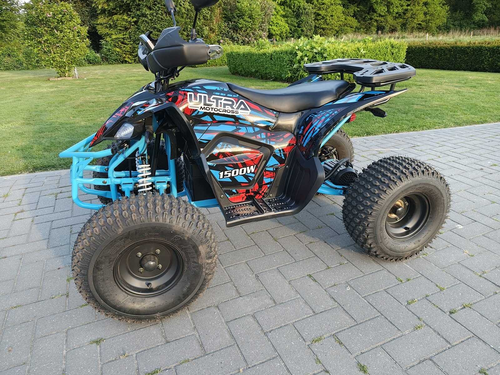 Leeftijd: ca. 5-18 jaar Aantal personen: 1-persoons Maximum snelheid: 50 km/h Maximale belasting: 110 kg Voltage: 60V Wattage: 1500W Begrenzer: Ja – 10 km/h, 25 km/h, 50 km/h Transmissie: Vooruit, achteruit en neutraal Aandrijving: Brushless direct op de achteras Remsysteem voor: Geperforeerde schijfremmen Remsysteem achter: Geperforeerde schijfremmen Type banden: Rubberen luchtbanden Vering: Voor + Achter Claxon Verlichting: Voor + Achter Zithoogte vanaf de vloer: 78 cm Afmeting quad: 169 x 98 x 119 cm Gewicht quad: 128 kg Nee Merk: Ultra Motocross Model: ATV 1500w Aantal sleutels: 2 Afgelezen kilometerstand: 0km Brandstof: Elektrisch Kleur: Blauw zwart