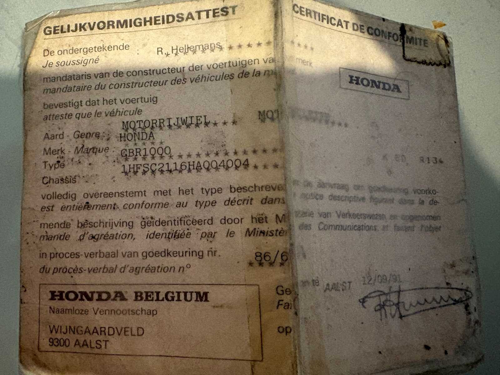 Moter staat al tijd stil belgie papieren met gelijkvomings attest No Merk: Honda Model: cbr Type: 1000 fire blade Brandstof: benzine Datum eerste toelating: 1973 Handelsbenaming: honda Nationaliteit documenten: belgie Boorddocumenten aanwezig?: true Startinformatie: nee Self drive export possible : true