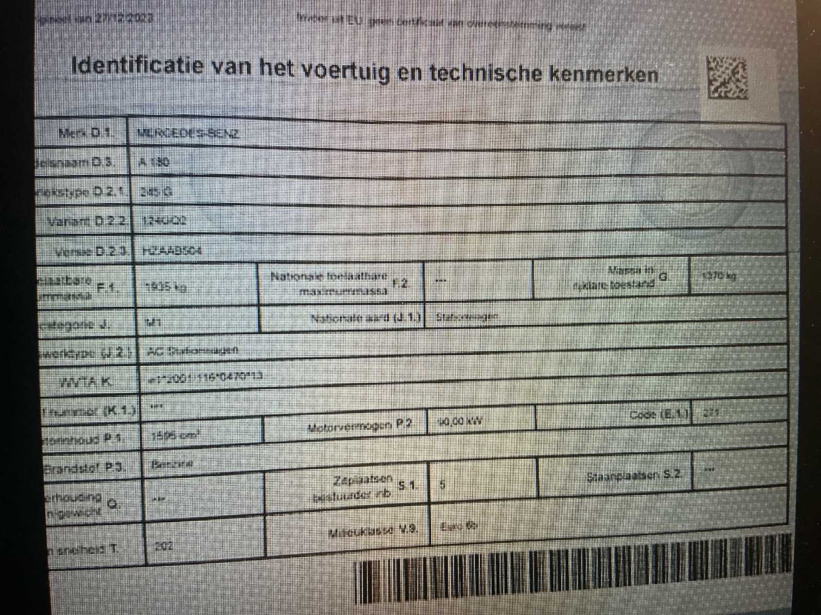 Zeer nette wagen, inschrijven, starten en rijden. Wagen wordt steeds gekeurd voor verkoop. No Merk: Mercedes Model: A180 Type: Hatchback Bouwjaar: 2015 Afgelezen kilometerstand: 147602km Cilinderinhoud: 1595cc Vermogen (kW): 90kW Brandstof: Benzine Chassisnummer: WD01760421J391030(01) Datum eerste toelating: 16/06/2015 Vermogen (pk): 122hp Energielabel: B Aandrijving: Voorwielaandrijving Aantal zitplaatsen: 5 Kleur: Grijs Transmissie: Handgeschakeld Stuurwiel: Links Emissieklasse: Euro6 Aantal deuren: 5 Aantal sleutels: 2 Ledig gewicht: 1370kg Aantal cilinders: 4 Nationaliteit documenten: België Gelijkvormigheidsattest aanwezig: true Carpass: true Start en rijdt: Ok Keuringsrapport geldig tot: 03/11/2025 Andere boorddocumenten: Keuringsbewijs Vavato voert geen technische keuring uit.: true Airconditioning: true Navigatie: true Inschrijvingsbewijs - deel 1 : Aanwezig Inschrijvingsbewijs - deel 2: Aanwezig