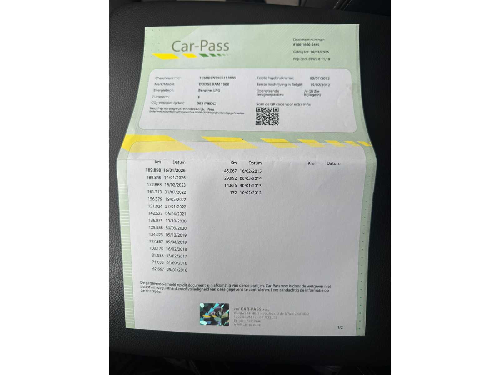 Heeft achtercamera. Nee Merk: Dodge Model: RAM Type: 1500 Bouwjaar: 2012 Afgelezen kilometerstand: 190000km Cilinderinhoud: 5654cc Vermogen (kW): 291kW Brandstof: Lpg, benzine Chassisnummer: 1C6RD7NT9CS113985 Datum eerste toelating: 03/01/2012 Aantal zitplaatsen: 5 Transmissie: Automaat Emissieklasse: Euro 6 Aantal deuren: 5 Nationaliteit documenten: Belgisch Carpass: true Start en rijdt: Ja Keuringsrapport geldig tot: 14/01/2027 startinformatie : Start & rijdt Vavato voert geen technische keuring uit.: true Airconditioning: true Navigatie: true Leder bekleed: true Inschrijvingsbewijs - deel 1 : Aanwezig Inschrijvingsbewijs - deel 2: Aanwezig