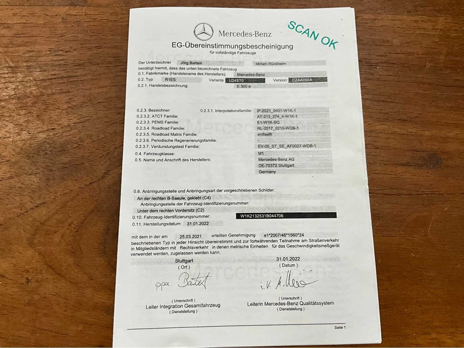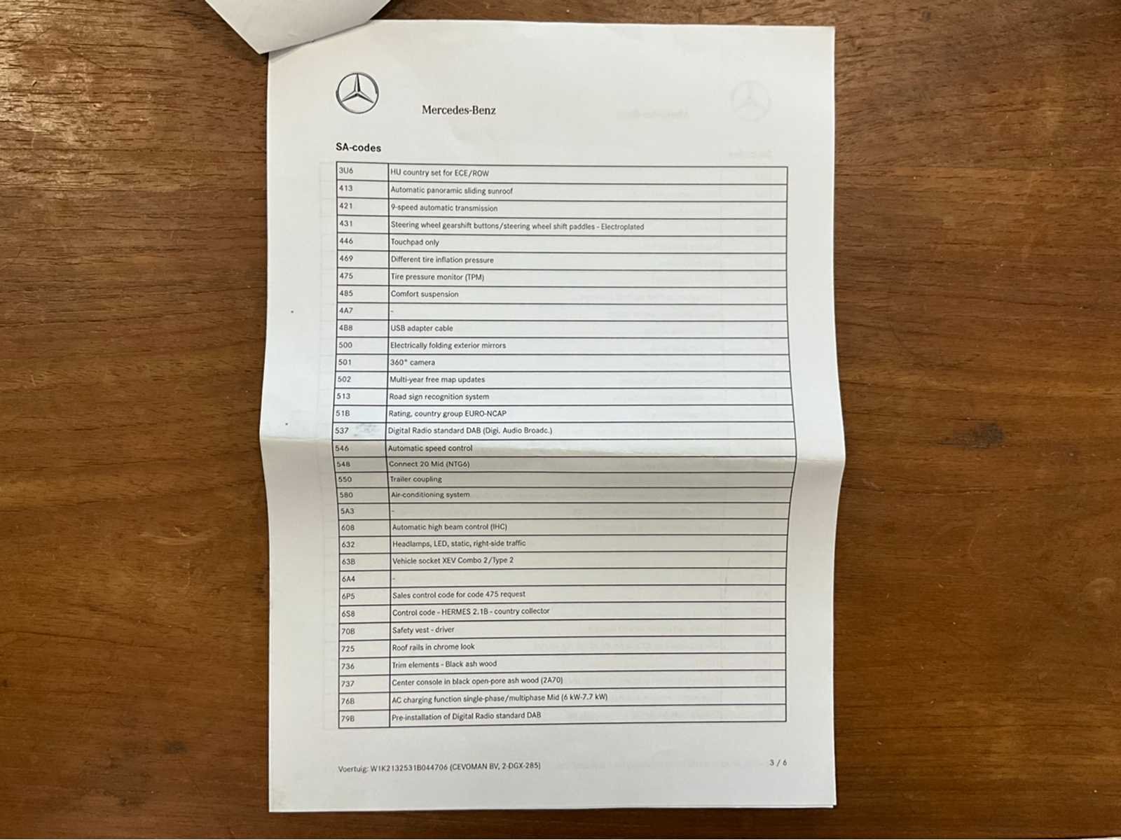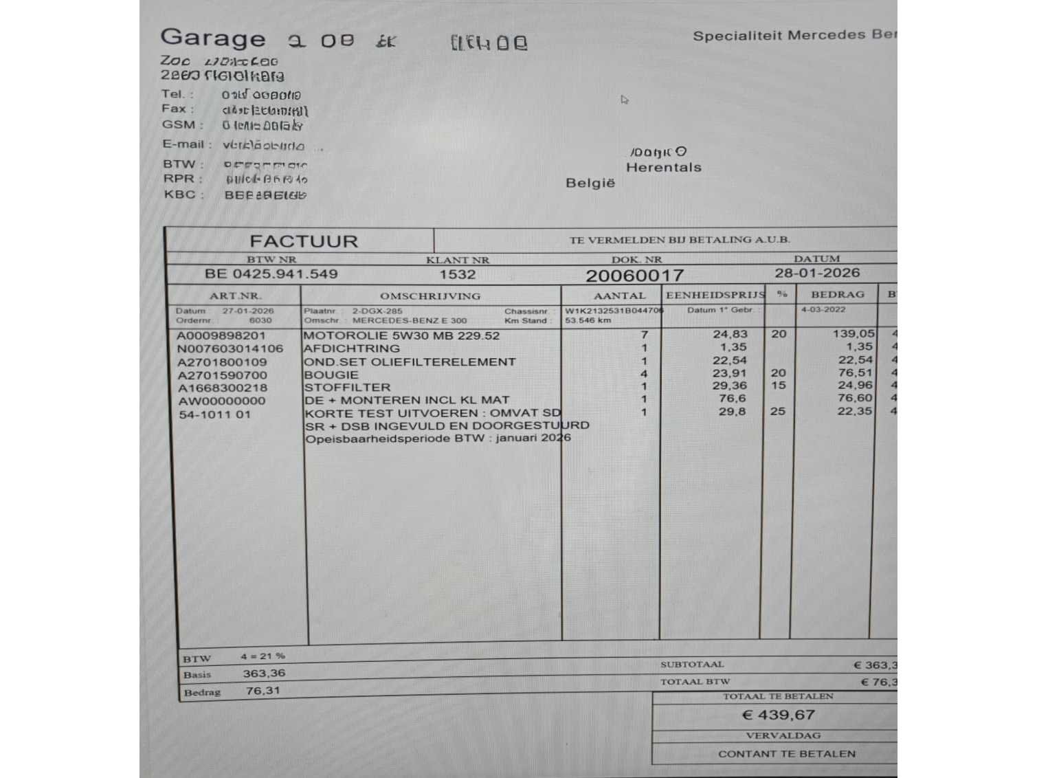 Uitzonderlijk rijk uitgeruste Mercedes-Benz E 300 e Plug-in Hybrid in topstaat met slechts 53.000 km en volledige Mercedes-dealerhistoriek. Wagen is afkomstig van eerste eigenaar (Mercedes-Benz) en werd steeds officieel onderhouden. Laatste onderhoud is zeer recent uitgevoerd. Deze E-Klasse combineert elektrische efficiëntie met hoogstaand comfort en een zeer uitgebreid optiepakket: panoramisch schuifdak, Driving Assistant Plus, Distronic, 360° camera, premium sound, MBUX Navigation Plus, smartphone-integratie en nog veel meer. Carrosserie kreeg één jaar geleden een professionele coating — lak in zeer mooie staat. Perfect als representatieve zakenwagen of luxe gezinswagen met lage gebruikskosten dankzij plug-in hybrid technologie - 🚗 Driving Assistant Package Plus DISTRONIC PLUS adaptieve cruise control Active Stop & Go Assist Actieve parkeerassistent Route based speed adaptation Verkeersbordherkenning Uitgebreide rijassistentie 🅿️ Parking Package High 360° camera Active Parking Assist Parkeerhulp rondom 🛋️ Interior Luxury & Ergonomics Package Comfortstoelen Lendensteunverstelling Zetelverwarming voor Luxe lederen stuur Sfeerverlichting premium 🎵 Premium Sound System High-end audiosysteem (premium klasse) - Comfort & exterieur: Panoramisch glazen schuifdak Avantgarde exterieurpakket LED koplampen Automatische grootlichtassistent Donker getint glas Elektrisch inklapbare spiegels Automatisch dimmende spiegels Comfortophanging Agility Select rijmodi Trekhaak (fabrieksoptie) Dakrails (chrome look) Actieve motorkap (voetgangersbescherming) - LAADKABEL INBEGREPEN - HISTORIEK: ✅ Eerste eigenaar: Mercedes-Benz ✅ Altijd dealeronderhouden ✅ Digitaal serviceverslag aanwezig ✅ Laatste onderhoud januari 2026 - zie factuur (laatste foto): Motorolie 5W30 MB 229.52, nieuwe afdichting, oliefilter, alle bougies vernieuwd, brandstoffilter vervangen, elektronisch nagekeken, alle vloeistoffen vervangen No Merk: Mercedes-Benz Model: E300 Bouwjaar: 2022 Afgelezen kilometerstand: 53000km Cilinderinhoud: 1991cc Vermogen (kW): 155kW Brandstof: hybride (elektrisch+benzine) Chassisnummer: W1K2132531B044706 Datum eerste toelating: 4/3/2022 Aantal zitplaatsen: 5 Kleur: Obsidian Black metallic Transmissie: Automaat Emissieklasse: Euro 6d Aantal deuren: 5 Aantal sleutels: 2 Nationaliteit documenten: B Start en rijdt: ja Keuringsrapport geldig tot: 4/3/2026 Vavato voert geen technische keuring uit.: true Airconditioning: true Navigatie: true LED-koplampen: true Leder bekleed: true Inschrijvingsbewijs - deel 1 : Aanwezig Inschrijvingsbewijs - deel 2: Aanwezig