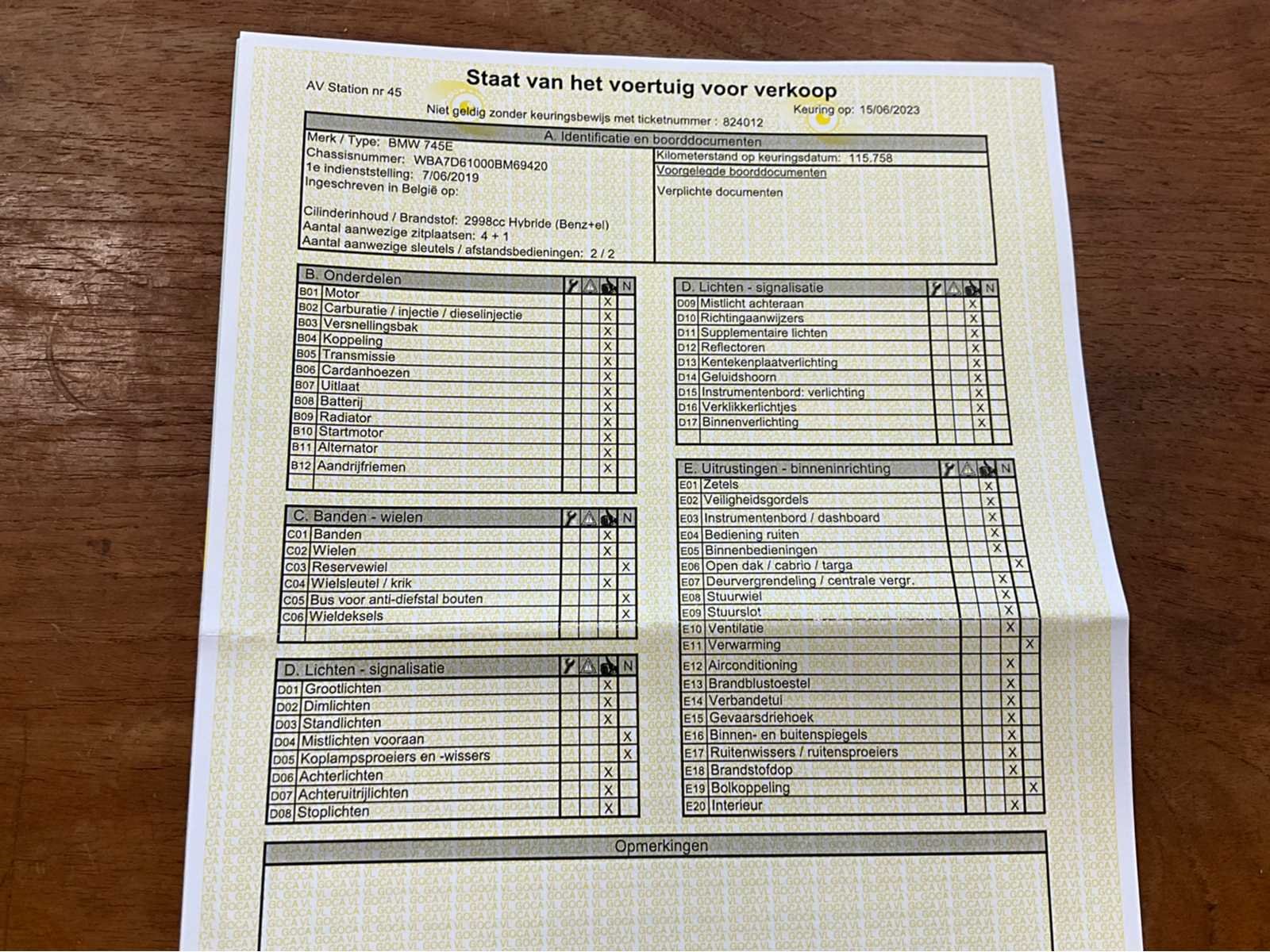 Een uitzonderlijk complete executive limousine met innovatieve plug-in hybrid technologie, hoog comfort, exclusieve inrichting en een zeer rijk optiepakket. Deze 7-Reeks biedt dat wat een hoogwaardige topklasse BMW zo begeerlijk maakt: imposante presence, verfijnde luxe en intelligente technologie — perfect als representatieve zakenwagen of comfortabele reisauto - EXTERIEUR: Kleur: Amandinbraun Metallic, Velgen: 19” BMW lichtmetalen velgen (sportief en elegant), BMW Laserlicht – ultra heldere en efficiënte koplampen, Soft-close deuren – deuren sluiten geruisloos en luxe, Pure Excellence designlijn, Ronde Pirelli / Bridgestone banden (goede profieldiepte) - INTERIEUR: Nappa leder “Mokka” met hoogwaardige afwerkingen, Volledig elektrisch verstelbare comfortstoelen voor, Massagefunctie voorstoelen, Lederbekleed dashboard, Ambient lighting (interieur sfeerverlichting), Doorlaadsysteem voor maximum bagageruimte, Hoofdsteunen met extra comfort, Elektrisch panoramadak (schuif- en kantelfunctie), Klimaatcomfort met meerdere zones, Ergonomische stoelen met memoryfunctie - TECHNOLOGIE: BMW Head-Up Display – rijinformatie in ooghoek, BMW Gesture Control – bediening met handgebaren, WLAN Hotspot + DAB-Tuner, Groot media- en navigatiescherm, BMW Display Key, Digital Instrument Cluster, Volledig digitaal infotainmentsysteem, Bluetooth / smartphone integratie, Voice control / spraakopdrachten - RIJHULP & VEILIGHEID (FULL ASSISTANCE): Driving Assistant Professional – activerende assistentiesystemen, Parking Assistant Plus met camera- en parkeersensoren, Rijstrookassistent, Grootlichtassistent, Adaptieve cruise / afstandsregelaar, Verkeersbordherkenning Alarminstallatie, Elektrische parkeerrem, Stabiliteits- en tractiecontrole, Airbagsystemen compleet - steeds onderhouden bij officiële BMW-dealer (historiek digitaal op te vragen), laatste onderhoud op 126951km, geen foutmeldingen op dashboard, ook niet bij het laden - LAADKABEL INBEGREPEN No Merk: BMW Model: 745E Type: sedan Bouwjaar: 2019 Afgelezen kilometerstand: 145000km Cilinderinhoud: 2998cc Vermogen (kW): 210kW Brandstof: hybride (elektrisch+benzine) Chassisnummer: WBA7D61000BM69420 Datum eerste toelating: 7/6/2019 Aantal zitplaatsen: 5 Kleur: Amandinbraun Metallic Transmissie: automaat Emissieklasse: Euro 6d Aantal deuren: 5 Aantal sleutels: 2 Ledig gewicht: 2070kg Nationaliteit documenten: B Onderhoudshistorie: ja Start en rijdt: ja Keuringsrapport geldig tot: 15/6/2026 Zichtbare schade: nee Vavato voert geen technische keuring uit.: true Airconditioning: true Navigatie: true Xenon verlichting: false Leder bekleed: true Inschrijvingsbewijs - deel 1 : Aanwezig Inschrijvingsbewijs - deel 2: Aanwezig