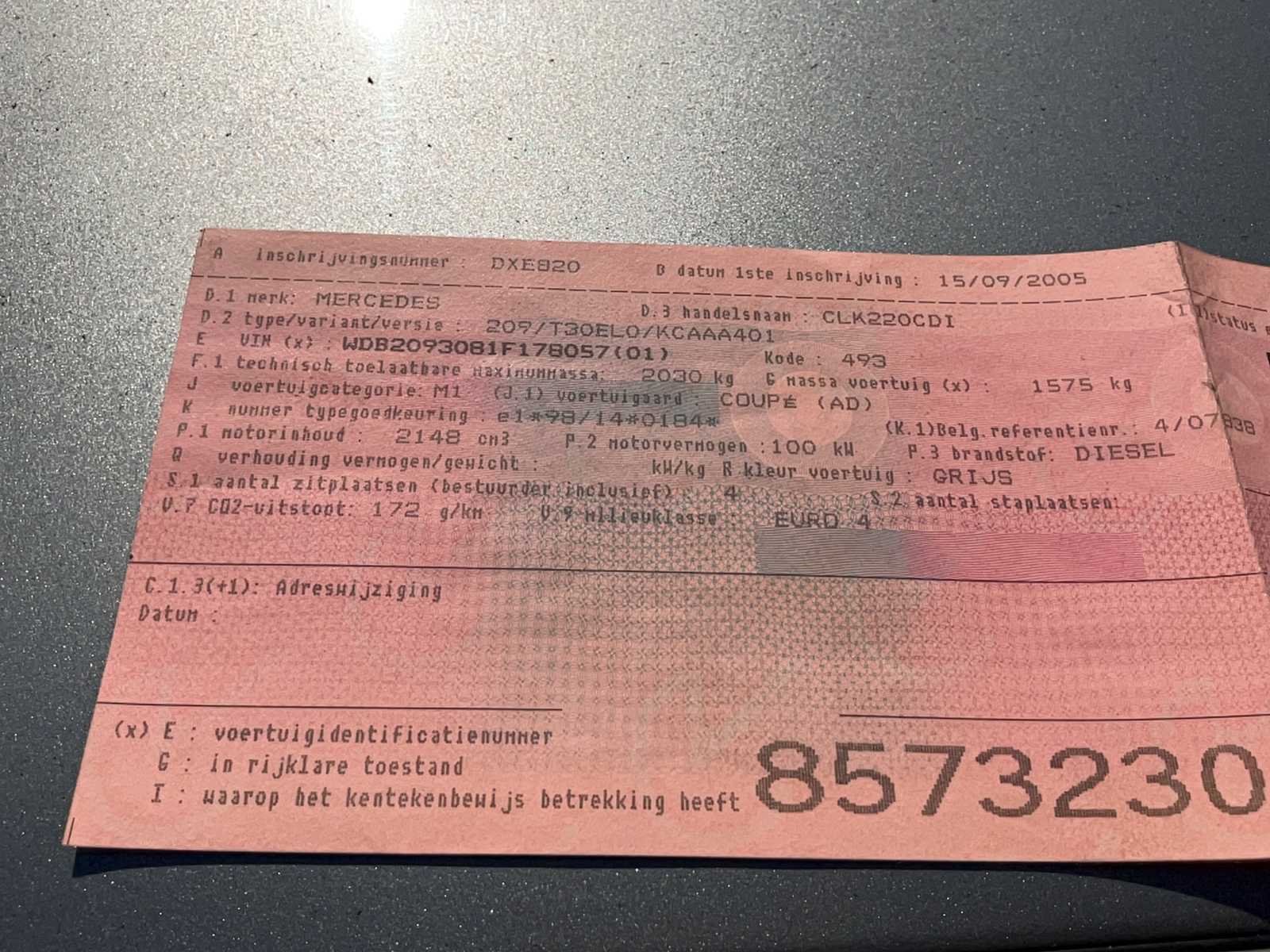 Voertuiggegevens: • Merk: Mercedes-Benz • Model: CLK 220 CDI Coupé • Type / variant / versie: 209/T3OEL0/KCAAA401 • Handelsnaam: CLK220CDI • VIN (chassisnummer): WDB2093081F78057(01) • Eerste inschrijving: 15/09/2005 • Technisch toegelaten maximummassa: 2.030 kg • Massa ledig voertuig: 1.575 kg • Voertuigcategorie: M1 (personenauto) • Koetswerk: Coupé (AD) • Nummer typegoedkeuring: e198/140148*04 • Motorinhoud: 2.148 cm³ • Motorvermogen: 100 kW (≈ 136 pk) • Brandstof: Diesel • Verhouding vermogen/gewicht: 63,49 kW/ton • Kleur: Grijs • Aantal zitplaatsen: 4 • CO₂-uitstoot: 172 g/km • Emissieklasse: Euro 4 Nee Merk: Mercedes-Benz Model: CLK 220 CDI Coupé Bouwjaar: 2005 Cilinderinhoud: 2148cc Vermogen (kW): 100kW Chassisnummer: WDB2093081F78057 Vermogen (pk): 136hp Aantal zitplaatsen: 4 Stuurwiel: Links Emissieklasse: 4 Aantal deuren: 2 Aantal sleutels: 2 Nationaliteit documenten: Belg CO2-uitstoot NEDC: 1724 Gelijkvormigheidsattest aanwezig: true Start en rijdt: Ja Vavato voert geen technische keuring uit.: true Inschrijvingsbewijs - deel 1 : Aanwezig Inschrijvingsbewijs - deel 2: Aanwezig