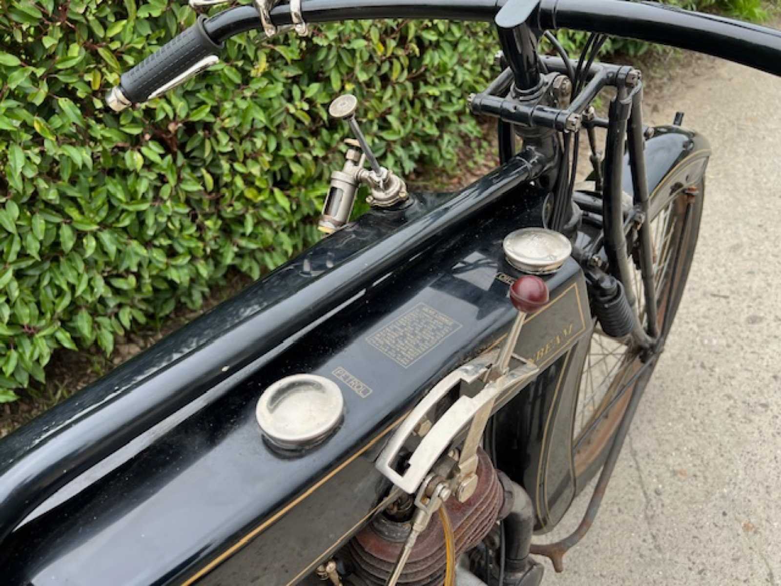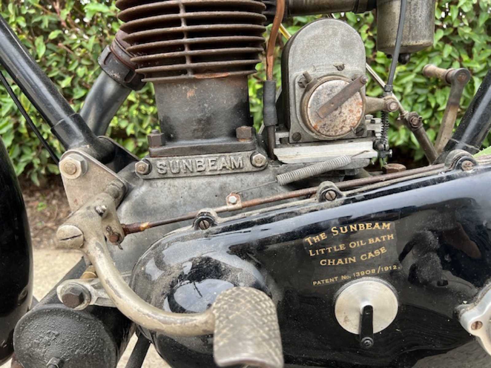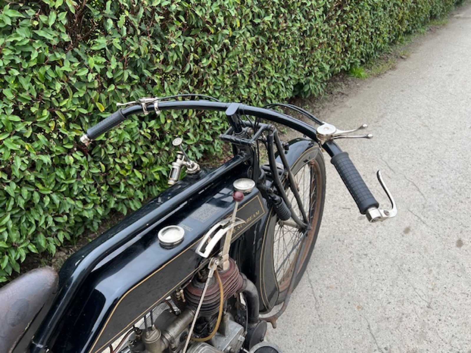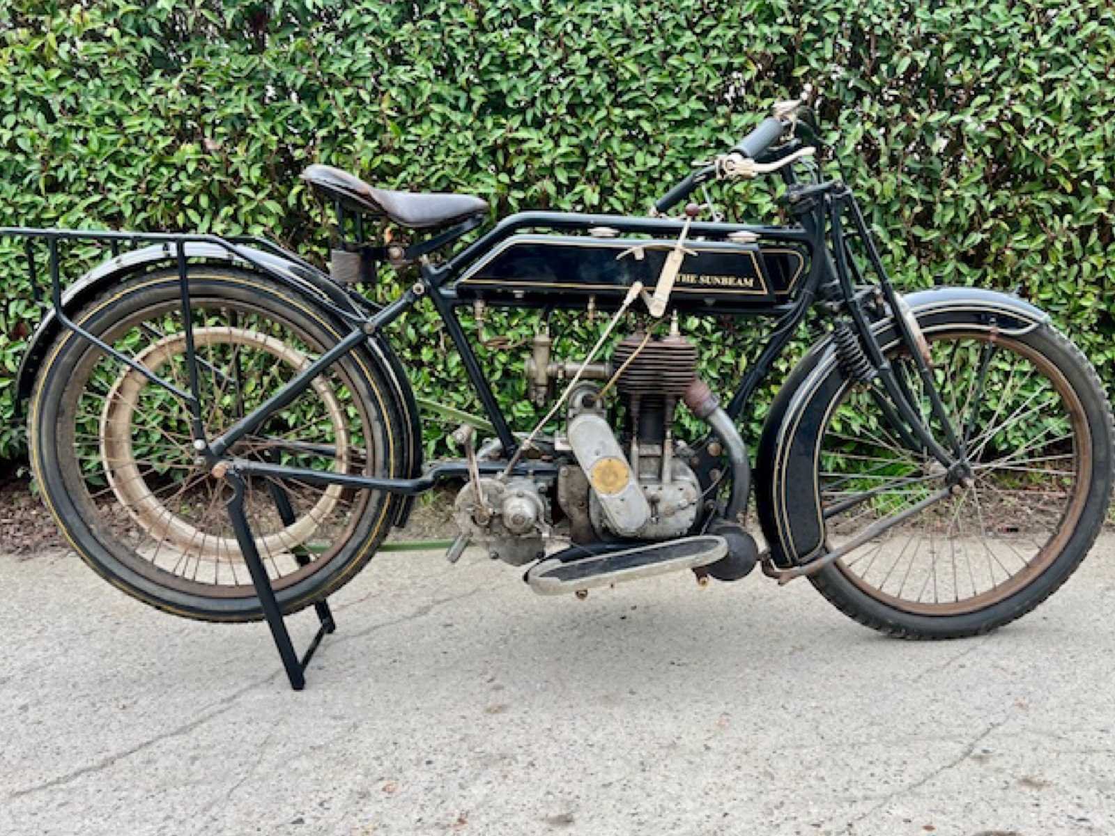 Engelse Sunbeam 4HP 550cc model met riemaandrijving. In WOI werden vele Sunbeams geleverd aan Rusland en andere landen maar de grootste afnemer was het Britse Royal Naval Air Service, de voorloper van de Britse luchtmacht. Dit waren allemaal 500cc met kettingaandrijving. Frankrijk bestelde 1000 motorfietsen maar met een 550cc blok en met riemaandrijving. Dit is nu een zeer zeldzame verschijning. Ondertussen zijn er bij de Marston Sunbeam Register 9 van deze motorfietsen bekend, met deze erbij 10 want tot nu toe was deze onbekend doordat hij vele jaren in Frankrijk in een privé verzameling heeft gestaan. Motorfiets is een oude restauratie die nu een volledig nazicht en revisie heeft gehad en is in perfect lopende staat. Motor en versnellingsbak zijn gereviseerd en start en loopt mooi. Deze motorfiets heeft het laagste bekende motornummer. Productie is gestart in 1916 tot 1918. Je kan ook de letters GS zien wat slaagt op Generale Service, het Franse voor legerdienst. No Merk: 1918 Sunbeam Model: 4HP Cilinderinhoud: 550cc Bouwjaar: 1918