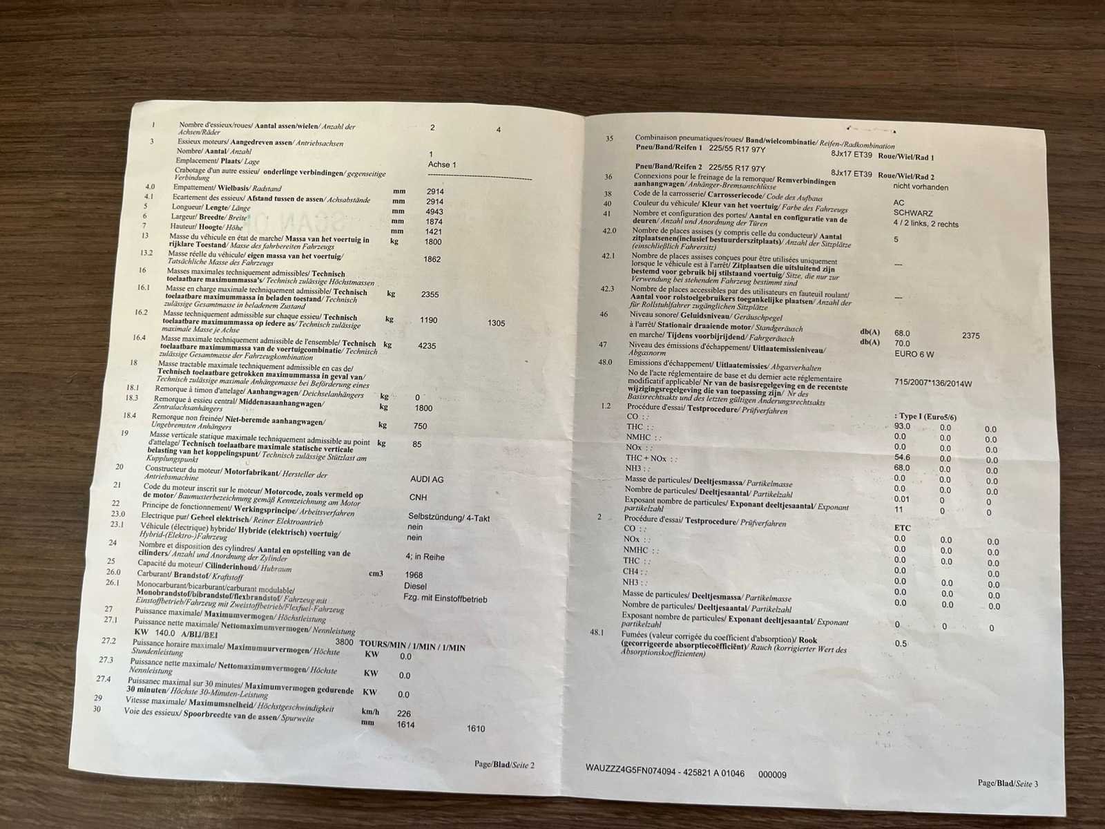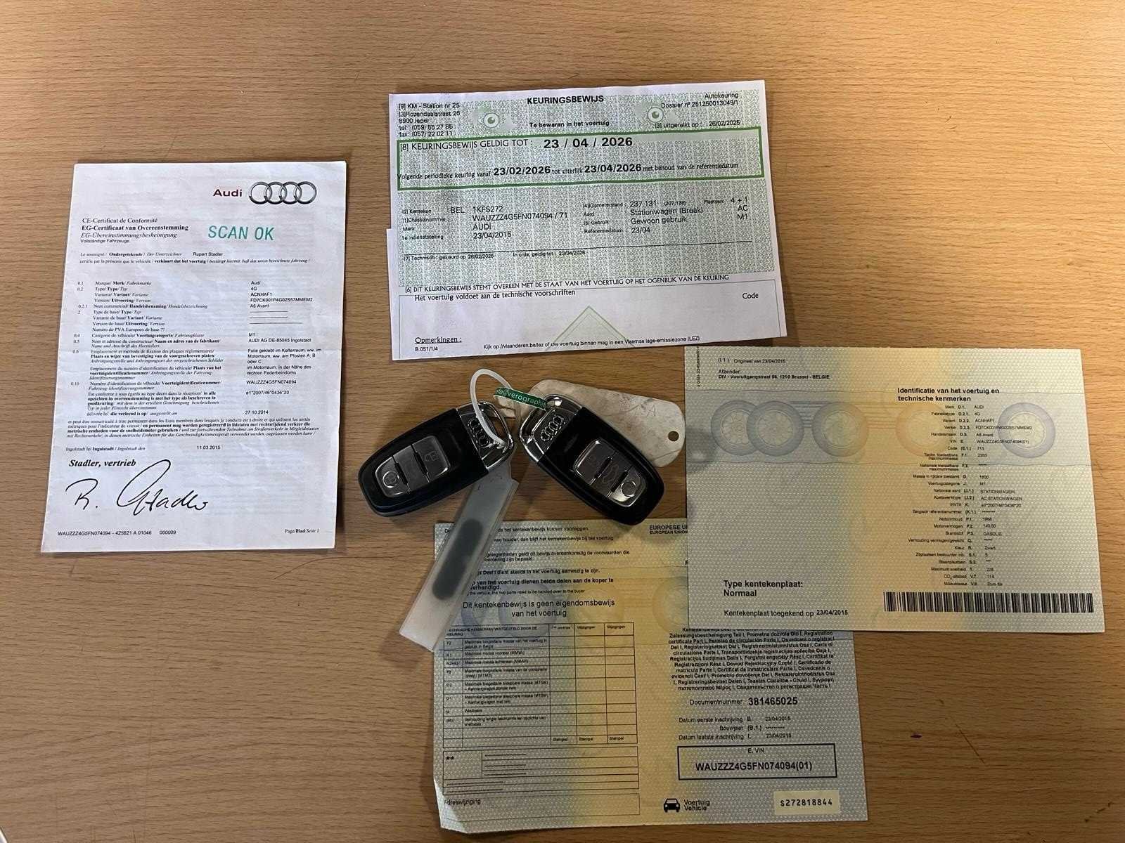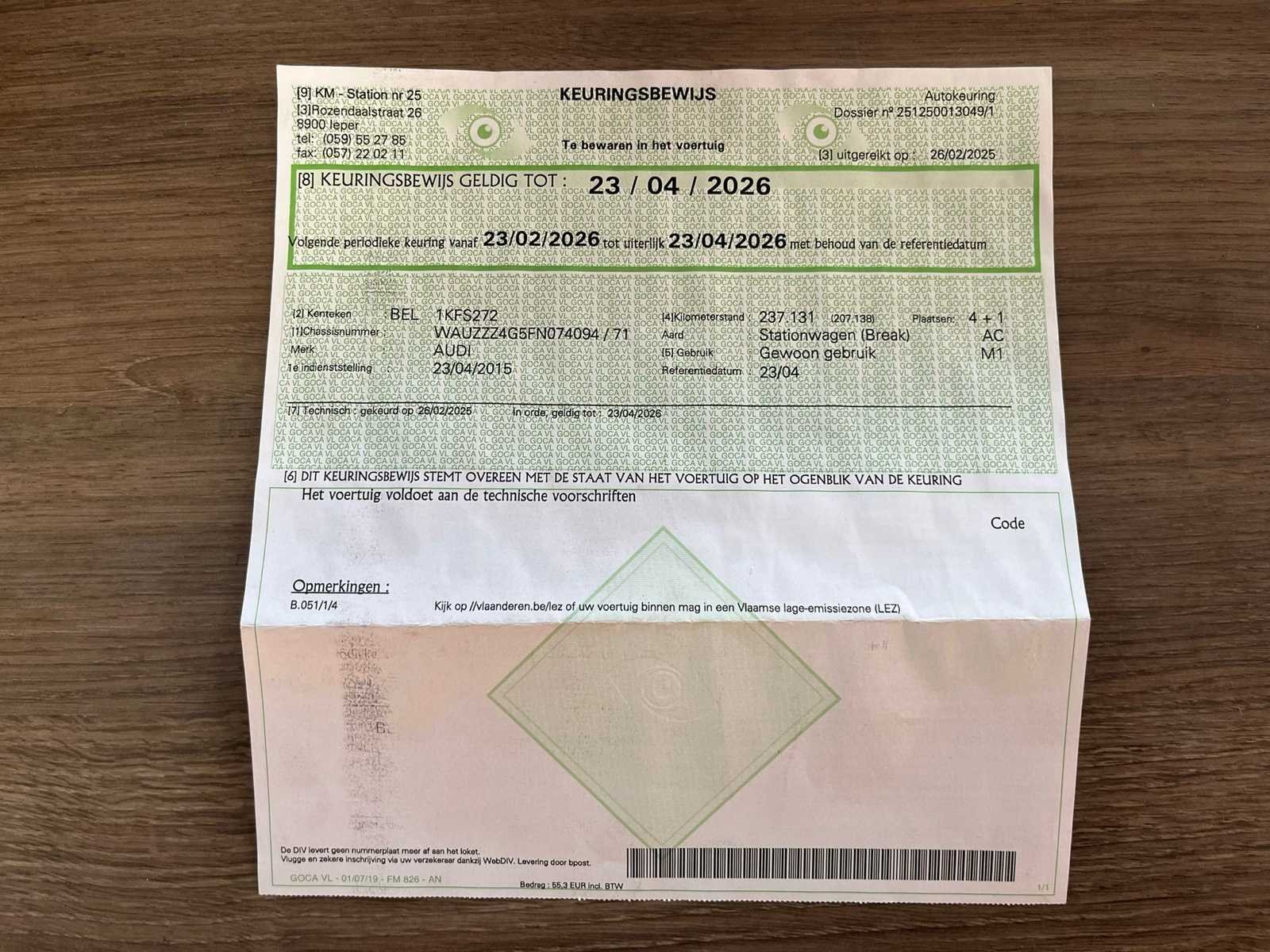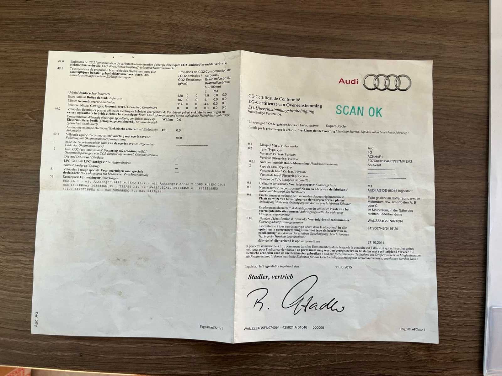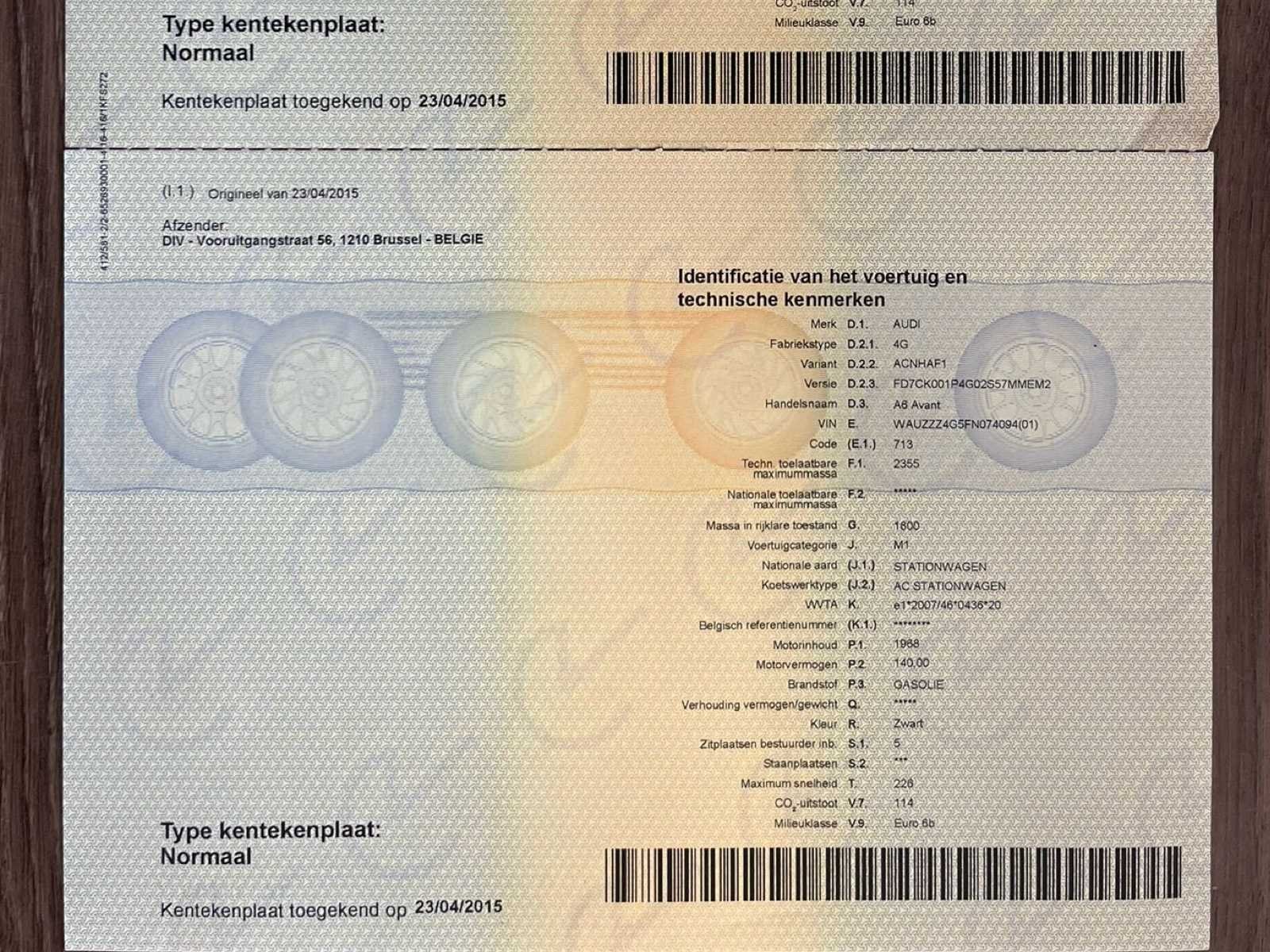 Reeds vervangen: Distributieriem en waterpomp op 153.000km in 2022 Volledige onderhoudshistorie aantoonbaar sinds aankoop wagen. Nee Merk: Audi Model: A6 Type: Avant Bouwjaar: 2015 Afgelezen kilometerstand: 240792km Cilinderinhoud: 1968cc Vermogen (kW): 140kW Brandstof: Diesel Chassisnummer: WAUZZZ4G5FN074094 Laadvermogen: 555kg Datum eerste toelating: 23/04/2015 Vermogen (pk): 190hp Aantal zitplaatsen: 5 Transmissie: Automaat Stuurwiel: Links Emissieklasse: Euro 6b Aantal deuren: 5 Aantal sleutels: 2 Ledig gewicht: 1800kg Carrosserie: Stationwagen Nationaliteit documenten: BE CO2-uitstoot NEDC: 114 Gelijkvormigheidsattest aanwezig: true Start en rijdt: Ja Keuringsrapport geldig tot: 23/04/2026 startinformatie : Start, rijdt, remt Zichtbare schade: Zie foto’s Vavato voert geen technische keuring uit.: true Airconditioning: true Leder bekleed: true Inschrijvingsbewijs - deel 1 : Ok Inschrijvingsbewijs - deel 2: Ok