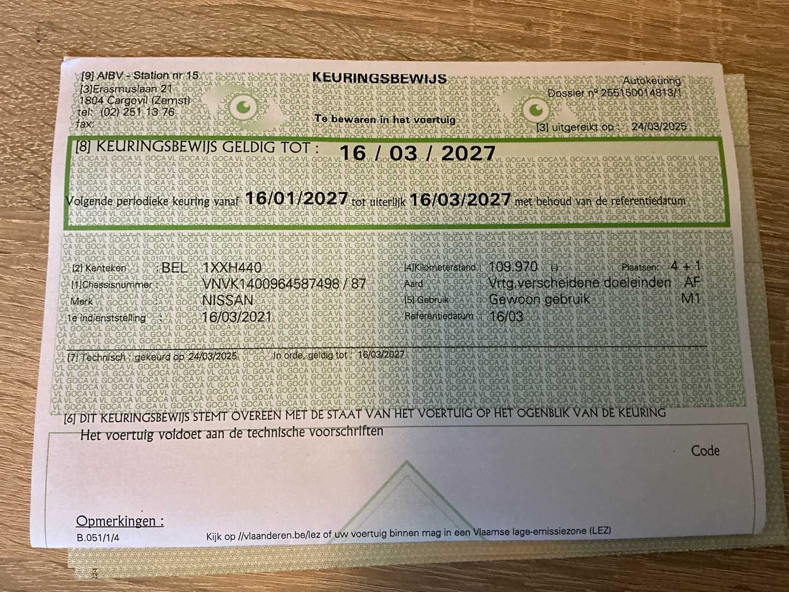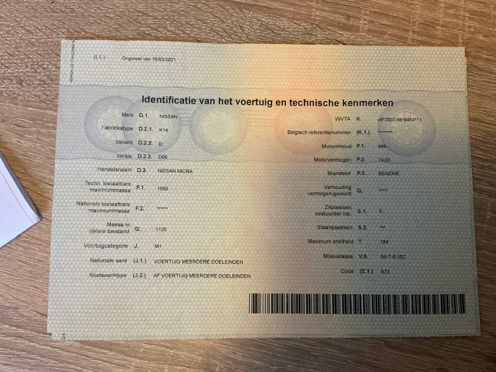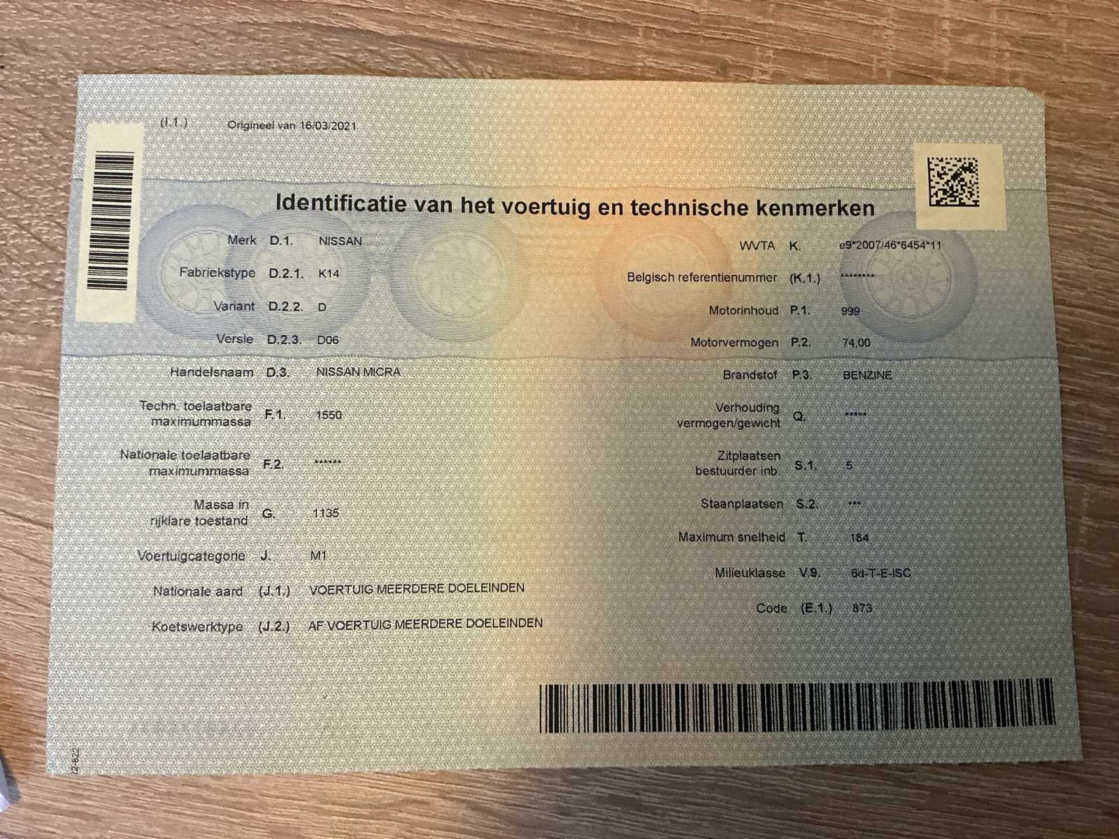 Te koop aangeboden: Nissan Micra 1.0 benzine, eerste inschrijving op 16 maart 2021. Deze compacte en zuinige stadswagen combineert praktische bruikbaarheid met lage gebruikskosten en is ideaal voor dagelijks verkeer. De wagen is uitgerust met een 1.0 liter benzinemotor (999 cc) met een vermogen van 74 kW (101 pk) en een manuele 5-versnellingsbak. De maximumsnelheid bedraagt 184 km/u. De kilometerstand bedraagt 132.923 km. Het voertuig is ingeschreven als personenwagen (categorie M1) en beschikt over 5 zitplaatsen. De massa in rijklare toestand bedraagt 1.135 kg en de technisch toelaatbare maximummassa bedraagt 1.550 kg. De wagen voldoet aan de geldende emissienormen (Euro 6). Qua uitrusting beschikt deze Micra onder meer over airconditioning, radio- en audiosysteem met Bluetooth-connectiviteit, multifunctioneel infotainmentscherm, elektrische ruiten en centrale vergrendeling. Het interieur is functioneel en netjes afgewerkt, met een overzichtelijk instrumentenpaneel. De wagen bevindt zich in gebruikte staat met normale gebruikssporen in verhouding tot leeftijd en kilometerstand. Deze Nissan Micra vormt een interessante opportuniteit voor wie op zoek is naar een betrouwbare, compacte en economische wagen, geschikt voor zowel particulier gebruik als stadsverkeer. No Merk: Nissan Model: Micra Bouwjaar: 2021 Afgelezen kilometerstand: 132923km Cilinderinhoud: 999cc Vermogen (kW): 74kW Brandstof: Benzine Chassisnummer: VNVK1400964587498 Datum eerste toelating: 16/03/2021 Aantal zitplaatsen: 5 Kleur: Zwart Transmissie: Manueel Emissieklasse: Euro 6d Aantal deuren: 5 Aantal sleutels: 2 Nationaliteit documenten: België Gelijkvormigheidsattest aanwezig: true Start en rijdt: Ja Keuringsrapport geldig tot: 16/03/2027 startinformatie : Start, remt en, rijdt Vavato voert geen technische keuring uit.: true Airconditioning: true Inschrijvingsbewijs - deel 1 : Ja Inschrijvingsbewijs - deel 2: Ja