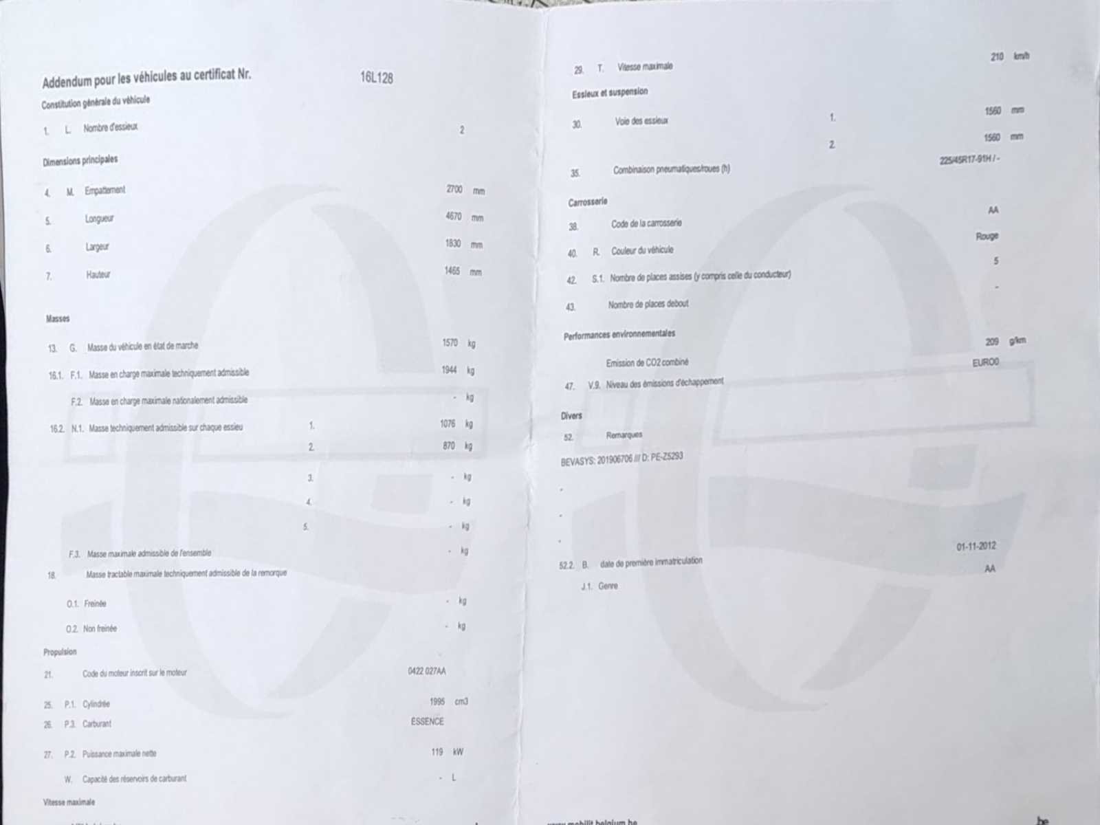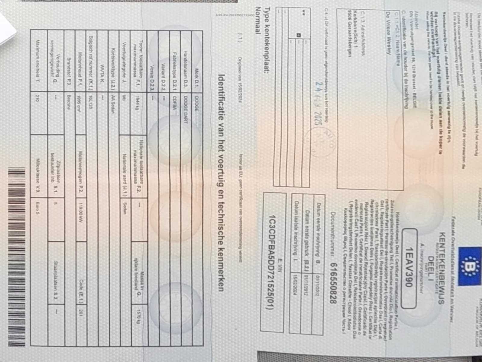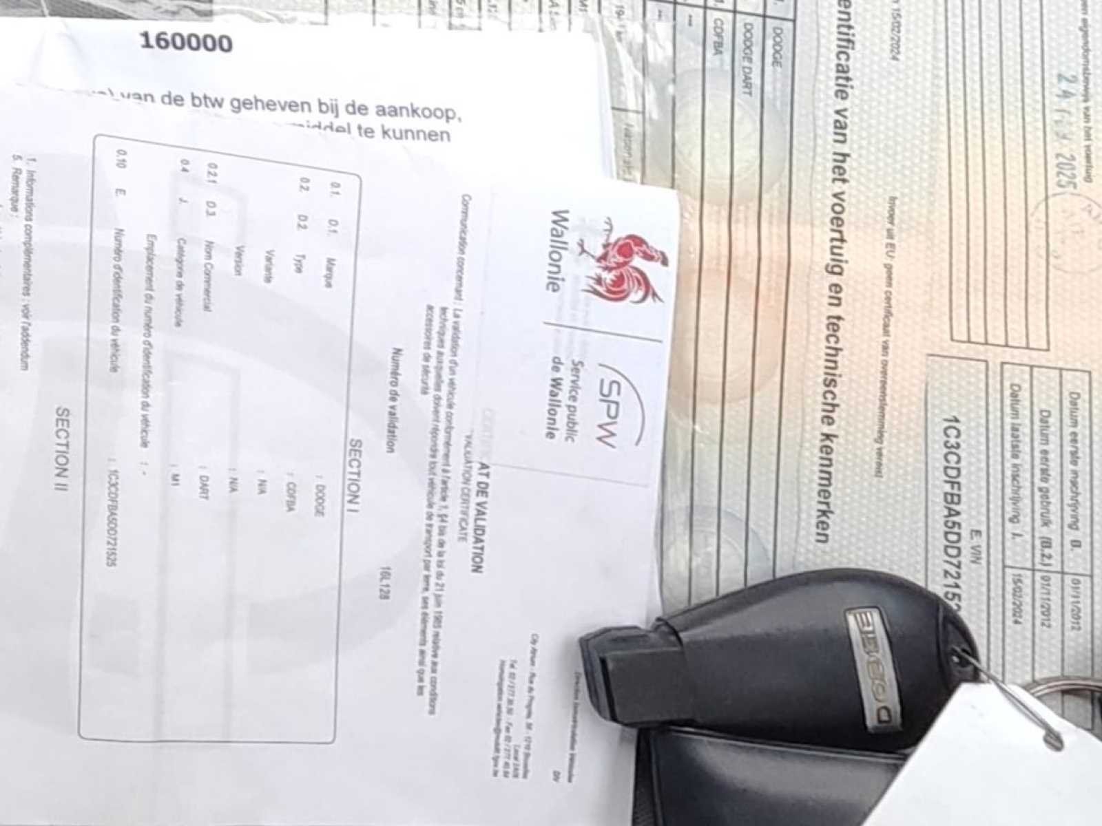 No Merk: Dodge Model: Dart SXT *AUTOMAAT* Bouwjaar: 2012 Afgelezen kilometerstand: 160480km Cilinderinhoud: 1995cc Vermogen (kW): 119kW Brandstof: Benzine Chassisnummer: 1C3CDFBA5DD721525 Datum eerste toelating: 01/11/2012 Aantal zitplaatsen: 5 Kleur: Rood Transmissie: Automaat Emissieklasse: EURO 5 Aantal deuren: 4 Aantal sleutels: 2 Nationaliteit documenten: Belgisch Start en rijdt: YES