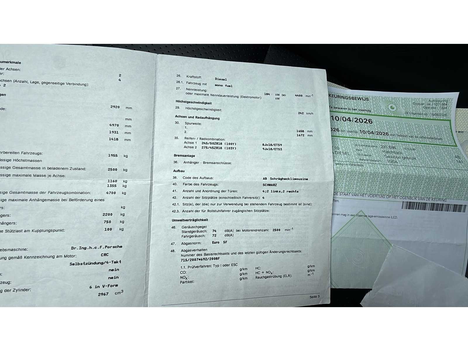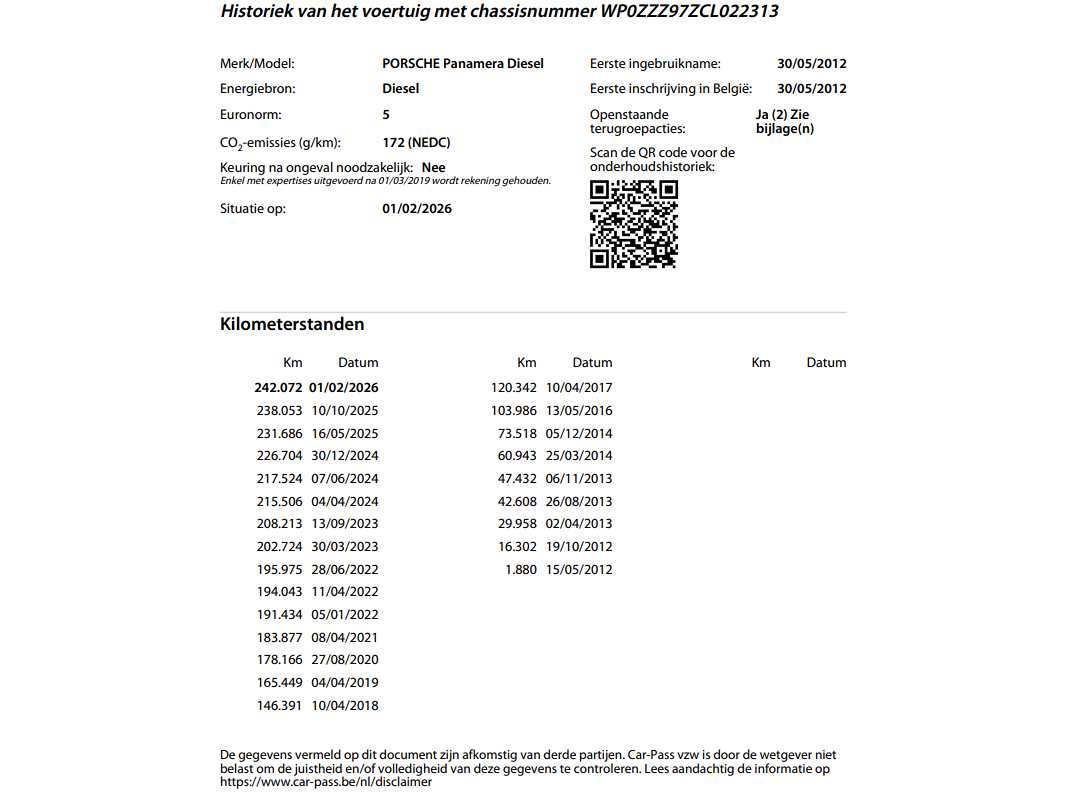 Spatbord, bumper, koplamp beschadigd. Wagen start en rijd perfect Laatste keuring zonder opmerkingen Carrosserie en interieur zeer proper Recent nieuwe banden en injectoren en draagarmen en batterij Nee Kenteken: 1SDR797 Merk: Porsche Model: Panamera Type: Platinum Bouwjaar: 2012 Afgelezen kilometerstand: 242000km Cilinderinhoud: 2967cc Vermogen (kW): 184kW Brandstof: Diesel Chassisnummer: WP0ZZZ97ZCL022313 Datum eerste toelating: 30/05/2012 APK vervaldatum: 10/04/2026 Aantal zitplaatsen: 4 Kleur: zwart Emissieklasse: 5 Aantal deuren: 5 Aantal sleutels: 2 Aantal cilinders: 6 Onderhoudshistorie: zie carpass Zichtbare schade: ja Airconditioning: true Navigatie: true LED-koplampen: true Leder bekleed: true Inschrijvingsbewijs - deel 1 : ja Inschrijvingsbewijs - deel 2: ja