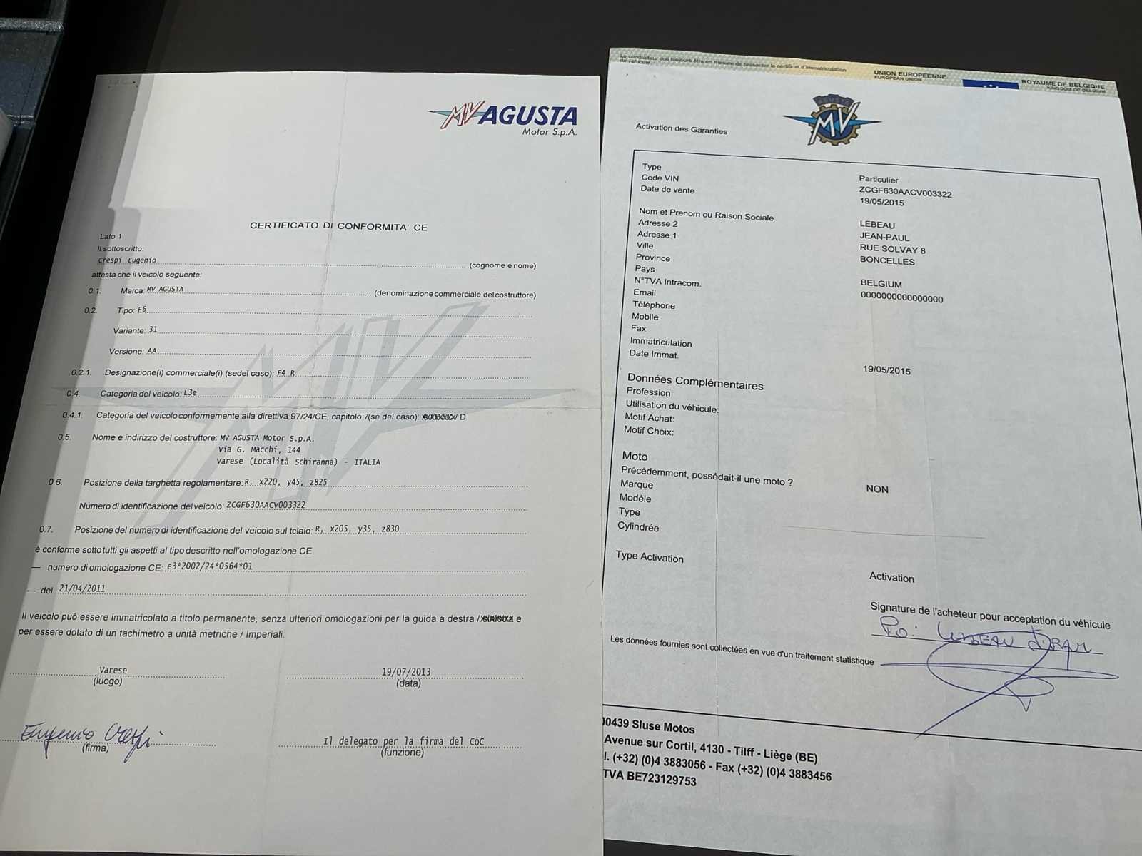 MV Agusta F6 – Italiaanse superbike met tijdloos design Aangeboden: een exclusieve MV Agusta F6, een ware icoon onder de superbikes. Deze machine combineert compromisloze prestaties met verfijnd Italiaans design en is een echte blikvanger in elke collectie. De F6 staat bekend om zijn hoogtoerige viercilinder, scherpe handling en het kenmerkende, agressieve kuipwerk. Het iconische front met centrale koplamp, de enkelzijdige swingarm en de sportieve zitpositie benadrukken het pure race-DNA van dit model. Uitgevoerd in een stijlvolle rood/zilver kleurstelling die het exclusieve karakter van MV Agusta perfect onderstreept. Een motorfiets die niet alleen indruk maakt door prestaties, maar ook door zijn afwerking en uitstraling. No Merk: MV AGUSTA Model: F6 R Brandstof: Benzine Chassisnummer: ZCGF630AACV003322 Cilinderinhoud: 998cc Datum eerste toelating: 21/05/2015 Gewicht: 213kg Vermogen (kW): 73kW Kleur: Rood Afgelezen kilometerstand: 6100km Nationaliteit documenten: Belgisch Aantal sleutels: 2 Boorddocumenten aanwezig?: true Startinformatie: Start