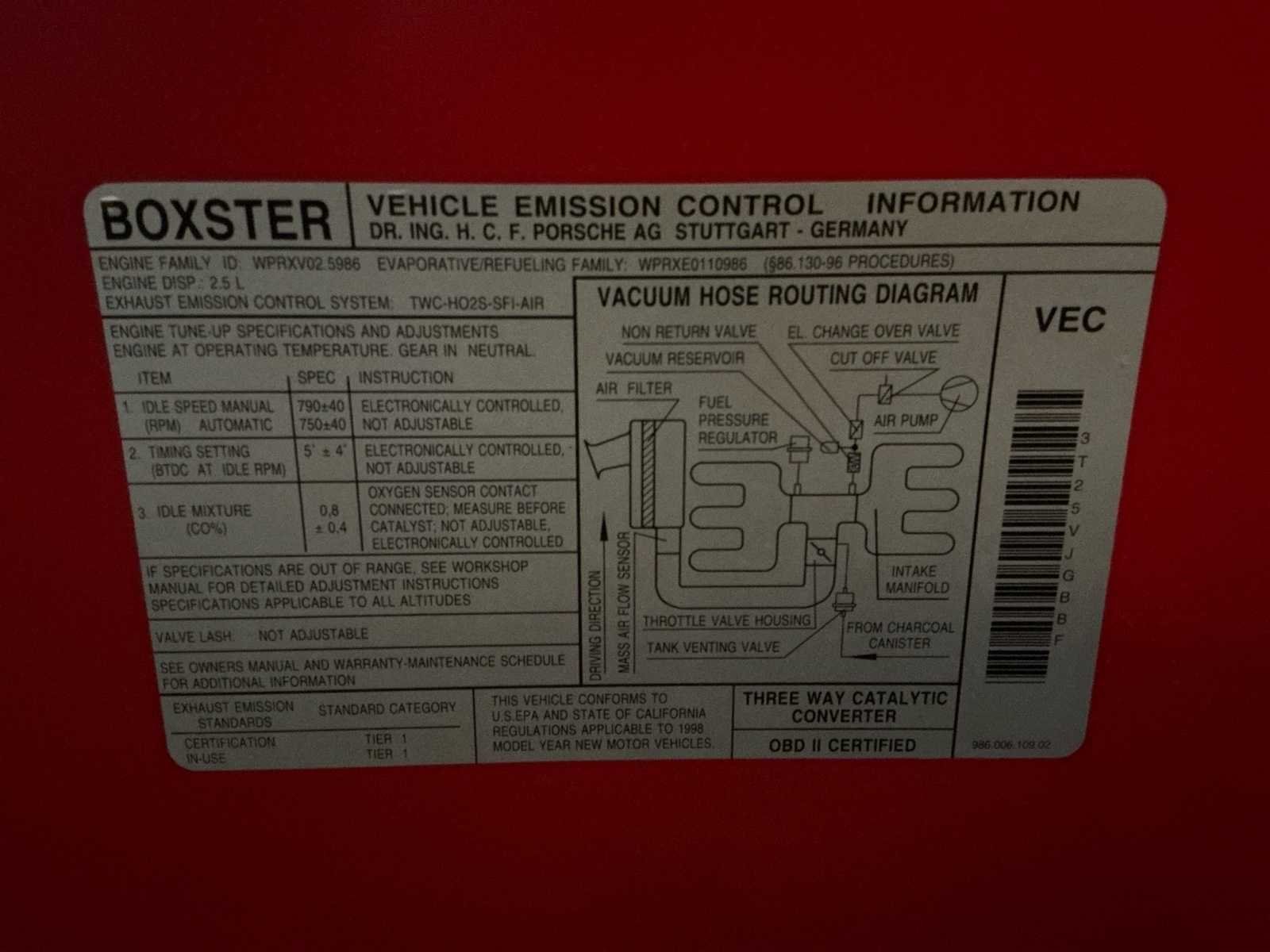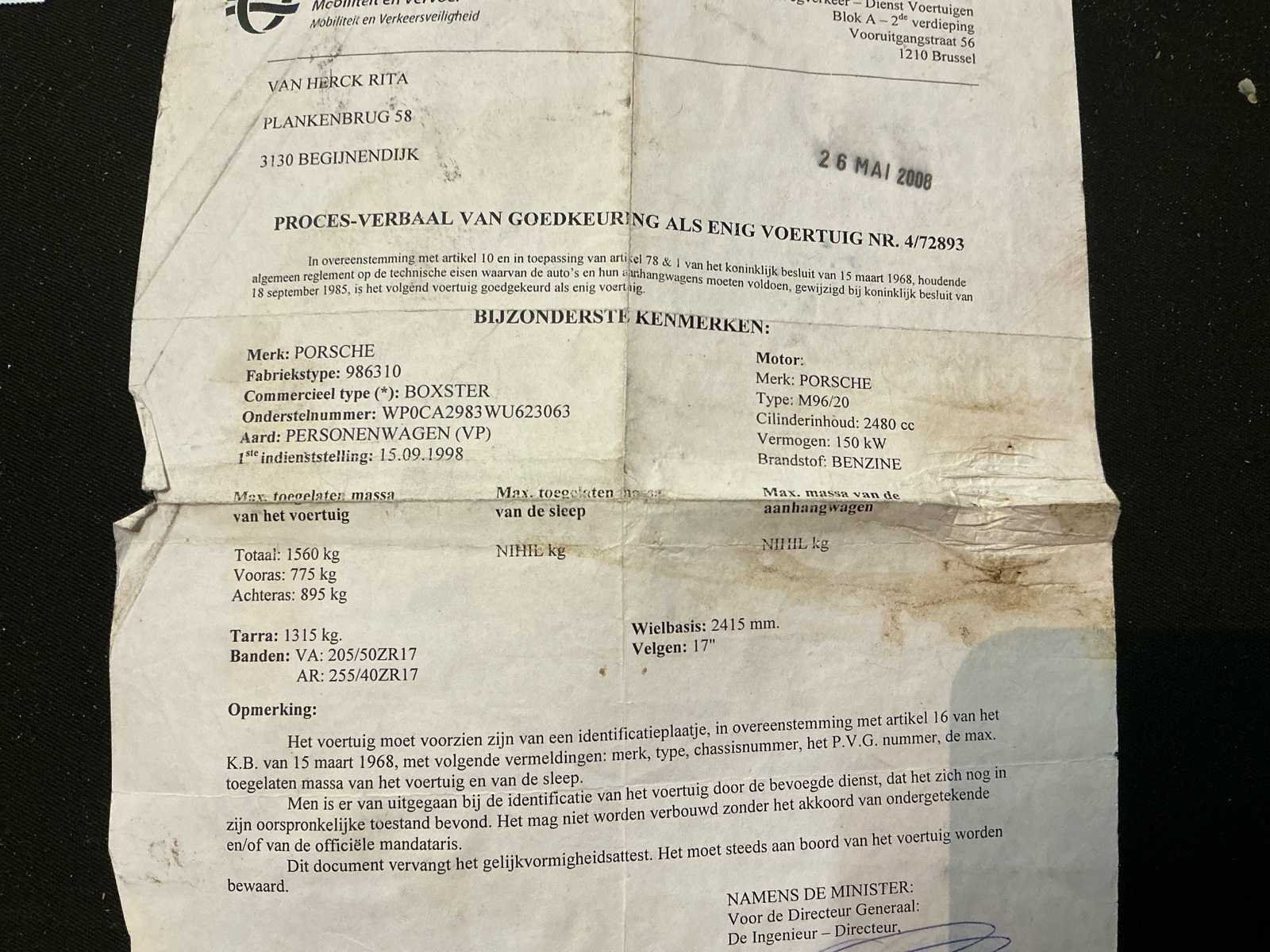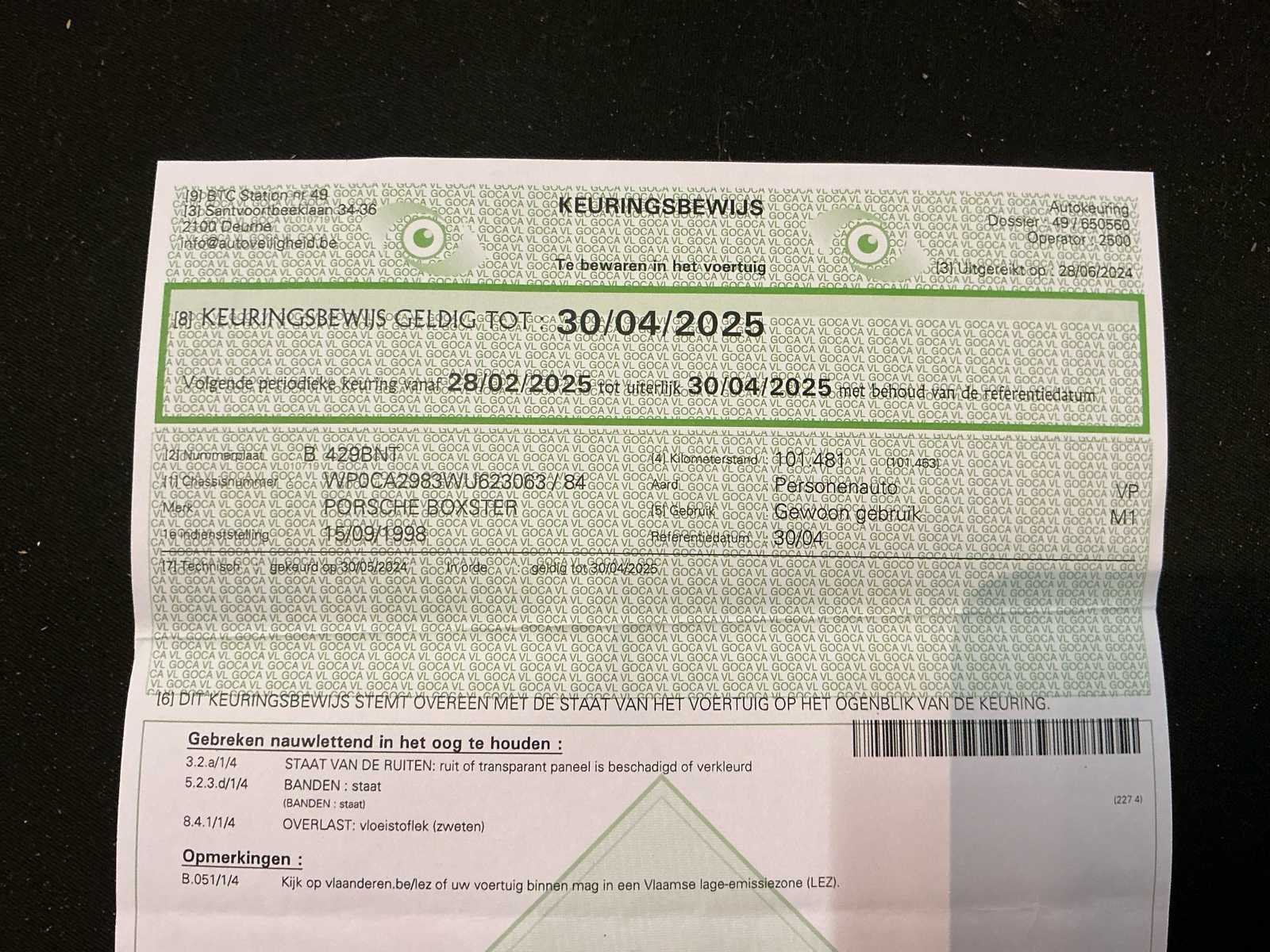 Elektrisch dak momenteel handmatig te openen en sluiten Wagen start en rijd perfect Waterpomp 03/25 vervangen No Merk: Porsche Model: Boxter Bouwjaar: 1998 Cilinderinhoud: 2480cc Vermogen (kW): 150kW Brandstof: Benzine Afgelezen mijlenstand: 101678mi Chassisnummer: WPOCA2983WU623063 Datum eerste toelating: 15/09/1998 Aantal zitplaatsen: 2 Kleur: Rood Aantal deuren: 2 Aantal sleutels: 1 Nationaliteit documenten: Belgisch Gelijkvormigheidsattest aanwezig: true Start en rijdt: Ja Keuringsrapport geldig tot: 30/03/2025 Airconditioning: true Leder bekleed: true Inschrijvingsbewijs - deel 1 : Ja Inschrijvingsbewijs - deel 2: Ja