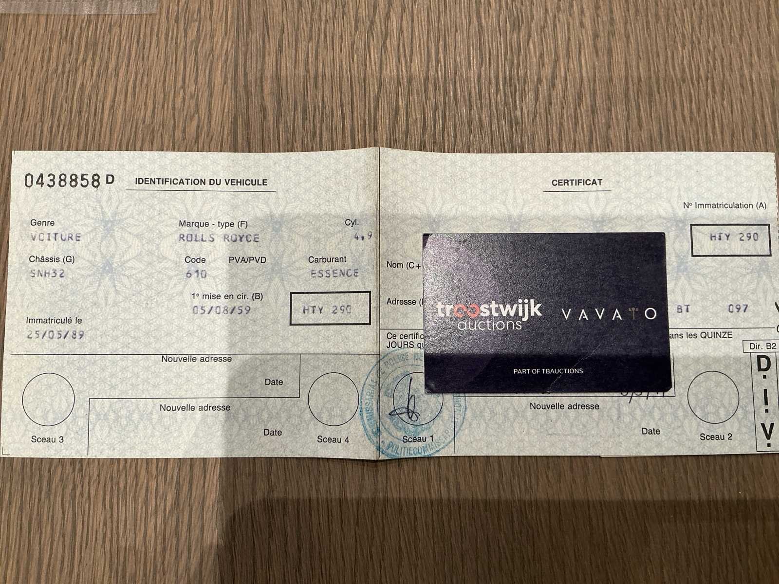 Start en rijd perfect No Merk: Rolls Royce Type: Silver Cloud Bouwjaar: 1959 Chassisnummer: SNH32 Afgelezen mijlenstand: 40069mi Brandstof: Benzine Datum eerste inschrijving: 05/08/1955 Datum eerste toelating: 05/08/1955 Nationaliteit documenten: Belgisch Aantal deuren: 4 Aantal zitplaatsen: 4 Aantal sleutels: 1 Kleur: Zilver two tone Cilinderinhoud: 4900 Inschrijvingsbewijs - deel 1 : Ja