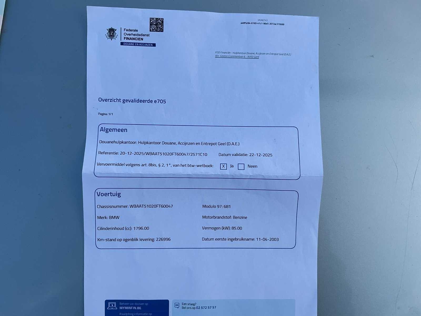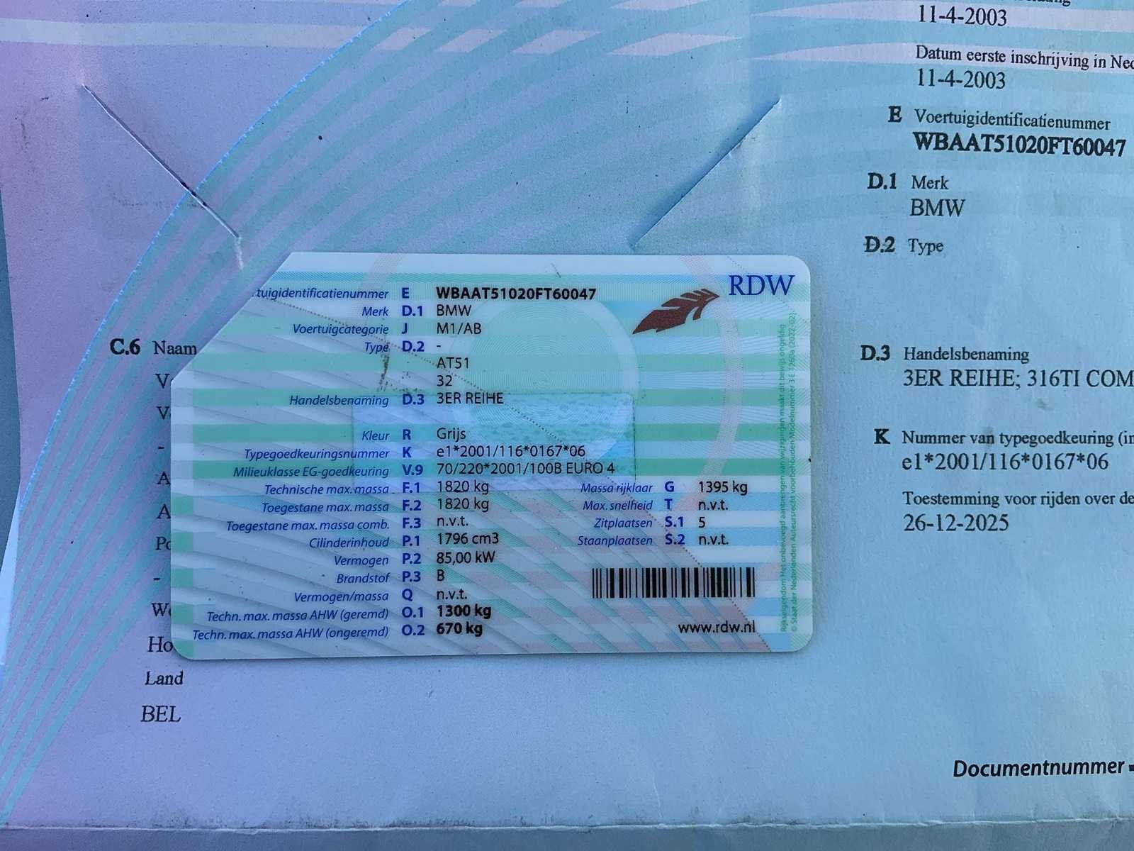 BMW 316TI Cartervertilatie vervangen / lambda sensor vervangen Cruisecontrol Automaat Motorlampje brand wegens teveel CO2 uitstoot Nieuwe batterij Nee Merk: BMW Model: 316TI Bouwjaar: 2003 Afgelezen kilometerstand: 227154km Vermogen (kW): 85kW Brandstof: benzine Chassisnummer: WBAAT51020FT60047 Datum eerste toelating: 11/04/2003 Datum eerste toelating (NL): 11/04/2003 Aantal zitplaatsen: 5 Kleur: Grijs Transmissie: Automaat Aantal deuren: 3 Aantal sleutels: 1 Nationaliteit documenten: Nederlands Start en rijdt: Ja No self drive export!: true Vavato voert geen technische keuring uit.: true Airconditioning: true