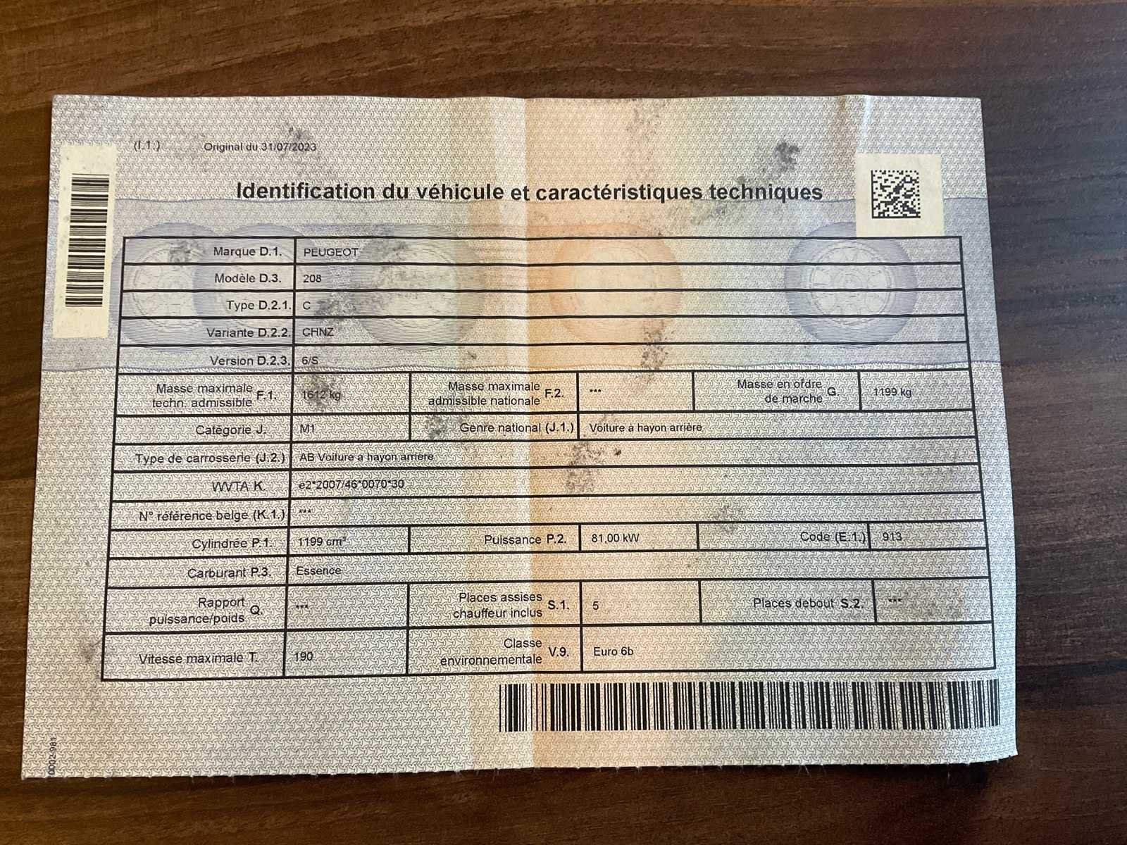 Peugeot 208 5-deurs uitgerust met een 1,2 liters benzinemotor van 81 kW (110 pk), met handgeschakelde versnellingsbak. Euro 6b-conform voertuig, geregistreerd in België. 📄 Administratieve gegevens Merk / Model: Peugeot 208 Eerste in gebruik genomen: 01-07-2016 Kilometerstand: ± 60,030 km (op de kilometerteller, niet gegarandeerd) Verdruk: 1,199 cm³ Vermogen: 81 kW / 110 pk Brandstof: Benzine Aantal deuren: 5 Aantal zetels: 5 WIJN: VF3CCHNZ6FT234749 Registratie: België Documenten: Belgisch registratiebewijs aanwezig (Deel I) ⚙️ Zichtbare apparatuur en opties Lichtmetalen velgen Panoramisch glazen dak Getinte achterruiten Multimediasysteem met centraal scherm Airconditioning Elektrische ramen Verstelbare buitenspiegels Multifunctioneel stuurwiel Opklapbare achterbank 🔍 Externe toestand De carrosserie is in goede algemene staat, met normale gebruikssporen gerelateerd aan leeftijd en gebruik van het voertuig. Zichtbare defecten: Lichte krassen en schuurplekken op de carrosserie Buitenspiegel van de bestuurder met micro-krassen Rechter achterdeurklink met sporen van slijtage Rechterachtervleugel met schrammen en een klein gebied met afbladderende verf Geen structurele schok of significante vervorming zichtbaar op de foto's. 🧼 Binnenlandse staat Volledig interieur Stoffen bekleding met zichtbaar vuil Vuile tapijten en tapijten, zonder zichtbare scheuren Volledige interieurafwerking Stuurwiel met normale slijtage Binnenreiniging is te verwachten. 🛞 Wielen & Banden Voertuig uitgerust met lichtmetalen velgen Banden gemonteerd in normale staat Extra wielset aanwezig (zie foto's) 🔧 Werking Functioneel dashboard Geplande reiniging vóór verwijdering No Merk: Peugeot Model: 208 Type: 1.2 Puretech Bouwjaar: 2016 Afgelezen kilometerstand: 60030km Cilinderinhoud: 1199cc Vermogen (kW): 81kW Brandstof: Benzine Chassisnummer: VF3CCHNZ6FT234749 Datum eerste toelating: 2016 Vermogen (pk): 110hp Aandrijving: Links Aantal zitplaatsen: 5 Kleur: Wit Transmissie: Handmatig Aantal deuren: 5 Aantal sleutels: 1 Aantal cilinders: 4 Nationaliteit documenten: België Gelijkvormigheidsattest aanwezig: waar startinformatie : Start en rijd Vavato voert geen technische keuring uit.: waar Airconditioning: true