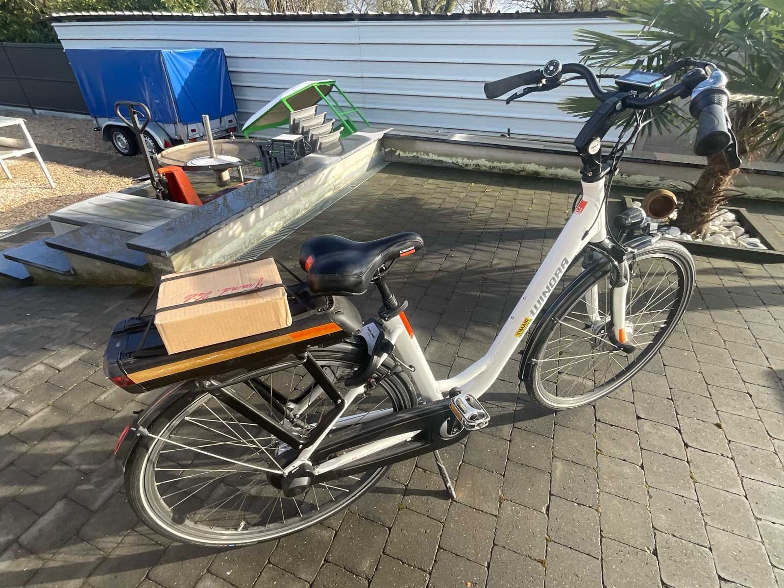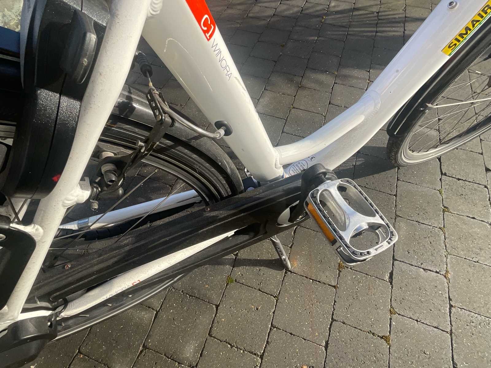 Winora C1 stadselektrische fiets met laag aluminium frame. Kilometerteller geeft 447 km aan. Uitgerust met: Elektromotor geïntegreerd in de voornaaf 36V accu gemonteerd op achterdrager Winora LCD-scherm Trelock frame slot SR Suntour veringsvork V-remmen Voor- en achterverlichting Standaard Achterdrager Geleverd met TranzX 36V oplader en gebruikershandleiding. No Merk: Winora Model: Winora C1 Product type: Stadselektrische Fiets Frame type: Laag frame Afgelezen kilometerstand: 447km Motorpositie: Voornaaf Oplader getest: Ja Accu getest: Ja Remsysteem: V-remmen Versnellingen: 7 Kleur: Wit Materiaal: ALu