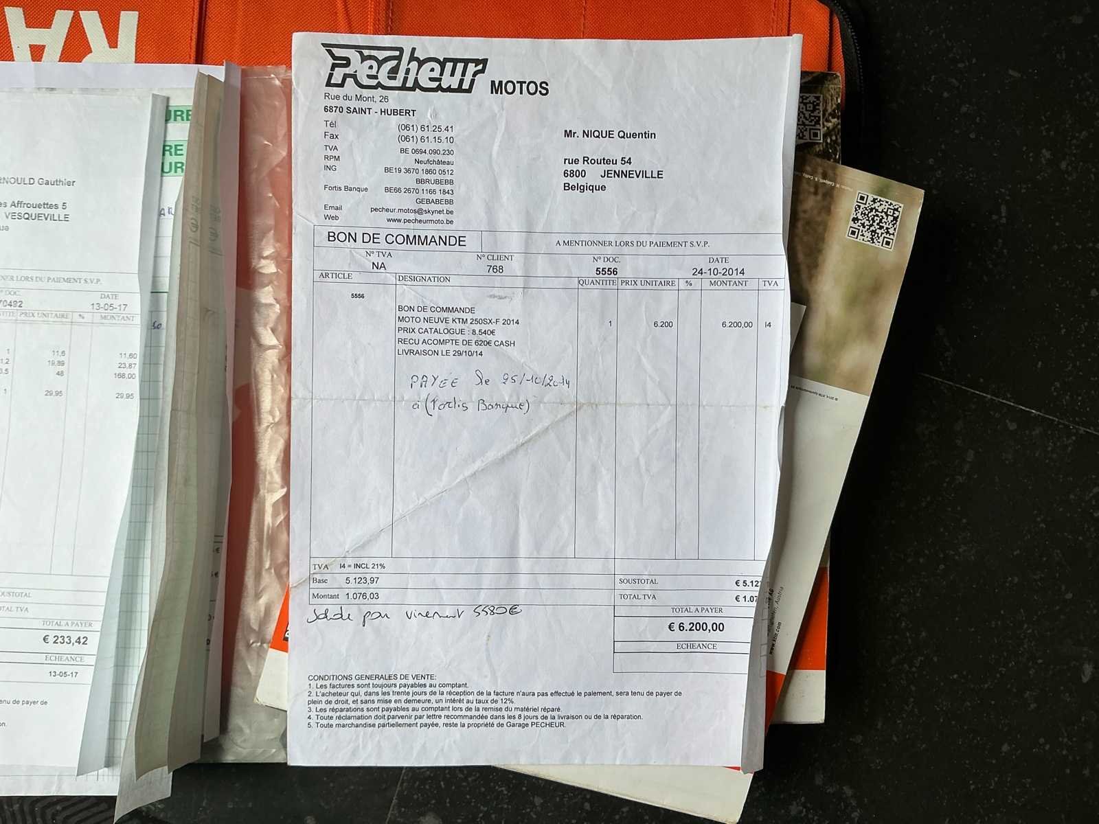 De crossmoto bevindt zich in goede staat. Start en rijdt. Urenteller niet werkend, heeft onlangs nieuwe zuiger gekregen, facturen aanwezig. No Merk: KTM Model: 250 SX-F Type: Cross moto 4takt Brandstof: Benzine Chassisnummer: VBKMY1434EM114752 Cilinderinhoud: 250cc Kleur: Orange Transmissie: Manueel