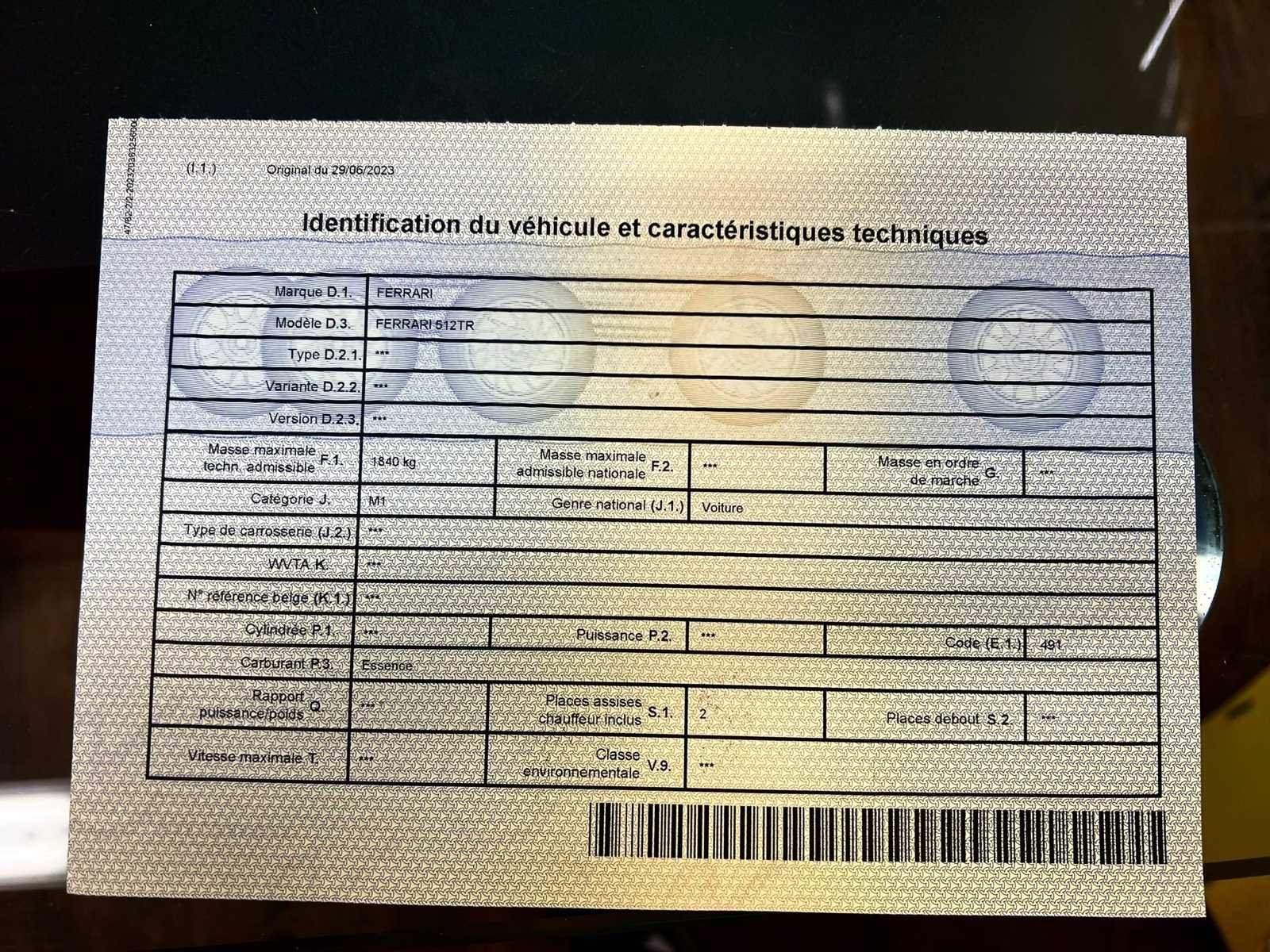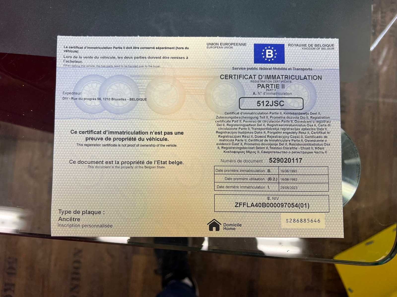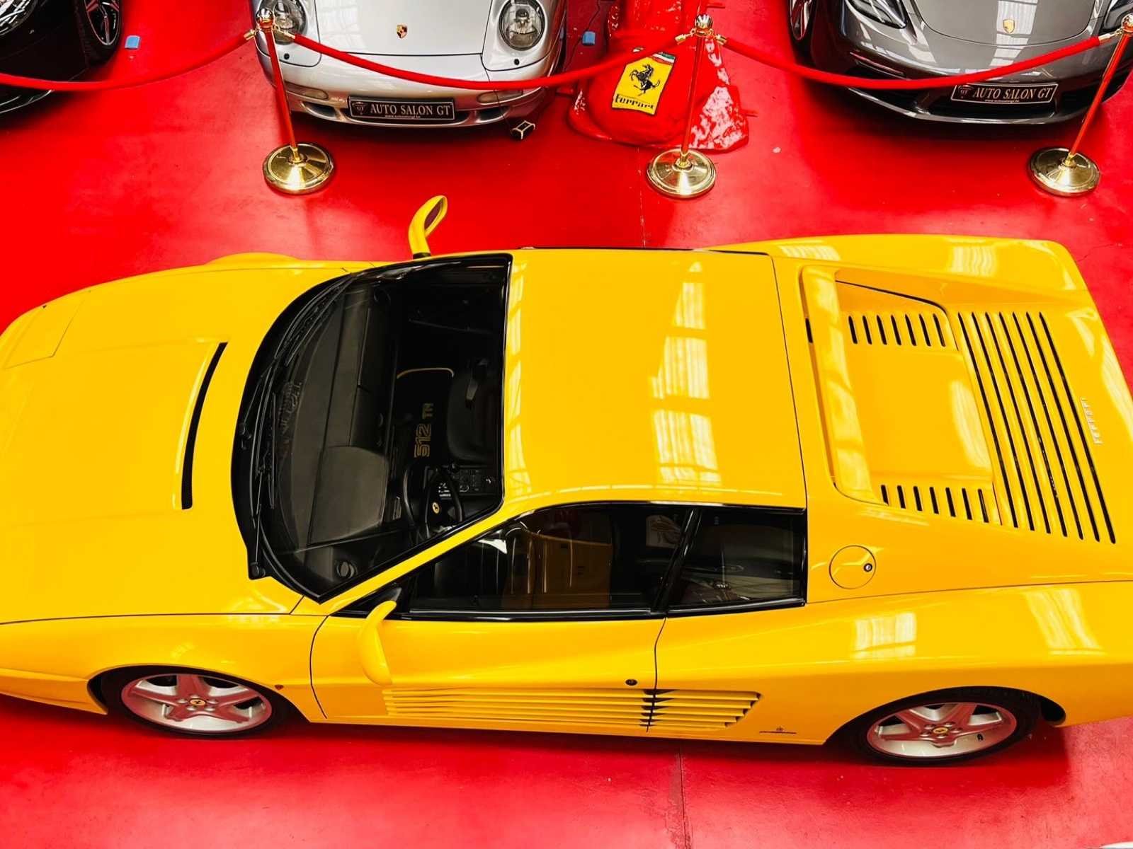 Het voertuig verkeert in onberispelijke staat: – Duidelijke geschiedenis – Volledig onderhoudslogboek met ondersteunende facturen – Zeer zeldzame Modena Yellow tint – Up-to-date onderhoud, distributieriem uitgevoerd – Vier nieuwe banden - kleine lichaamschip zichtbaar op foto – Geen kosten te verwachten No Merk: Ferrari Type: 512 TR Bouwjaar: 1993 Afgelezen kilometerstand: 45046km Vermogen (kW): 315kW Brandstof: Benzine Chassisnummer: ZFFLA40B000097054 Datum eerste toelating: 16/06/1993 Vermogen (pk): 428hp Aantal zitplaatsen: 2 Kleur: Geel Transmissie: Handboek Stuurwiel: Links Aantal deuren: 2 Aantal sleutels: 2 Aantal cilinders: 12 Carrosserie: Coupé Nationaliteit documenten: België Onderhoudshistorie: Oké startinformatie : Oké Vavato voert geen technische keuring uit.: waar Leder bekleed: true Inschrijvingsbewijs - deel 1 : Oké Inschrijvingsbewijs - deel 2: Oké