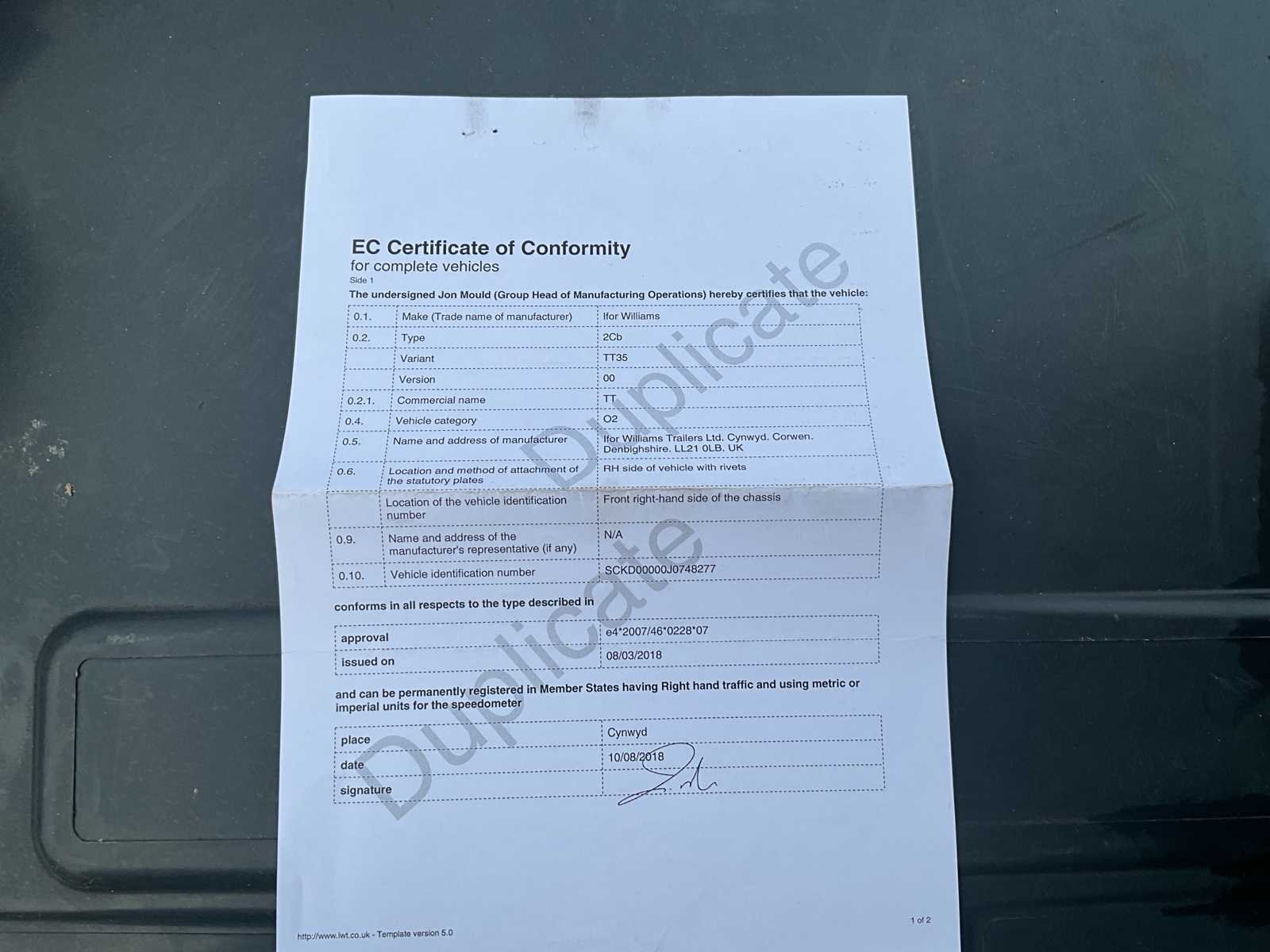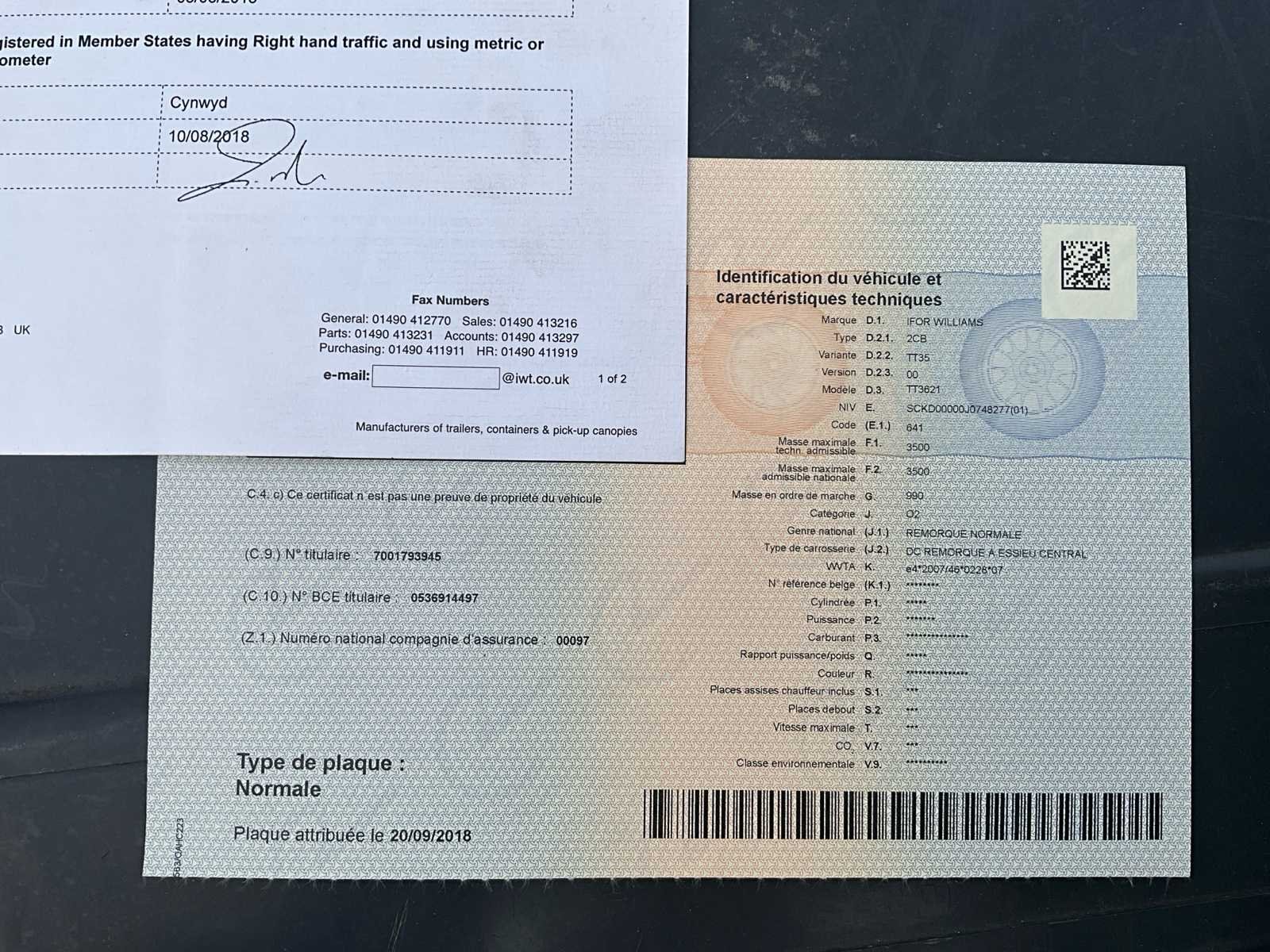 No Merk: Ifor Williams Trailer Type: 2Cb TT35 Bouwjaar: 2018 Chassisnummer: SCKD00000J0748277 Aantal assen: 2 Ledig gewicht: 990kg Laadvermogen: 2510kg Datum eerste toelating: 20/09/2018 Nationaliteit documenten: België