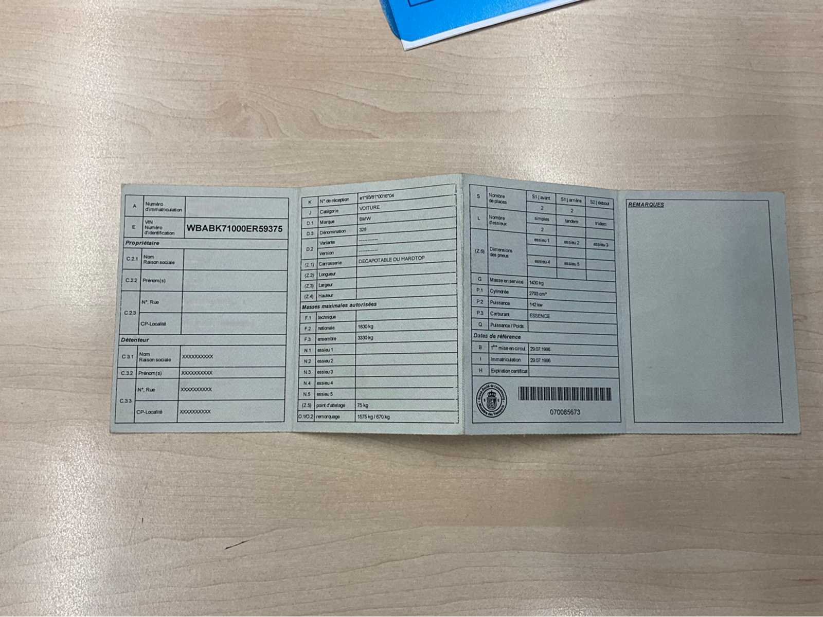 Non Chassisnummer: WBABK71000ER59375 Merk: BMW Model: 328i Type: Cabriolet Afgelezen kilometerstand: 166700km Brandstof: Benzine Datum eerste inschrijving: 29/07/1996 Nationaliteit documenten: Luxemburg Carrosserie: Cabriolet Aandrijving: Ja Transmissie: Handmatig Vermogen (pk): 193 Vermogen (kW): 142 Aantal deuren: 3 Aantal zitplaatsen: 4 Stuurwiel: Links Kleur: Blauw Cilinderinhoud: 2793 Aantal cilinders: 6