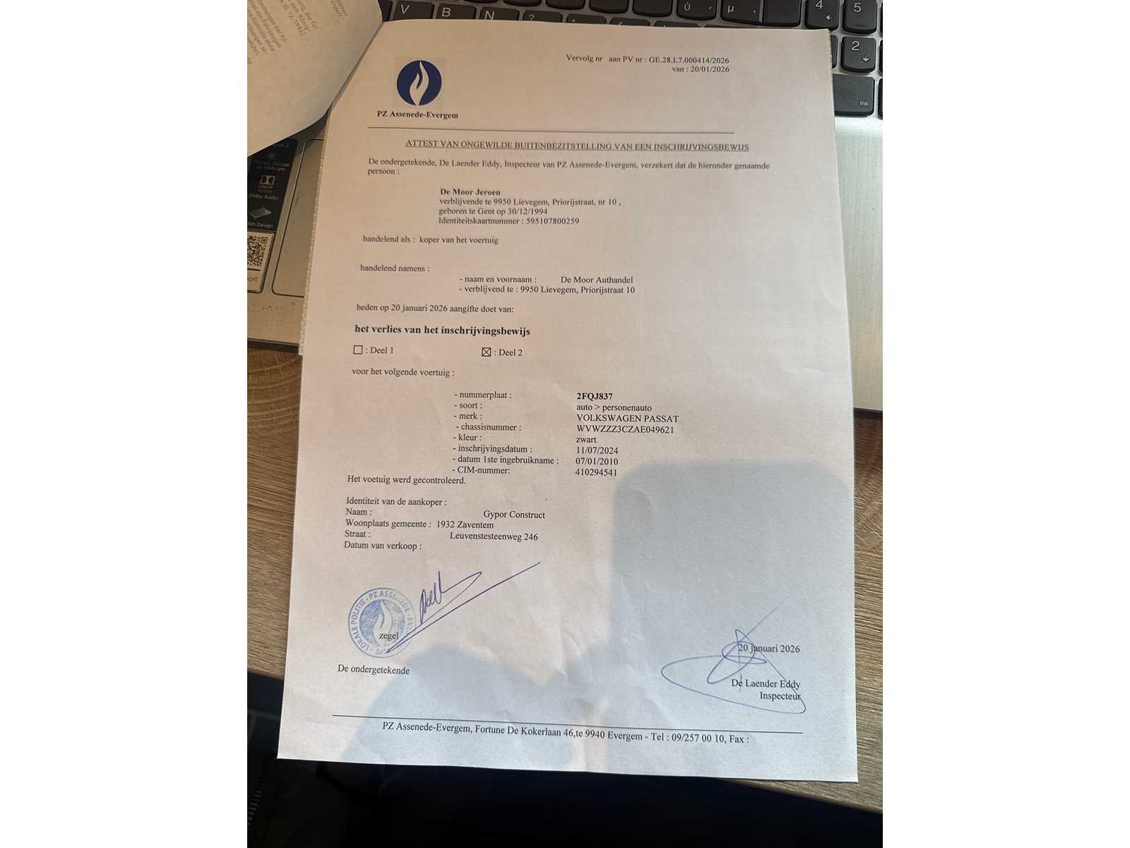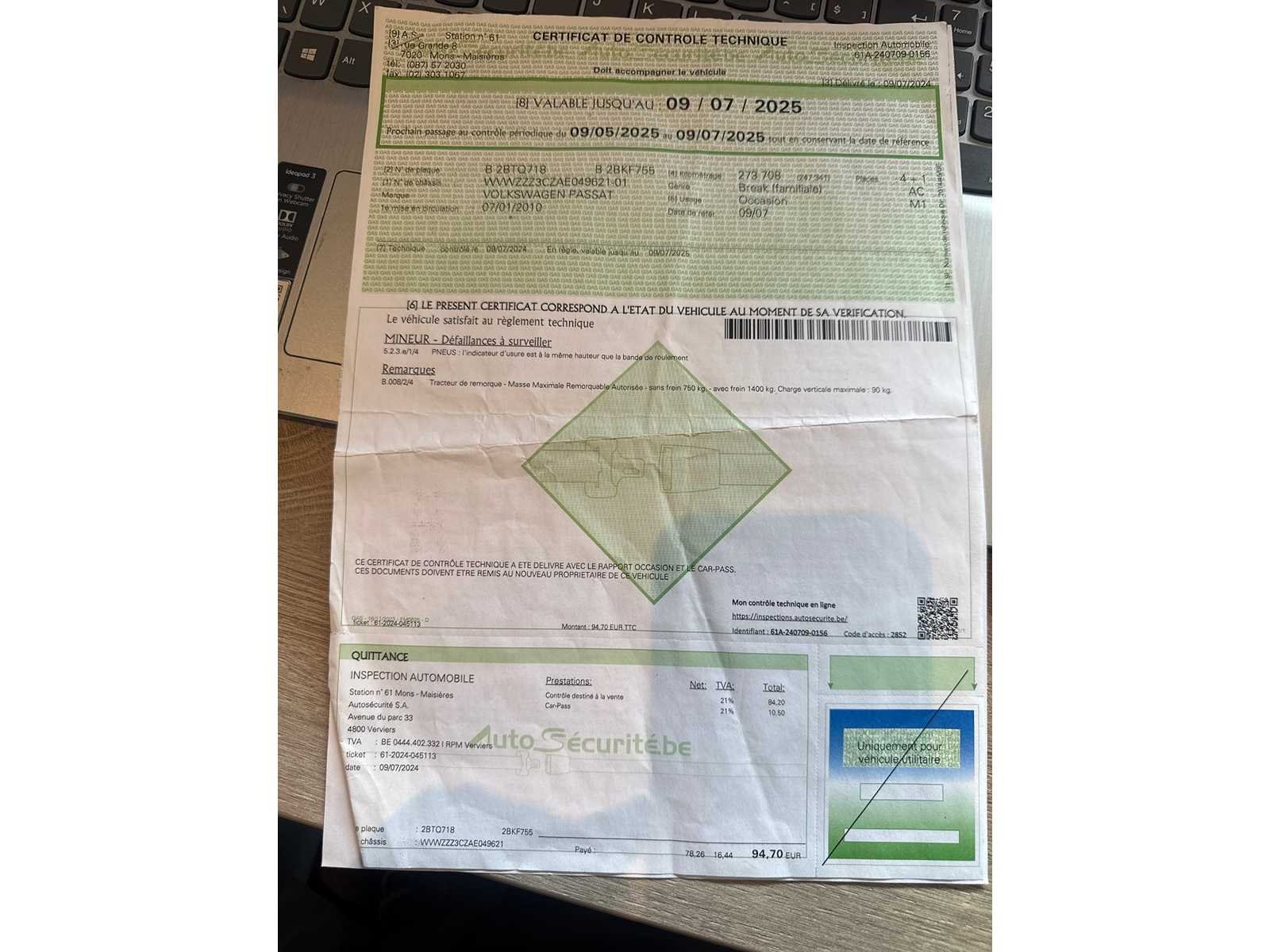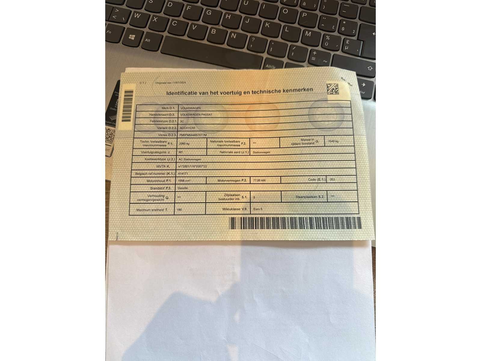 GOEDE STAAT RIJD GOED Nee Merk: VOLKSWAGEN Model: PASSAT Bouwjaar: 2010 Afgelezen kilometerstand: 27500km Cilinderinhoud: 1600cc Vermogen (kW): 77kW Brandstof: DIESEL Chassisnummer: WVWZZZ3CZAE049621 Datum eerste toelating: 07-01-2010 Kleur: ZWART Transmissie: MANUEEL Emissieklasse: 5 Aantal sleutels: 1 Nationaliteit documenten: BELGIE Gelijkvormigheidsattest aanwezig: true Carpass: true Start en rijdt: JA Keuringsrapport geldig tot: 09-07-2025 Inschrijvingsbewijs - deel 1 : AANWEZIG Inschrijvingsbewijs - deel 2: ATTEST VERLIES POLITIE