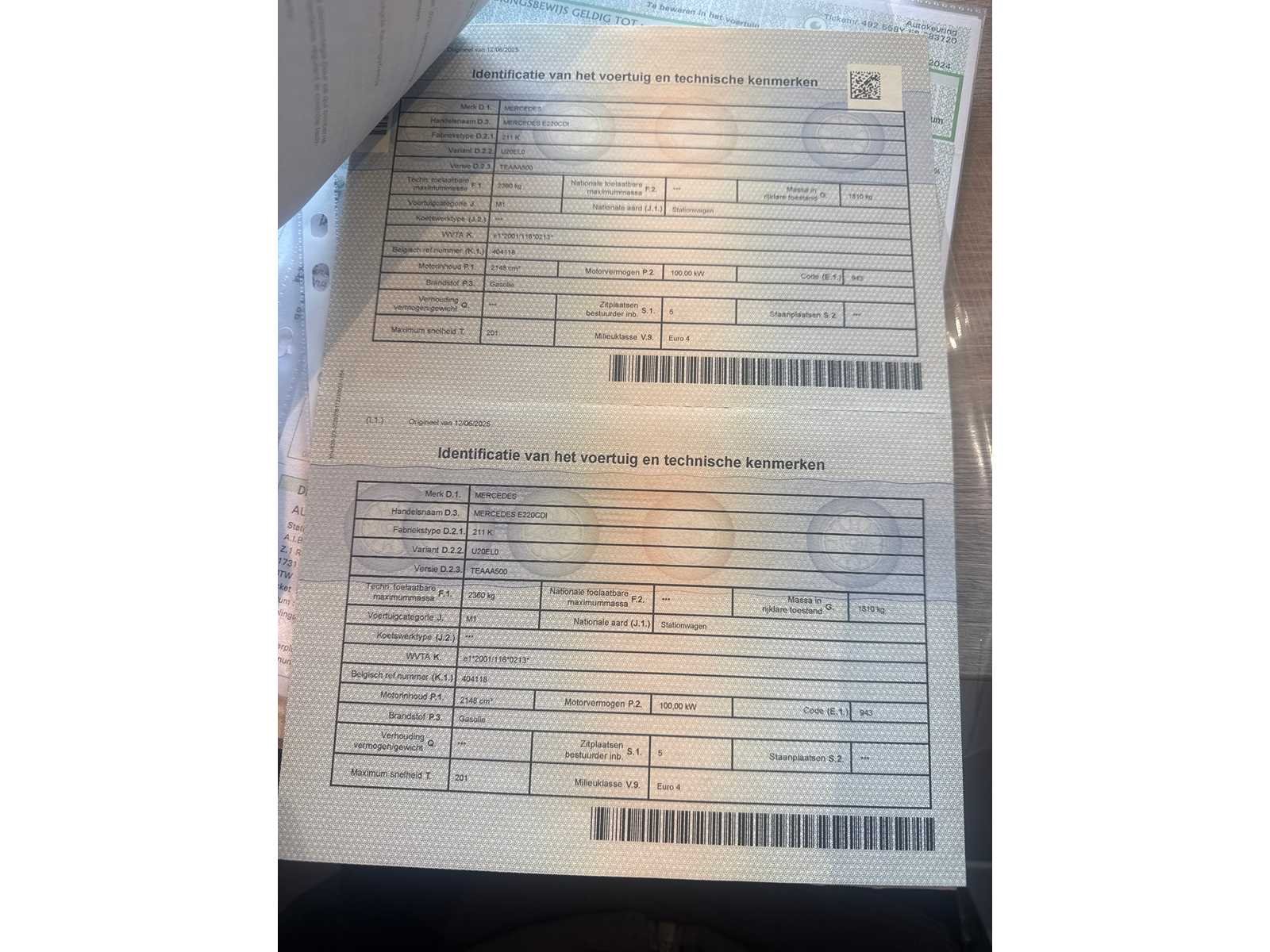 START EN RIJD BOORDDOCUMENTEN AANWEZIG Nee Merk: MERCEDES Model: E220 CDI Bouwjaar: 2006 Afgelezen kilometerstand: 405000km Cilinderinhoud: 2148cc Vermogen (kW): 100kW Brandstof: DIESEL Chassisnummer: WDB2112061A970644 Datum eerste toelating: 18-05-2006 Aantal zitplaatsen: 5 Kleur: GROEN Transmissie: AUTOMAAT Emissieklasse: 4 Aantal deuren: 5 Aantal sleutels: 2 Nationaliteit documenten: BELGIE Gelijkvormigheidsattest aanwezig: true Carpass: true Start en rijdt: JA Keuringsrapport geldig tot: 21-05-2026 Andere boorddocumenten: COMPLEET startinformatie : JA Inschrijvingsbewijs - deel 1 : AANWEZIG Inschrijvingsbewijs - deel 2: AANWEZIG