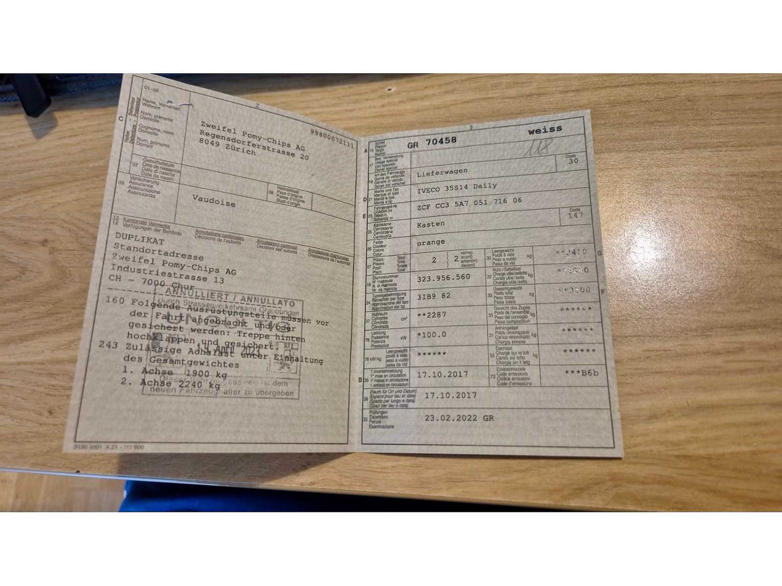 Wagen heeft papieren uit zwitserland dus moet nog gededouaneerd worden .(douane te betalen) Beschadiging voorkant (voorlicht , motorkap ,..) Geen spatborden gemonteerd Laadbak 4,2m x 2,1m Nee Merk: Iveco Type: 35S14 Model: Daily Bouwjaar: 2017 Chassisnummer: ZCFCC35A705171606 Afgelezen kilometerstand: 155514km Cilinderinhoud: 2287cc Vermogen (kW): 100kW Brandstof: diesel Datum eerste inschrijving: 17/10/2017 Aandrijving: Achterwiel Transmissie: Manueel Nationaliteit documenten: Zwitserland Stuurwiel: LHD Aantal sleutels: 1 Laadvermogen: 3500kg Emissieklasse: Euro 6 Startinformatie: Start en rijdt