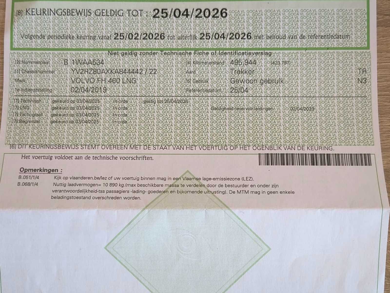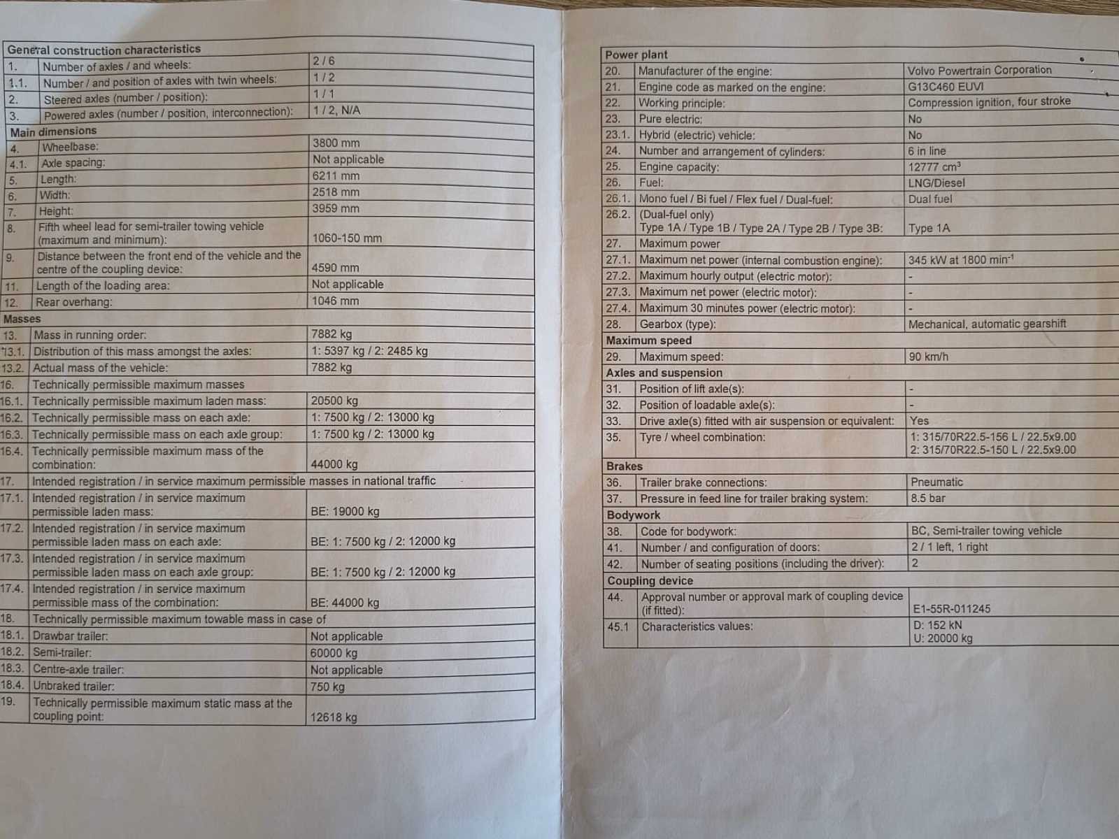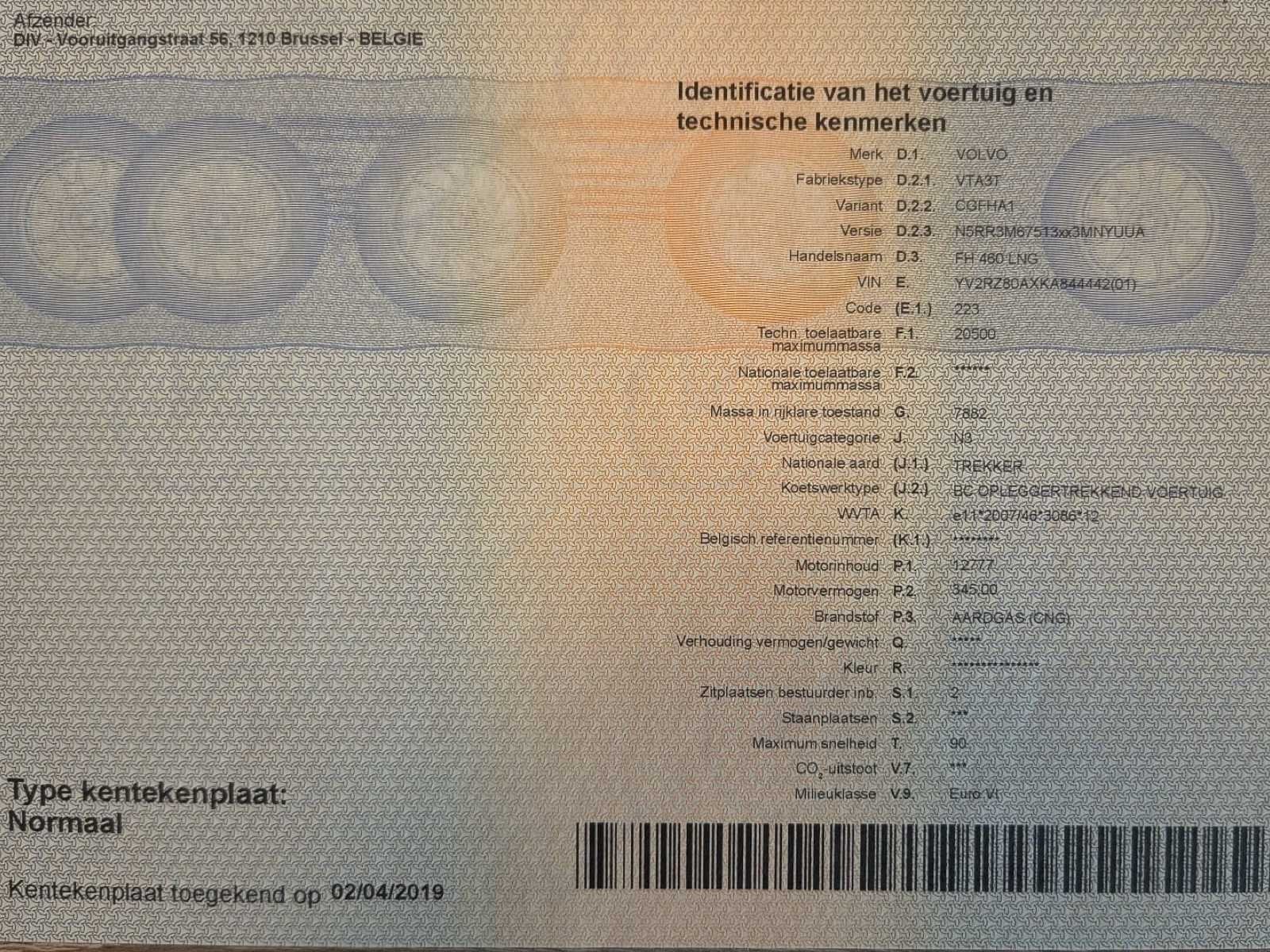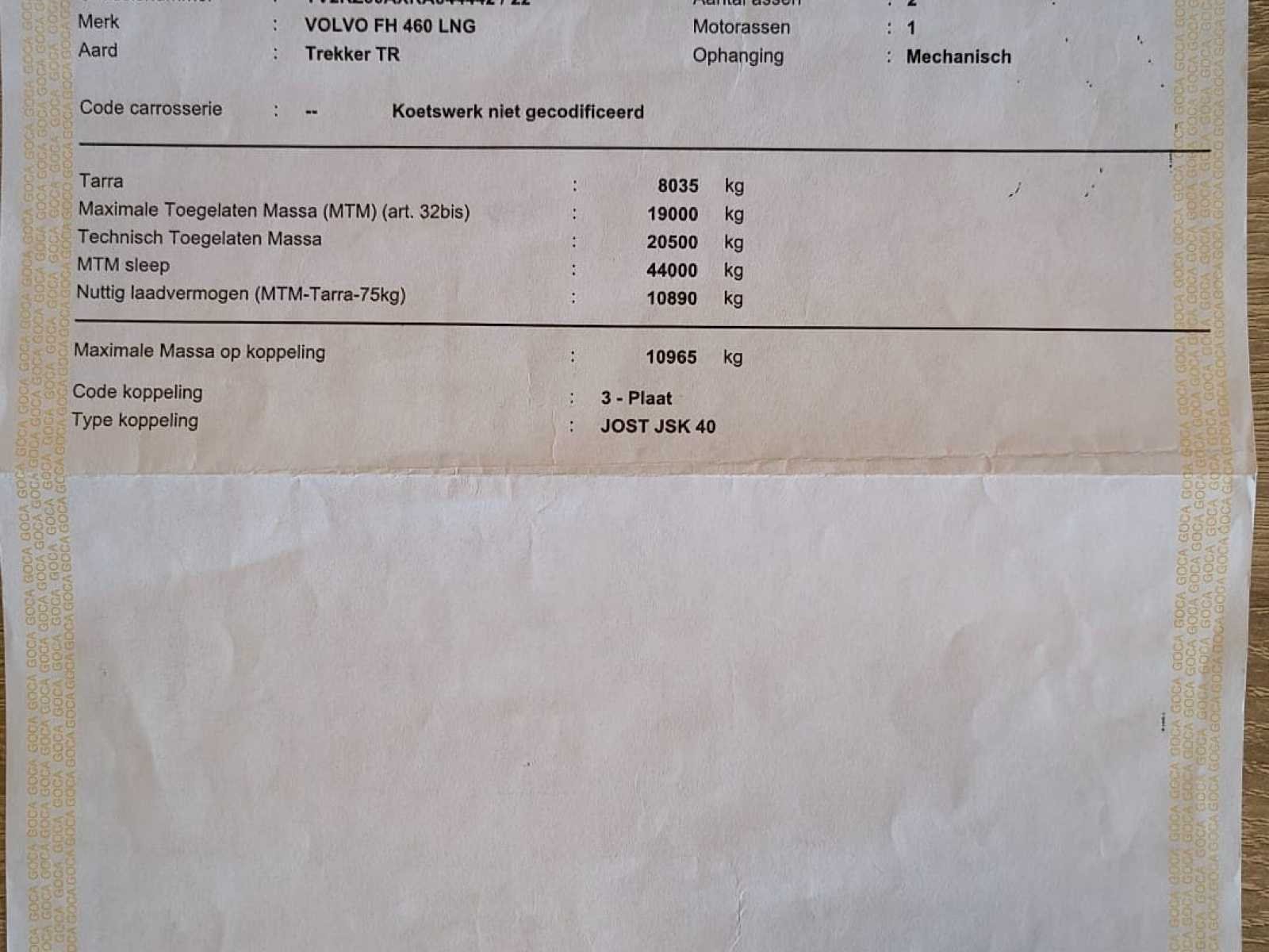Deze Volvo FH 460 LNG GlobeTrucker trekker (2019) is een moderne, duurzame en krachtige trekker, uitgerust met LNG-aandrijving (vloeibaar aardgas), ontwikkeld voor milieuvriendelijk langeafstandstransport en professionele logistiek. Dankzij de combinatie van: 470 pk sterke LNG-motor, automatische transmissie, GlobeTrucker dubbele slaapcabine, luchtvering, professionele schotelopbouw, groot LNG-bereik & Euro VI normering is deze trekker perfect inzetbaar voor: internationaal transport, green logistics duurzame distributie LNG-netwerken, fleetvernieuwing milieuzones & langeafstandstransport. De truck verkeert in professionele werkstaat, met nette cabine (stoel licht beschadigd, zie foto’s)- proper chassis, volledig LNG-systeem en volledige documentatie. Paar kleine krasjes (zie foto’s) maar algemeen zeer nette staat. - Bestuurdersomgeving: Volvo dashboard klimaatregeling met airco, Multimedia/radio, Chauffeursstoel met armleuningen, Elektrische bediening, Koelkast geïntegreerd (onder slaapgedeelte) - Chassis & uitrusting: Schotelkoppeling: JOSK JSK40 Type koppeling: 3-plaat, Lucht- en elektrische koppelingen Aluminium loopplaten Side skirts LNG veiligheidssysteem ADR-voorbereiding Professionele afwerking - Net chassis No Merk: Volvo Type: FH 460LNG Globe Trucker - Euro 6 Bouwjaar: 2019 Chassisnummer VIN: YV2RZ80AXKA844442 Cilinderinhoud: 12777cc Kilometerstand bij opname: 575643km Datum eerste toelating: 2/4/2019 Type transmissie: Automatisch Aantal assen: 2 Fuel Type: CNG Laadvermogen: 10890kg Emissieklasse: Euro 6 Slaapcabine: true Eigen gewicht: 8000kg Totale afmeting L: 6211mm Totale afmeting Breedte: 2518mm Totale afmeting Hoogte: 3959mm Nationaliteit documenten: B Kentekenpapieren compleet?: true Aantal zitplaatsen: 2 Automaat: true