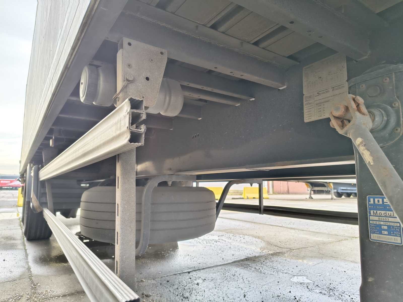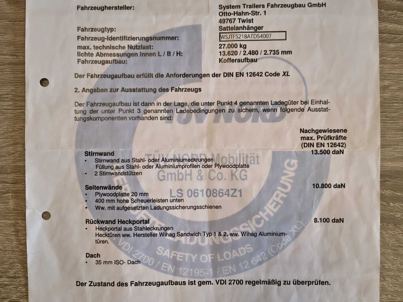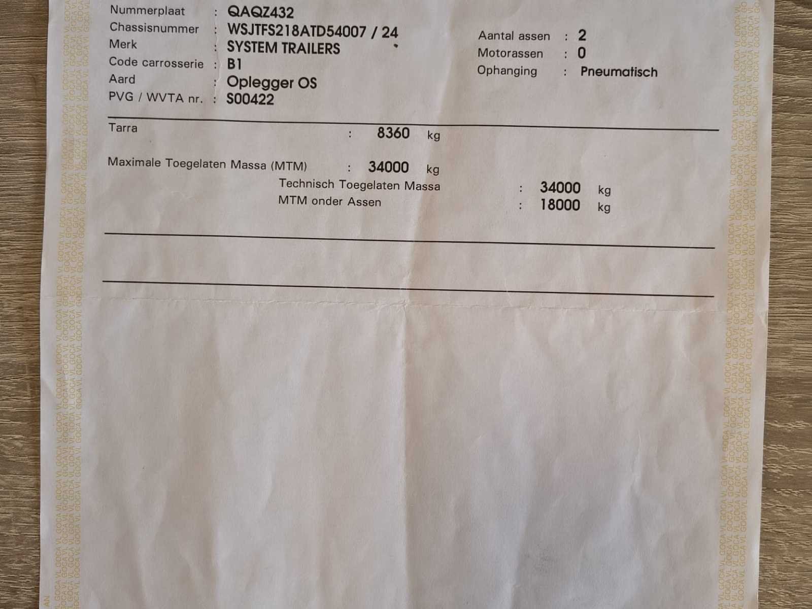 System Trailers gesloten oplegger met luchtvering en Code XL certificaat. MTM 34.000 kg, dubbelas, laadrails binnenin en laadklep aanwezig. Belgische documenten beschikbaar. Trailer vertoont gebruiks- en carrosseriesporen. Onderbouwlift werkt niet en scharnieren zitten los (zie foto's) -✅ System Trailers oplegger ✅ Gesloten boxopbouw ✅ Code XL certificaat (DIN EN 12642) ✅ Luchtvering (pneumatisch) ✅ MTM 34 ton ✅ Dubbelas uitvoering ✅ Binnenrails / sjorrails aanwezig ✅ volledige Belgische documenten aanwezig ✅ Laadklep gemonteerd ⚠️ Onderbouwlift niet werkend ⚠️ Scharnieren los — nazicht/herstel nodig No Merk: System Trailers Bouwjaar: 2010 Chassisnummer VIN: WSJTFS218ATD54007 Datum eerste toelating: 8/11/2010 Aantal assen: 2 Totale afmeting L: 13860mm
