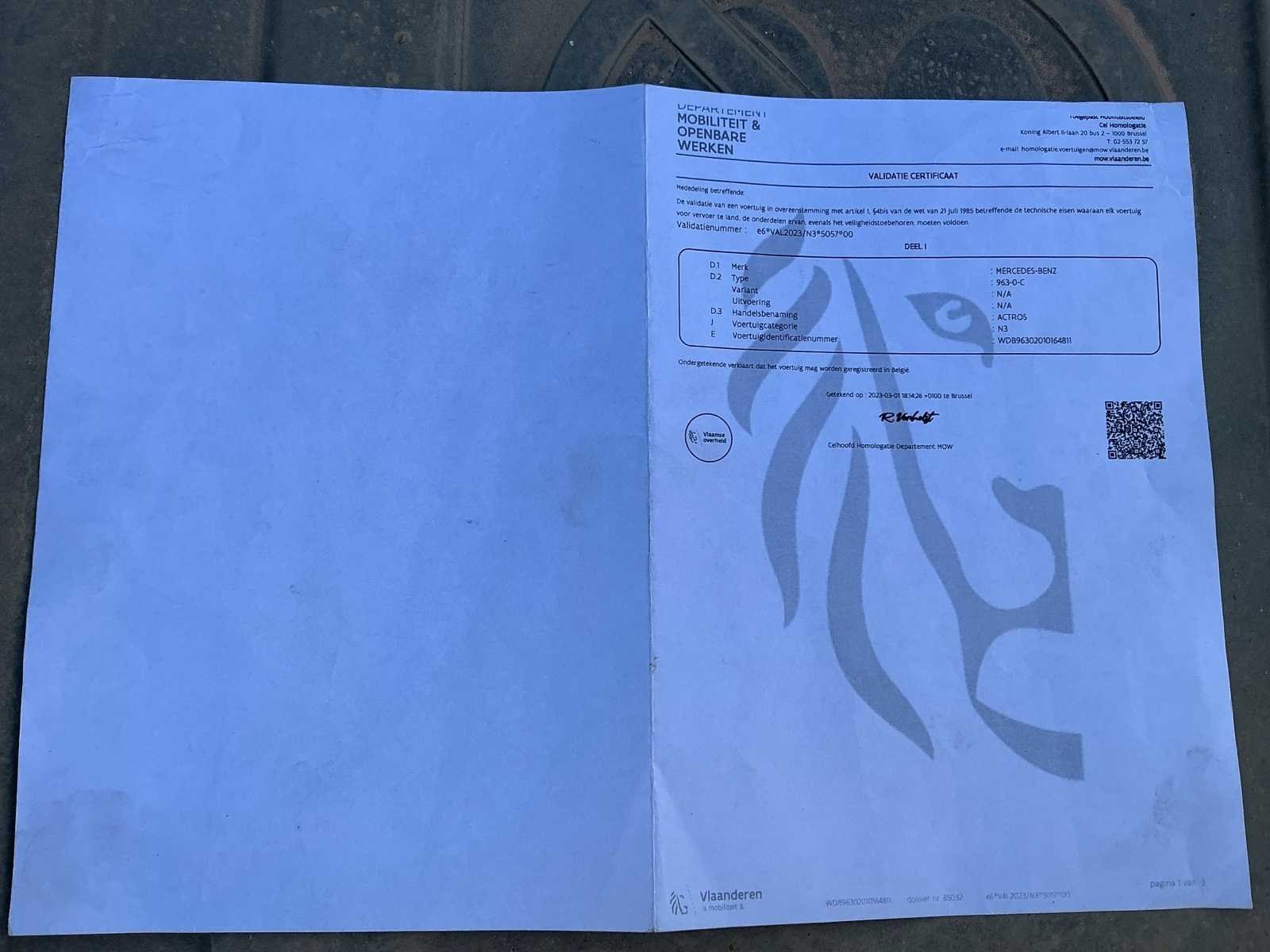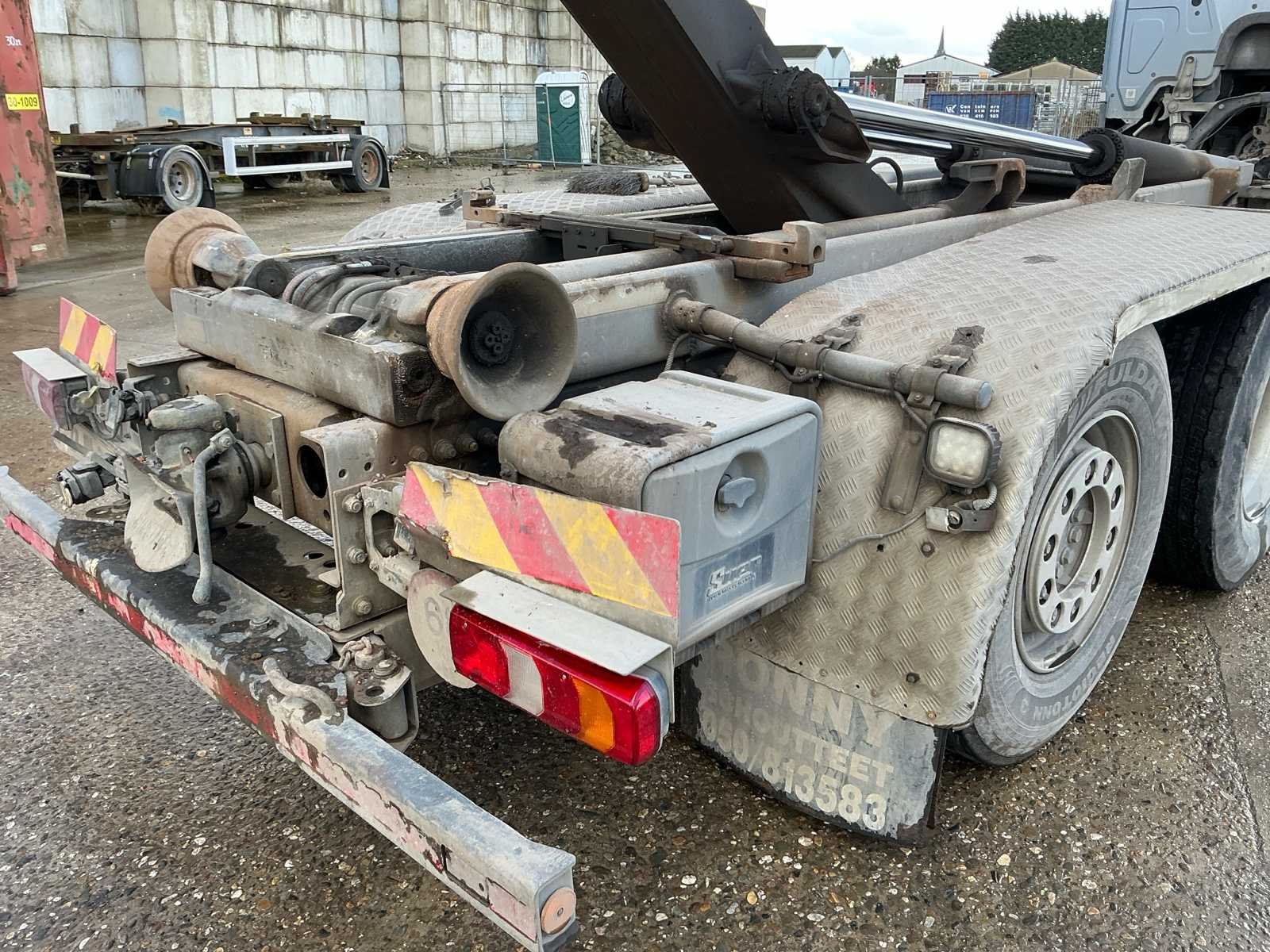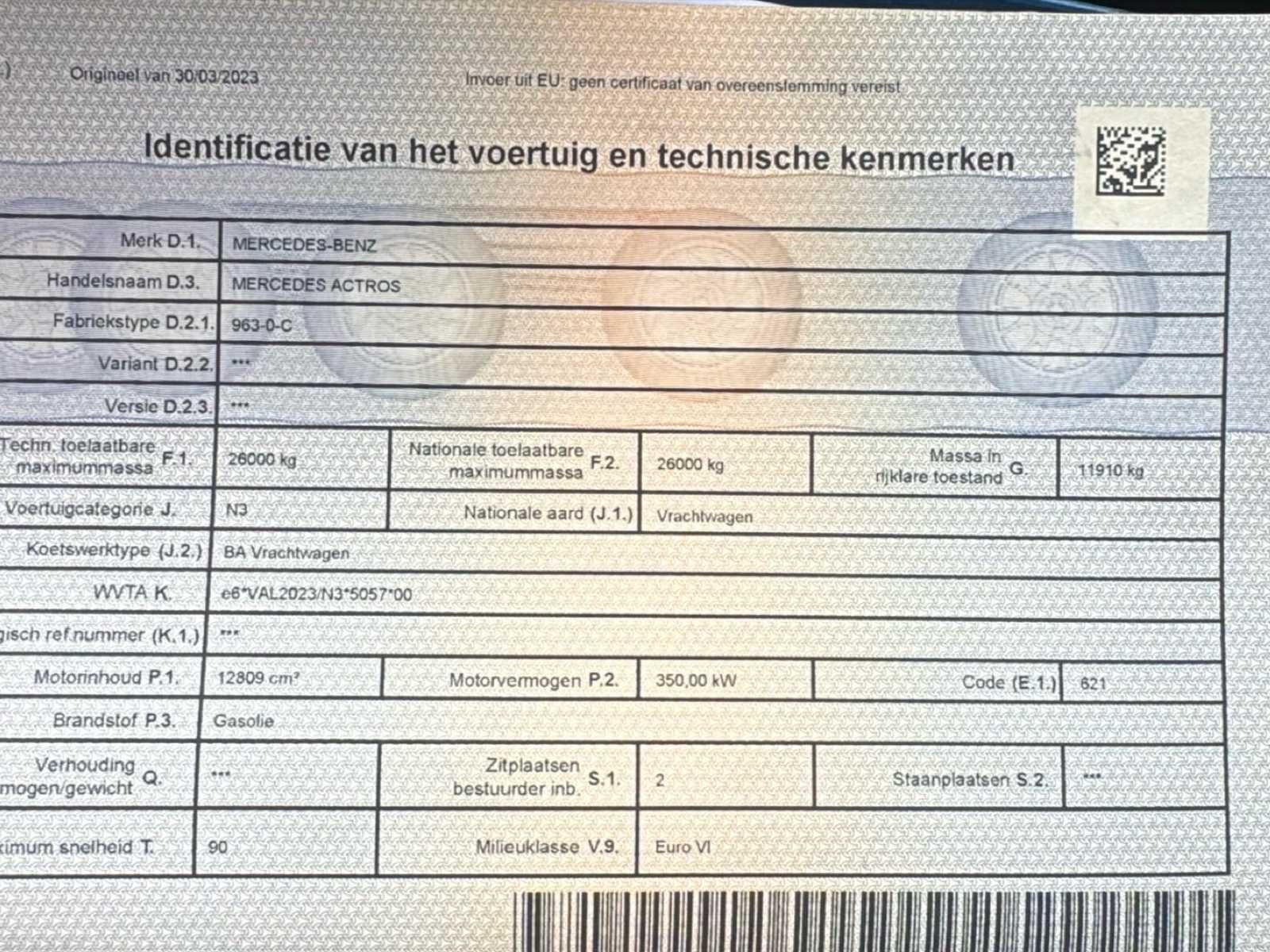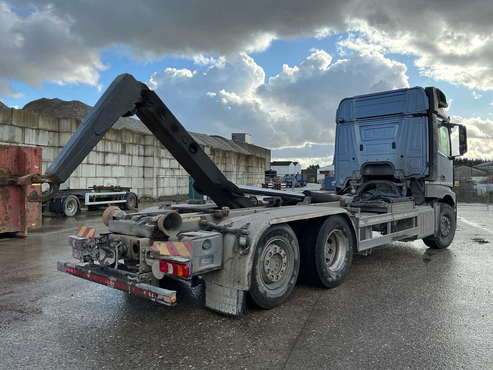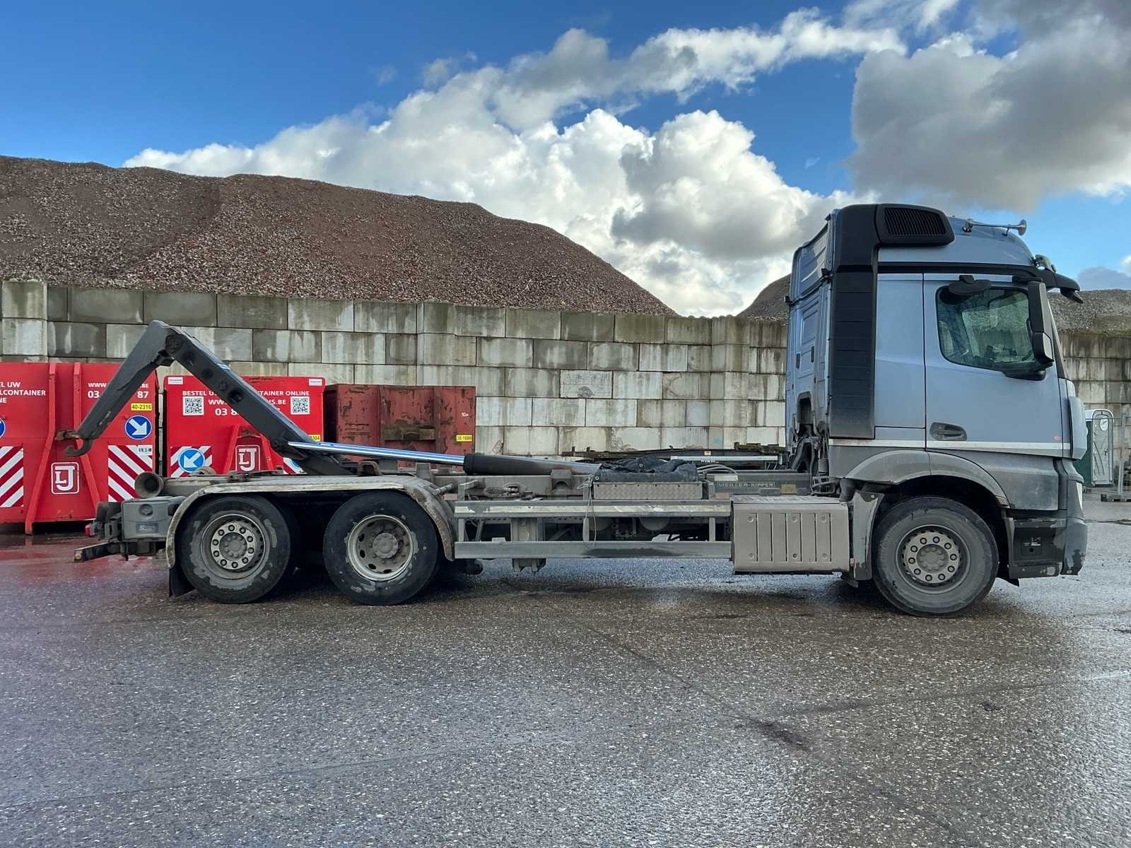 Verwarmd bed verstelbaar. Verwarmde stoelen. Pano dak elektrisch. Meiller kipper arm. Lang chassis voor containers tot 7,5m. Afsluitbare tankdoppen. Te koop aangeboden: Mercedes-Benz Actros 963-0-C, 6x2 vrachtwagen met haakarmsysteem, eerste inschrijving op 29 juni 2017. Deze robuuste en krachtige vrachtwagen is geschikt voor containertransport en zware toepassingen in bouw-, afval- en recyclagesector. Het voertuig is uitgerust met een 12.809 cc dieselmotor met een vermogen van 350 kW (476 pk). De vrachtwagen voldoet aan de Euro VI-emissienorm en heeft een maximumsnelheid van 90 km/u. De kilometerstand bedraagt 428.267 km. De technisch toelaatbare maximummassa bedraagt 26.000 kg. De massa in rijklare toestand bedraagt 11.910 kg. Het voertuig is ingeschreven als categorie N3 (vrachtwagen) en beschikt over 2 zitplaatsen. De vrachtwagen is voorzien van een hydraulisch haakarmsysteem, geschikt voor het opnemen en afzetten van containers. De constructie is degelijk en professioneel uitgevoerd. De cabine betreft een comfortabele Actros-cabine met hoge instap en ruime zichtbaarheid. De technische keuring is geldig tot 7 april 2026. Het voertuig werd goedgekeurd bij laatste keuring en voldoet aan de technische voorschriften op het moment van keuring. Op basis van de foto’s bevindt de vrachtwagen zich in gebruikte staat met normale gebruikssporen passend bij professioneel gebruik. Kleine barst in voorbumper aan passagierskant. Het roetfilter probleem wordt door de verkoper opgelost voor de verkoop. Deze Mercedes-Benz Actros vormt een interessante opportuniteit voor ondernemingen die op zoek zijn naar een krachtige en betrouwbare 26-tons haakarmvrachtwagen van een gerenommeerd merk. No Merk: Mercedes-Benz Type: Actros 963-0-C, 6x2 vrachtwagen met haakarmsysteem Bouwjaar: 2017 Chassisnummer VIN: WDB96302010164811 Cilinderinhoud: 12809cc Kilometerstand bij opname: 428267km Datum eerste toelating: 29/06/2017 Type transmissie: Automatisch Fuel Type: Diesel Emissieklasse: Euro 6 Slaapcabine: true Afgelezen kilometerstand: 428267km Nationaliteit documenten: België Kentekenpapieren compleet?: true Aantal zitplaatsen: 2 Automaat: true Diesel: true