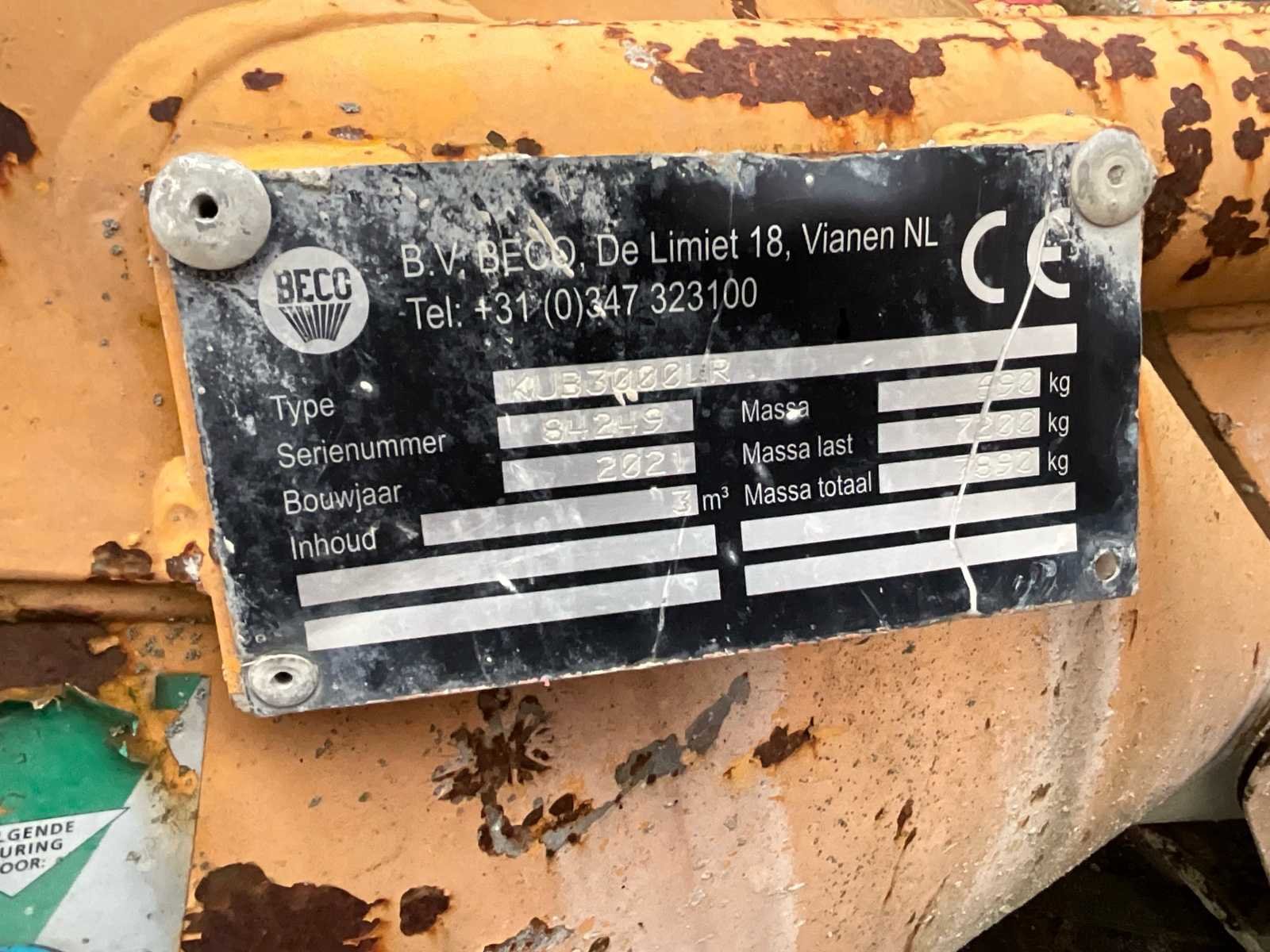 Betonstortbak / betoncontainer van het merk BECO, inhoud 3000 liter (3 m³), geschikt voor gebruik met kraan of hefmiddel. Op het typeplaatje lees ik: Fabrikant: B.V. BECO – Vianen (NL) Type: B3000LR Serienummer: SL249 Bouwjaar: 2021 Inhoud: 3 m³ Massa: ± 720 kg Massa last: ± 7.020 kg Massa totaal: ± 7.890 kg Nee Merk: Beco Type: B3000LR Bouwjaar: 2021 Serienummer: SL249 Inhoud (volume): 3m³