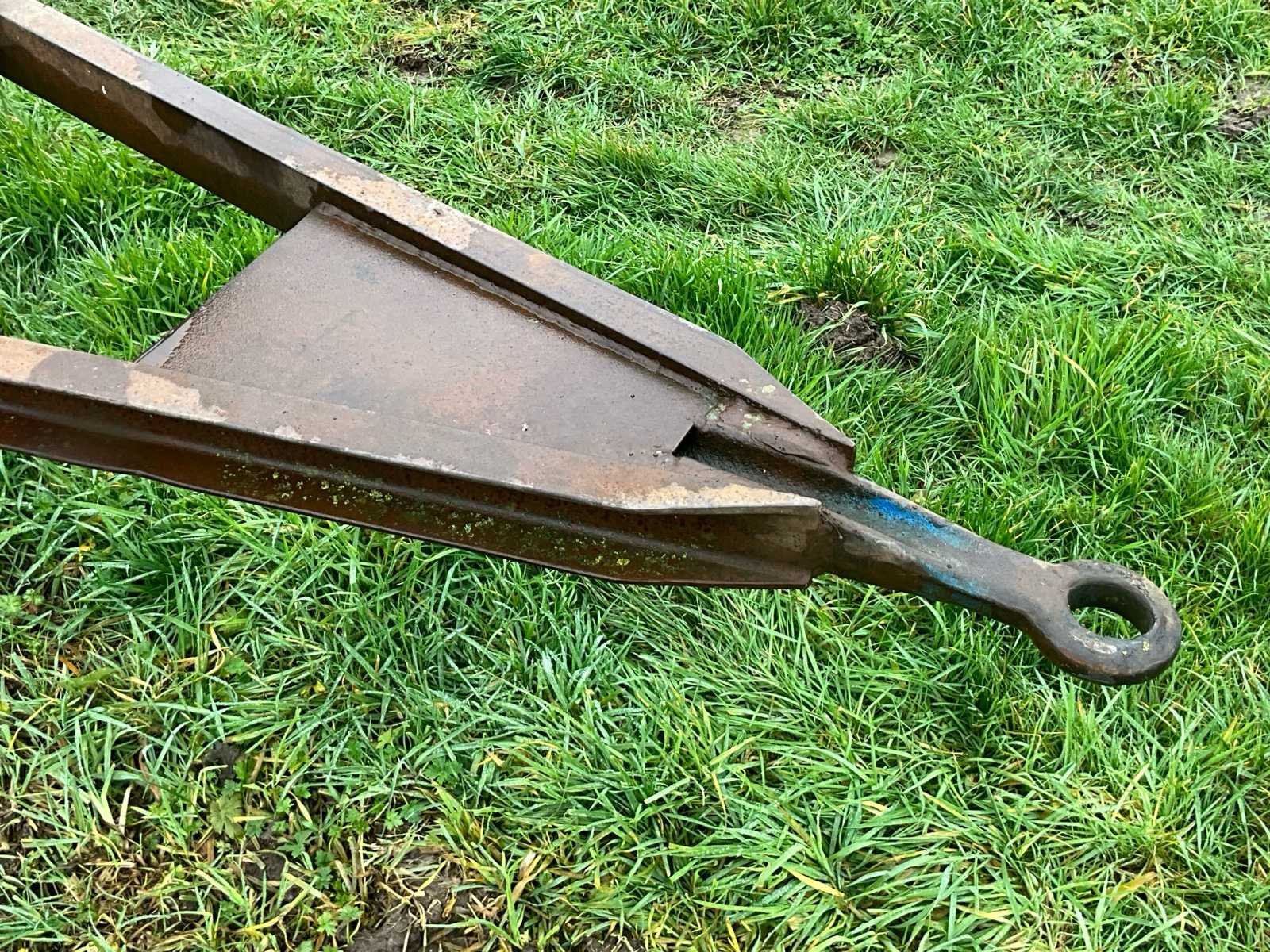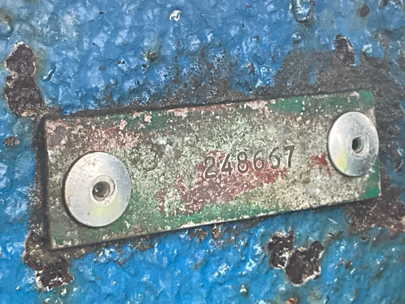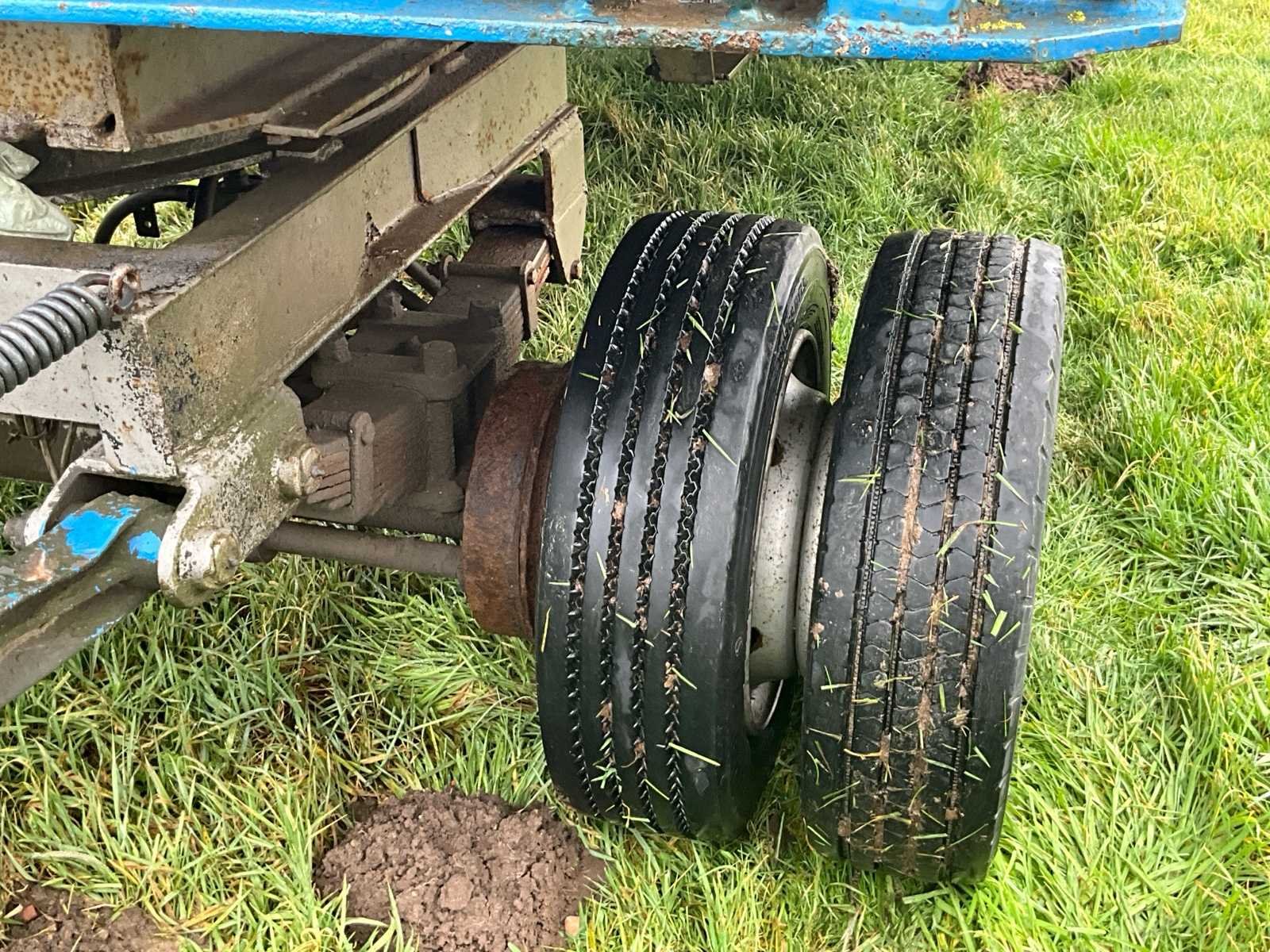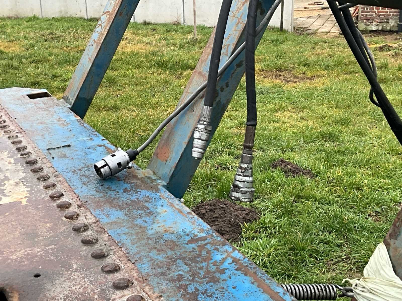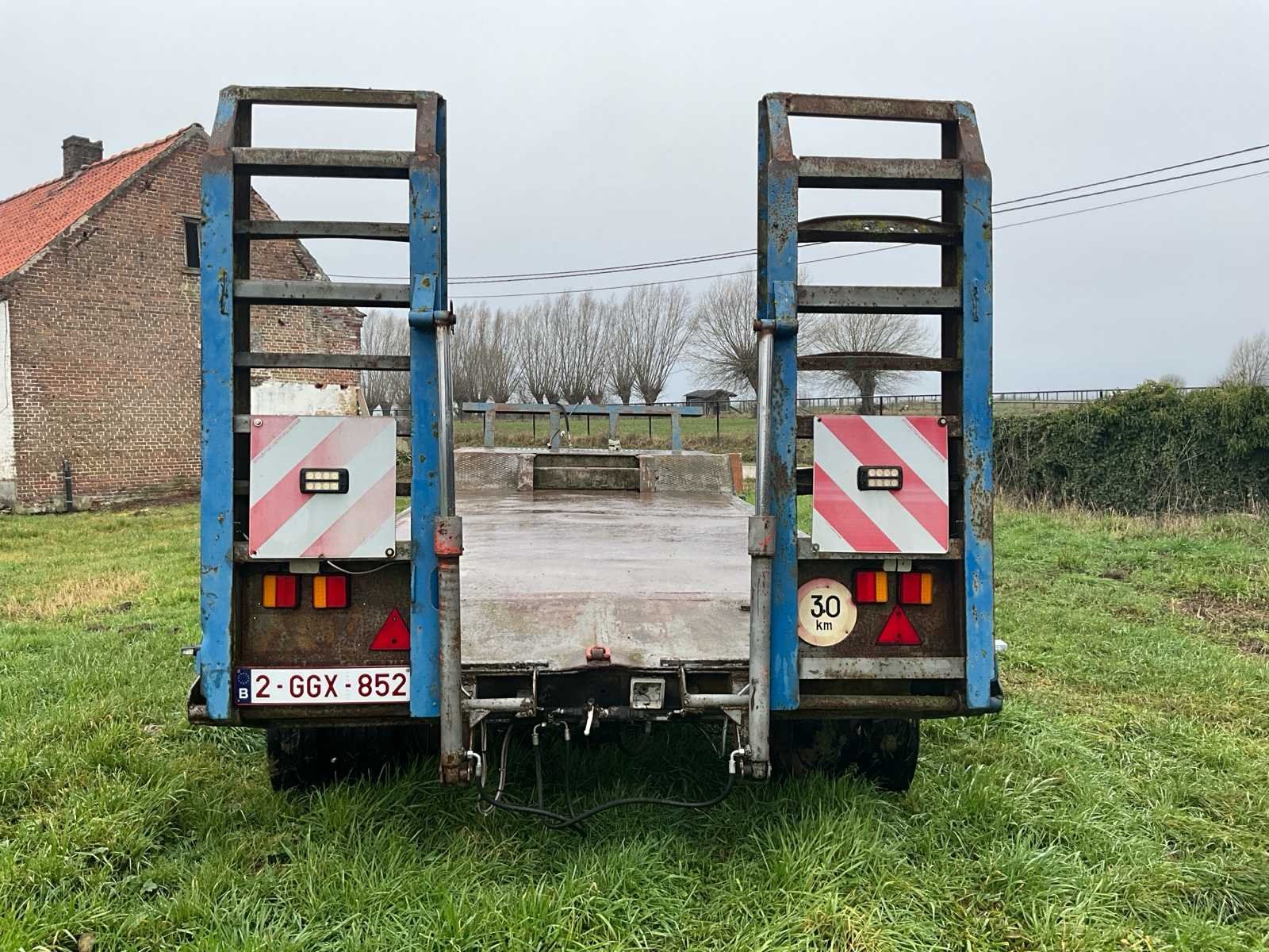 Landbouwaanhangwagen / plateauwagen • Tandem-as (2 assen, 4 wielen) • Draaikrans/stuurbare vooras → je ziet duidelijk de draaikrans en stuurstangen onder het laadplatform • Trekoog voor tractor (klassiek landbouwtrekoog, geen kogel) • Hydraulische aansluiting aanwezig (slangen zichtbaar aan de dissel) No Merk: Blumhardt