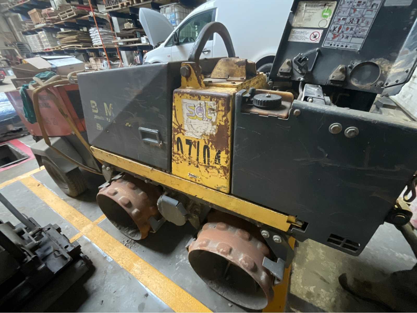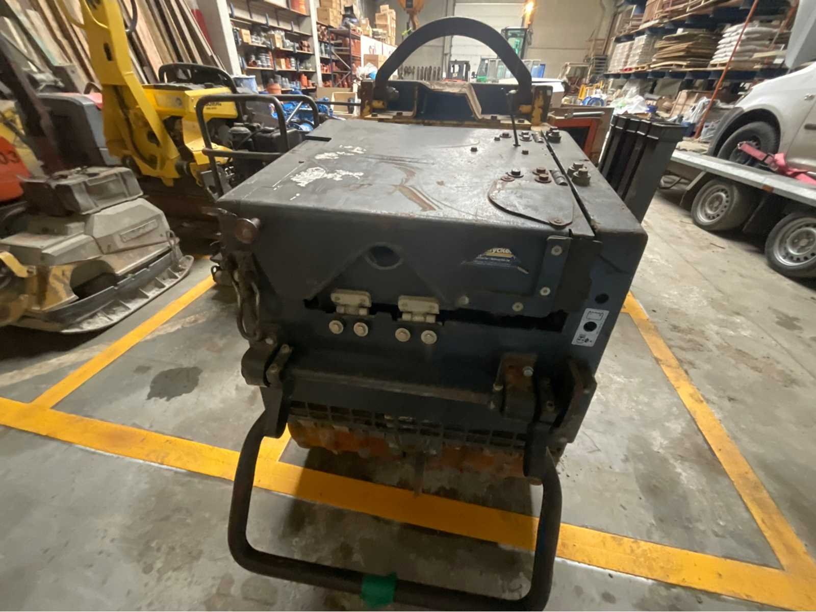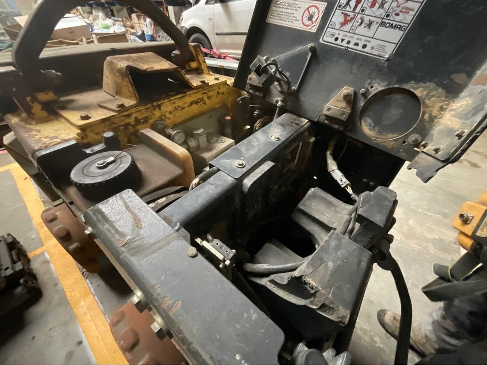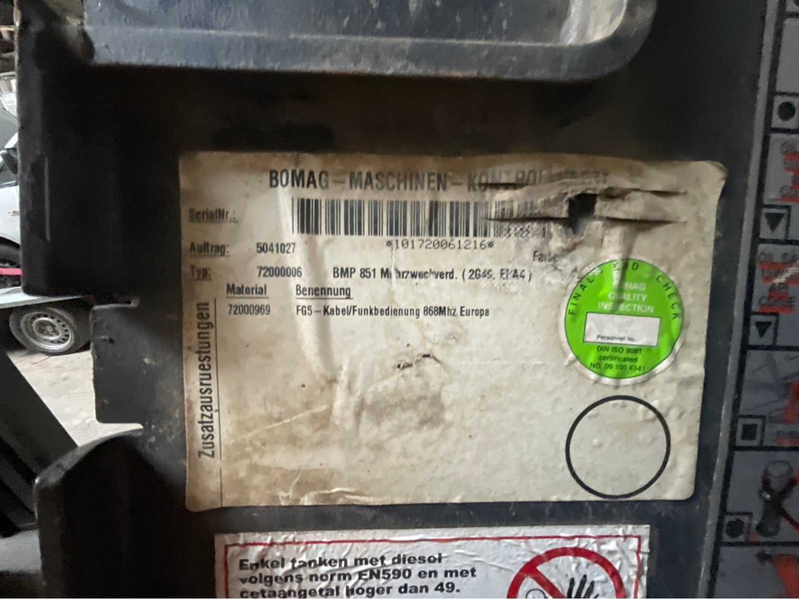 BOMAG BMP 851 Tamper – 2006 – Afstandsbediening – Diesel – 14,5 kW BOMAG BMP 851 stamper, jaar 2006, tweecilinder dieselmotor, uitgerust met 868 MHz afstandsbediening (Europa). Een machine ontworpen voor intensieve verdichting van greppels, dijken en samenhangende bodems (klei, slib). Technische kenmerken: Merk: BOMAG Model: BMP 851 Jaar: 2006 Serienummer: 101720061216 Motor: Diesel Aantal cilinders: 2 Vermogen: 14,5 kW (≈ 19–20 pk) Koeling: Lucht Start: elektrisch Afstandsbediening: FG5 – 868 MHz Werkbreedte: ± 850 mm Bedrijfsgewicht: ± 1.590 kg Roltype: 4 cilinders met padfoot Centrifugale kracht: ± 72 kN Uitrusting: Afstandsbediening inbegrepen Zijkappen openen voor onderhoudstoegang Trillend Zelfrijdend Toestel Mehrzweckverdichter versie (multifunctionele compacter) Status: Machine, met normale sporen van gebruik op de plaats: krassen, botsingen en oppervlaktecorrosie. Verkoop zoals het is. Non Merk: BOMAG Model: BMP 851 Bouwjaar: 2008 Serienummer: 101720061216 Motorvermogen (kW): 14kW Aantal cilinders: 2 Brandstof: Diesel