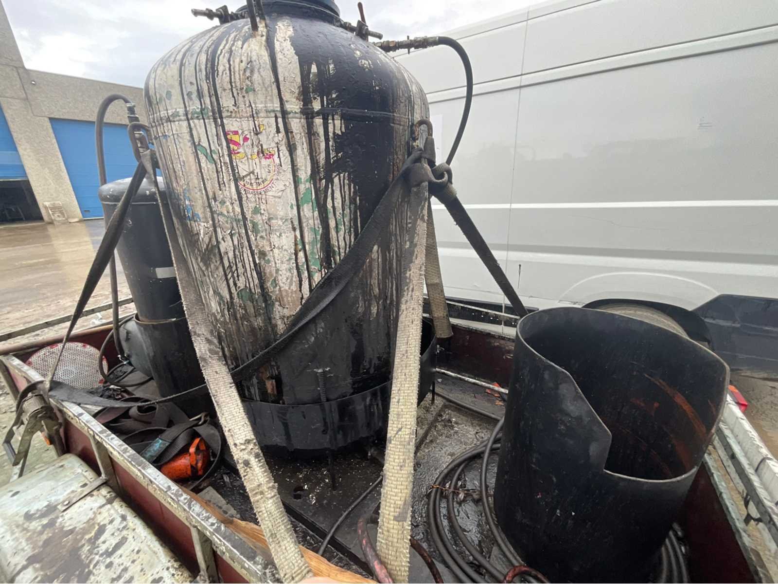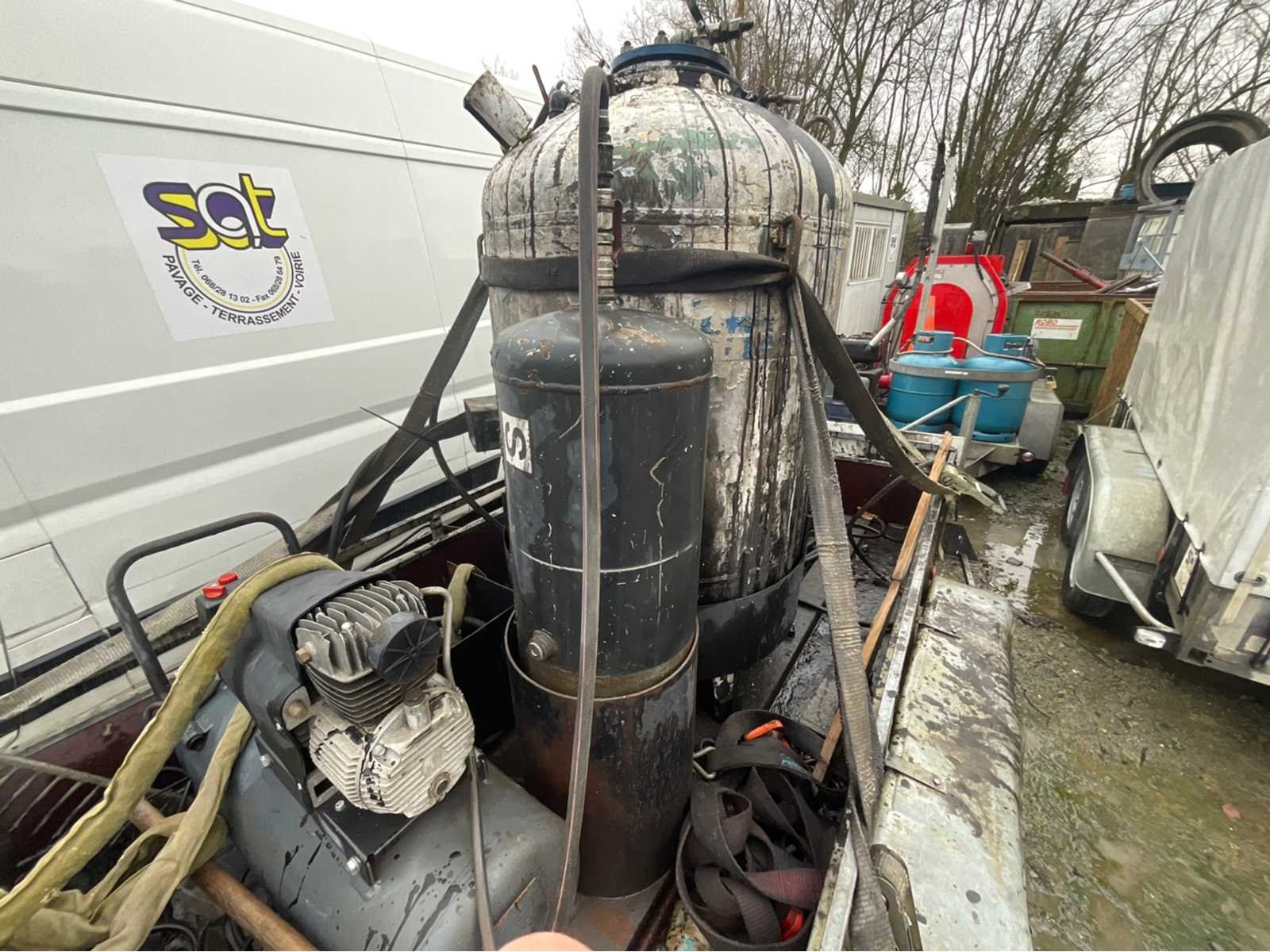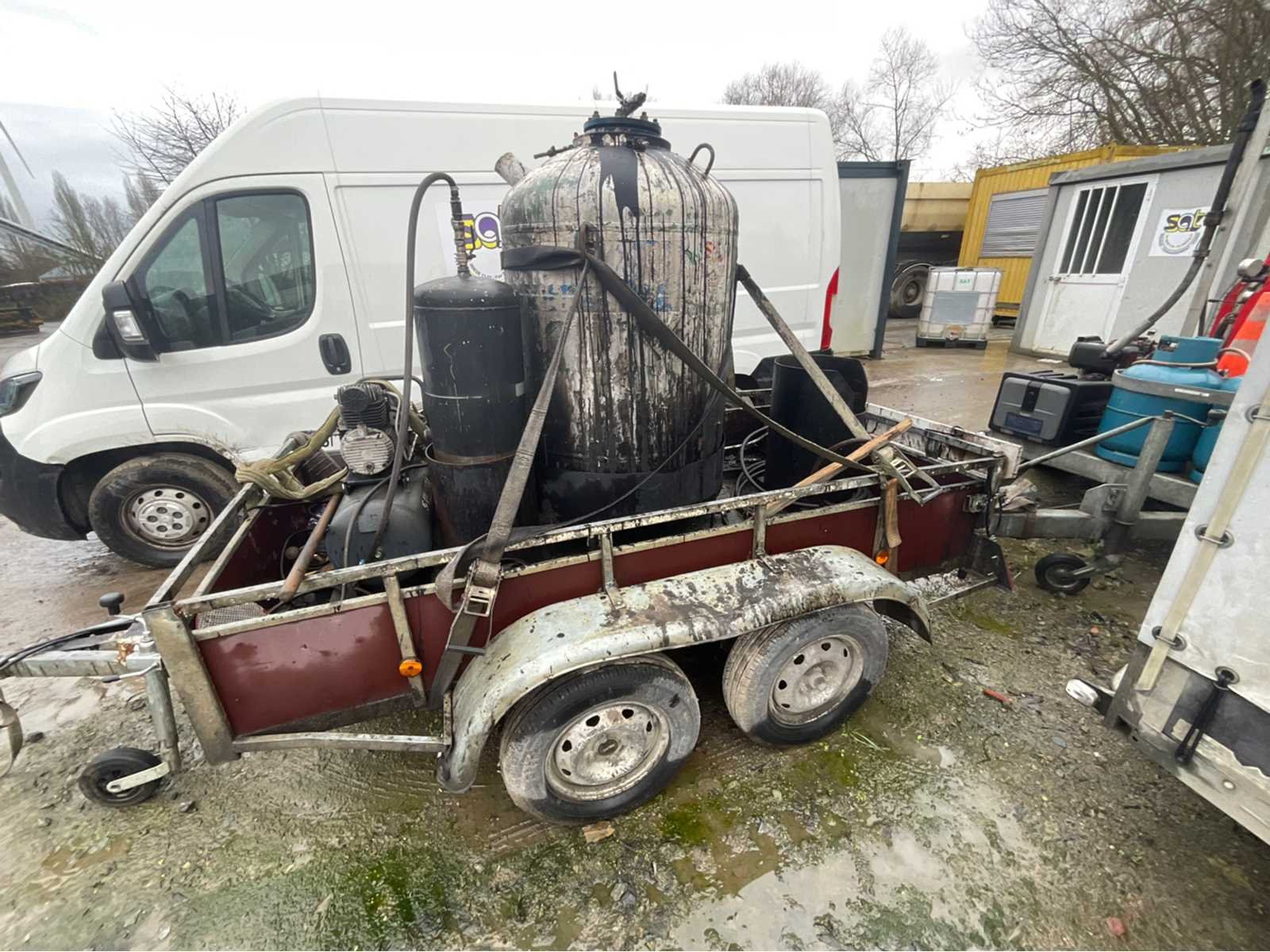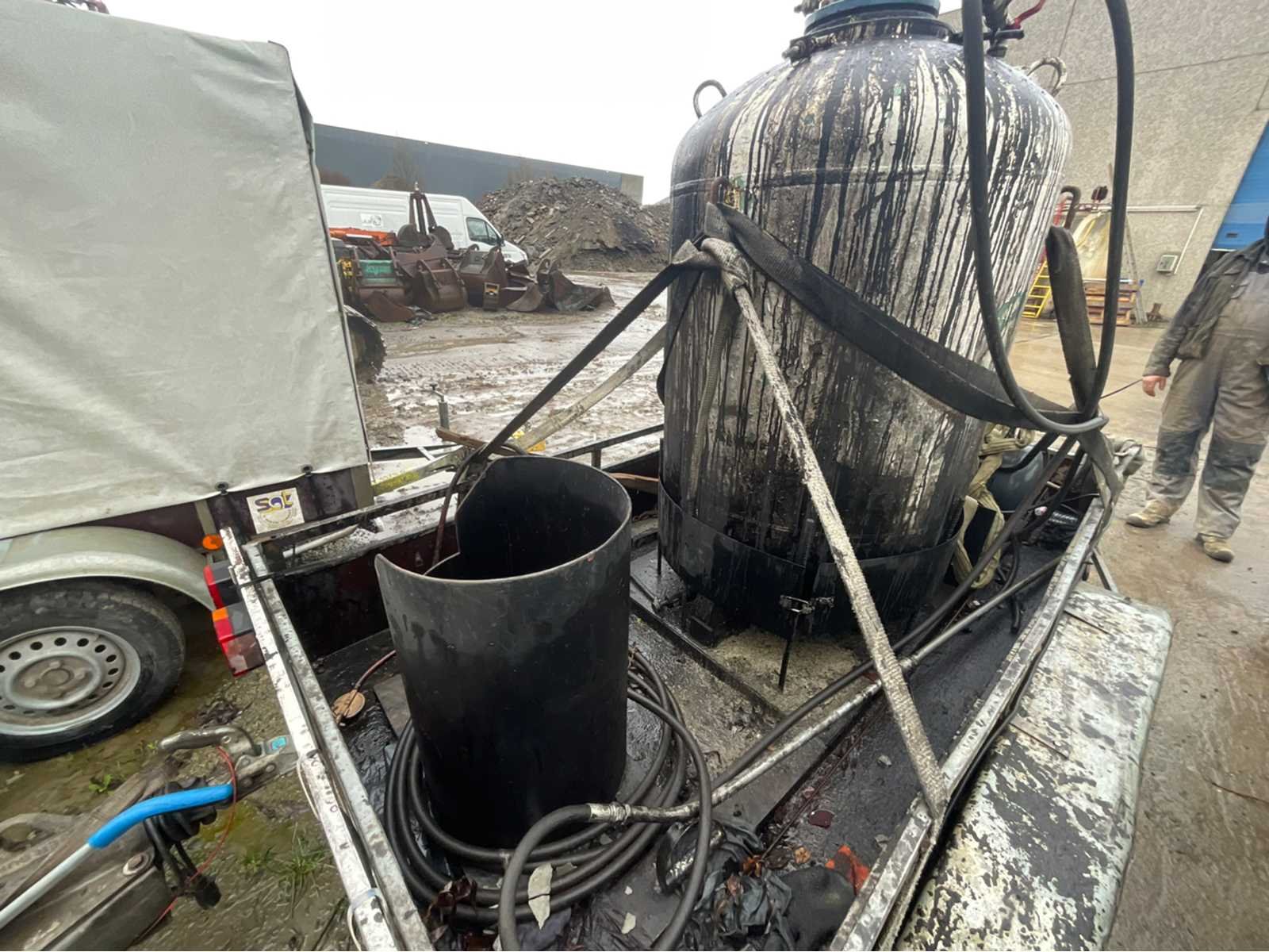 Tweeassige aanhanger-gemonteerde bitumenfoammachine Beschrijving: Tweeassige schuimstoom op een aanhanger, waaronder: Verticale stalen tank voor emulsie / bitumen Elektrische luchtcompressor Hulpluchttank Regeldrukmeter Slangen en fittingen Ondersteuningsstructuur R.W. Aanhangwagen Trailer – Type 500 – 499 kg Set bedoeld voor wegwerkzaamheden, wegreparaties of bitumineuse emulsietoepassingen. Status: Gebruikte conditie Significante sporen van bitumen / druppels Zichtbare corrosie en slijtage Ongeteste werking De installatie verkocht zoals deze is Onbevestigde naleving en drukregeling Administratieve status van aanhangwagen onbekend Notities: Schoonmaak en heringebruikstelling zijn te verwachten. Kan geschikt zijn voor renovatie, onderdelen of gebruik op de locatie. Non