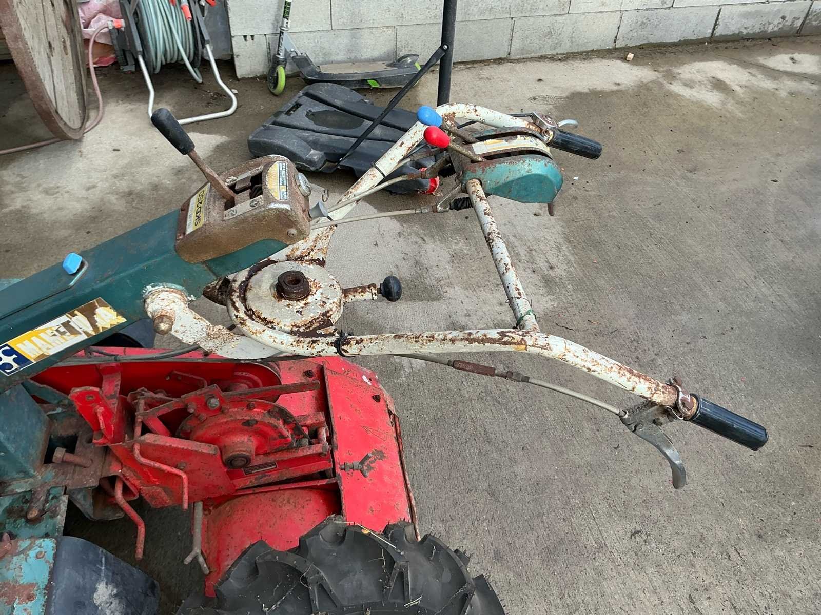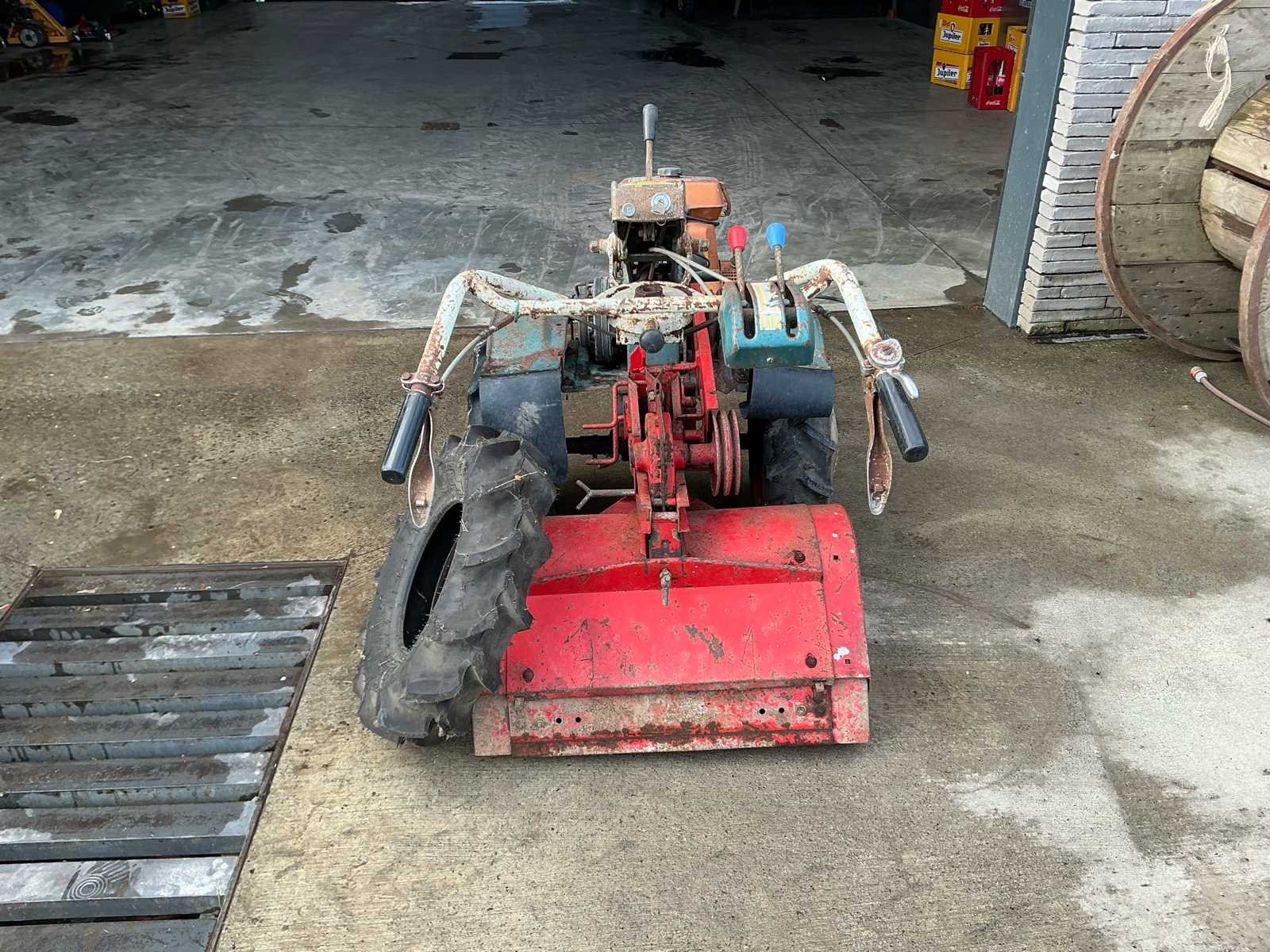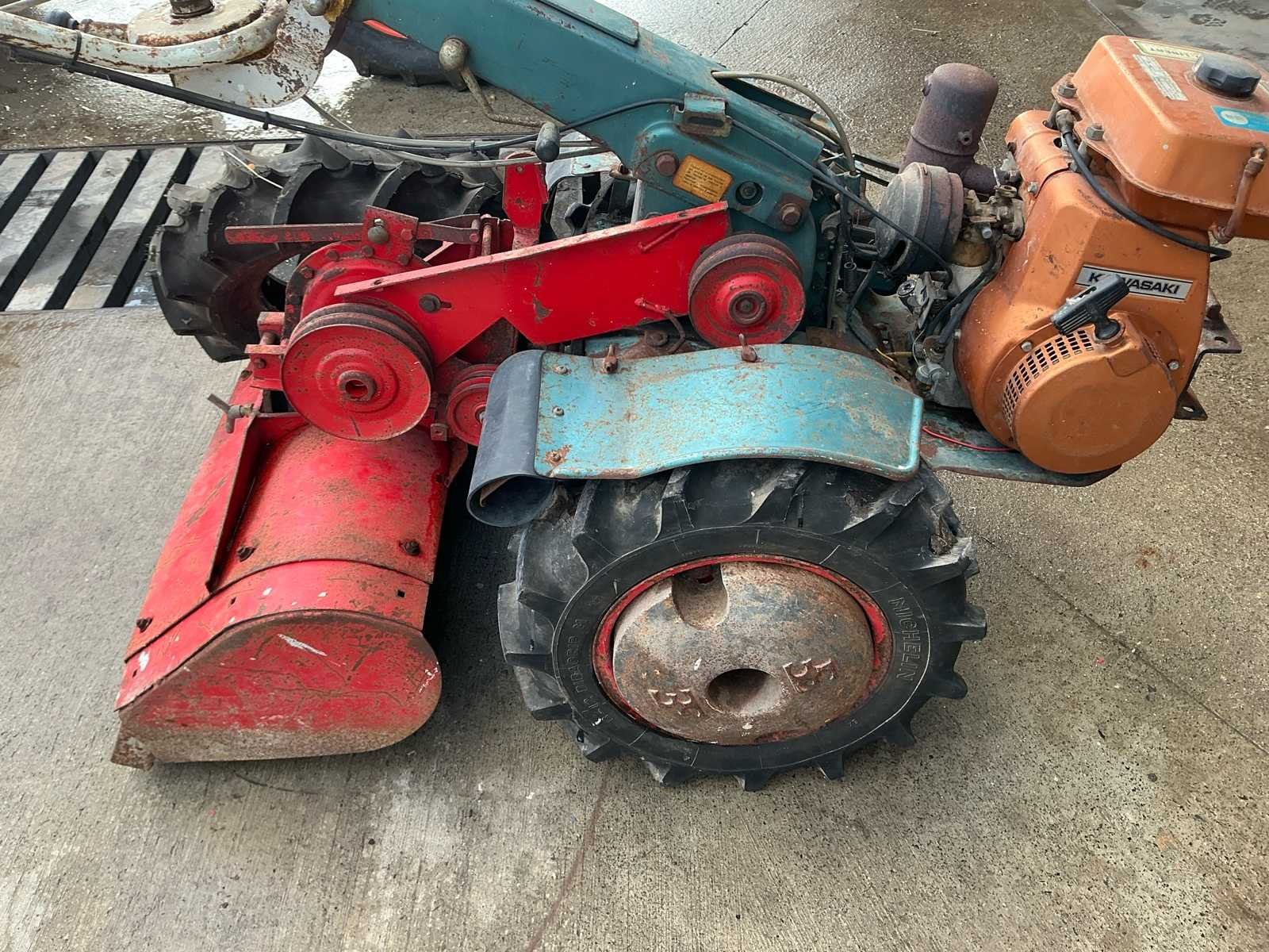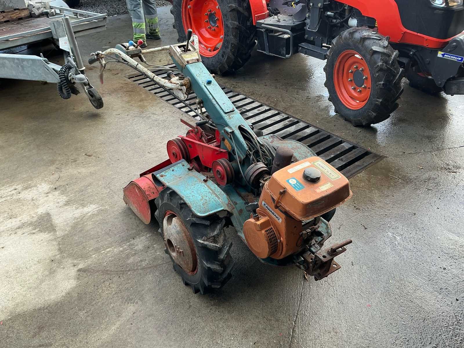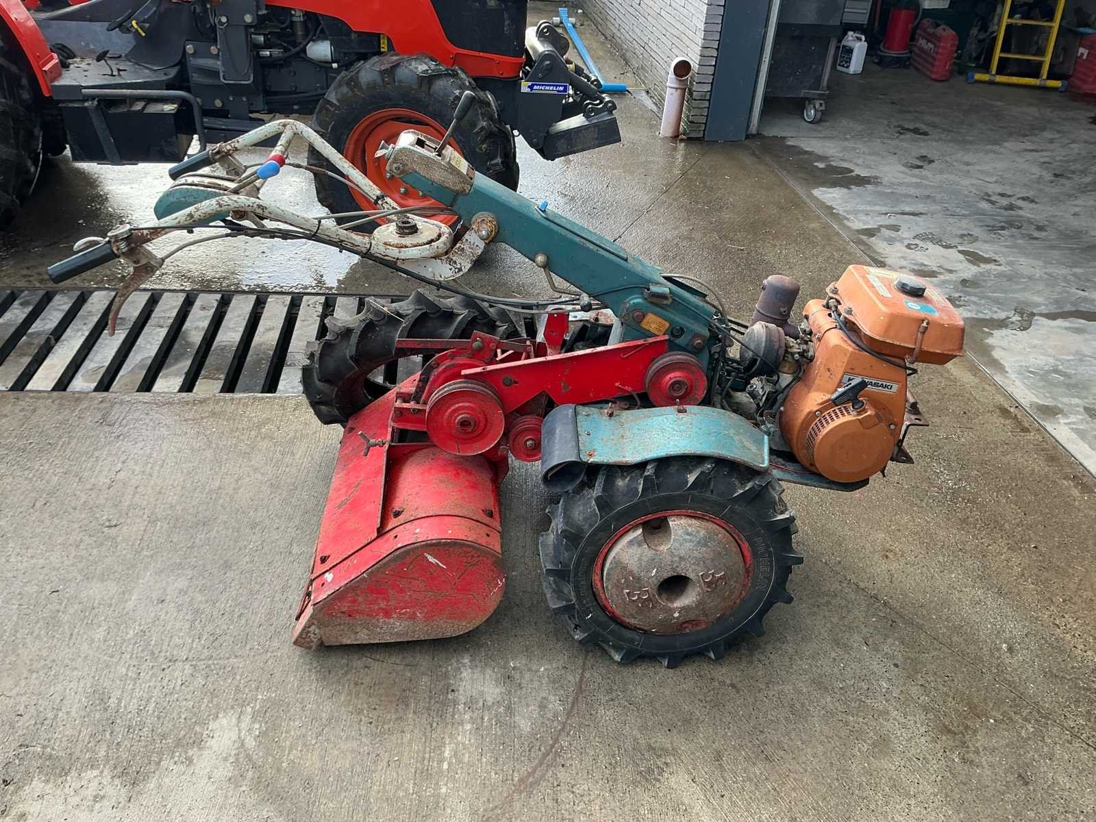 Robuuste éénassige motoculteur uitgerust met een Kawasaki benzinemotor en vooraan gemonteerde rotorfrees. Geschikt voor het frezen en bewerken van moestuinen en kleinere landbouwpercelen. Dankzij de brede landbouwbanden en mechanische aandrijving is deze machine geschikt voor zwaarder tuin- en grondwerk. Komt met reserve band. Kenmerken: • Kawasaki benzinemotor • Handbediening met versnellingen • Riem-/poelieaandrijving • Landbouwbanden met grof profiel Staat: Machine dient nagezien en gereviseerd te worden. Poelies te controleren. Riemen te vervangen. Momenteel niet werkend. No Type: motoculteur