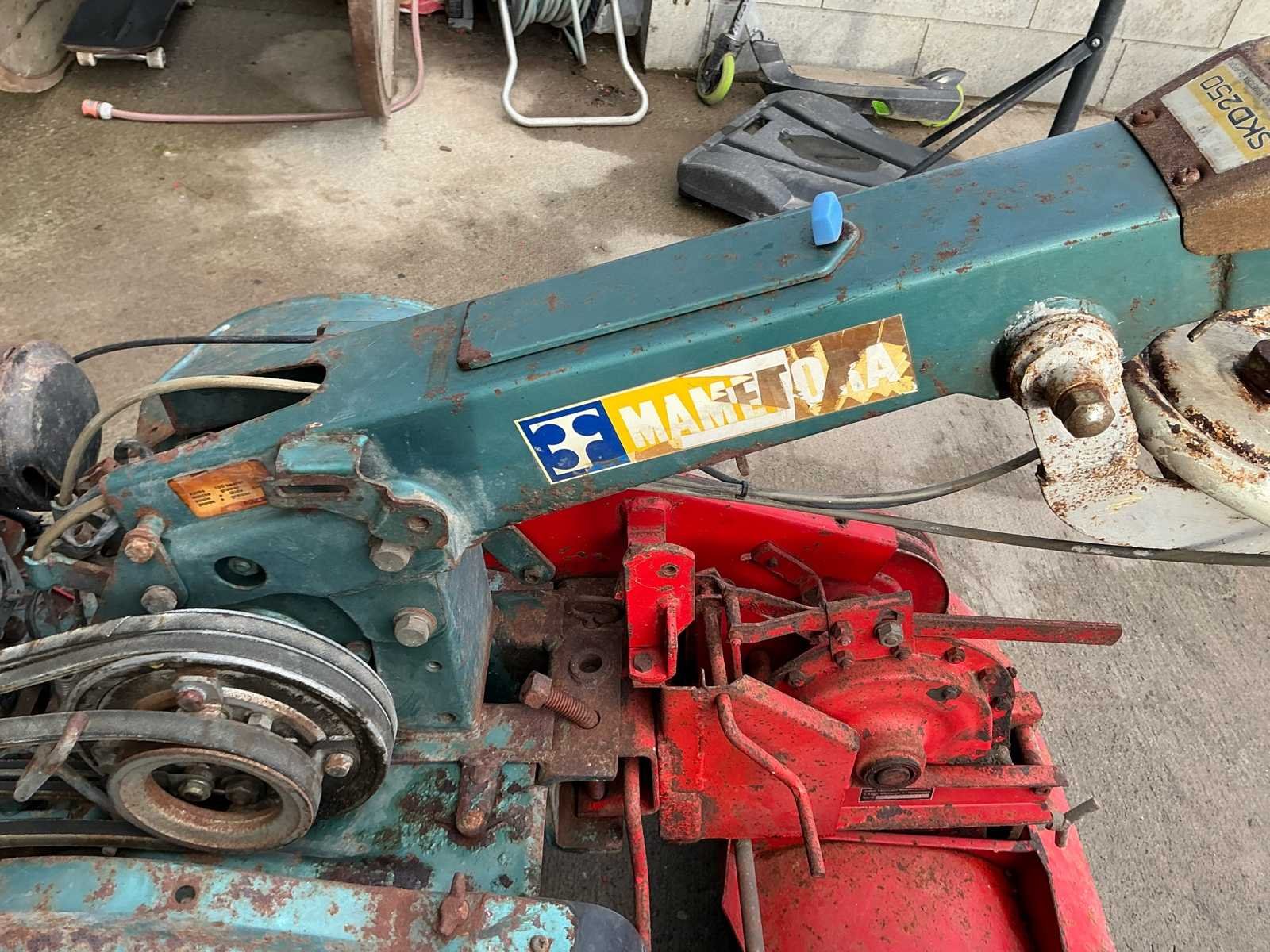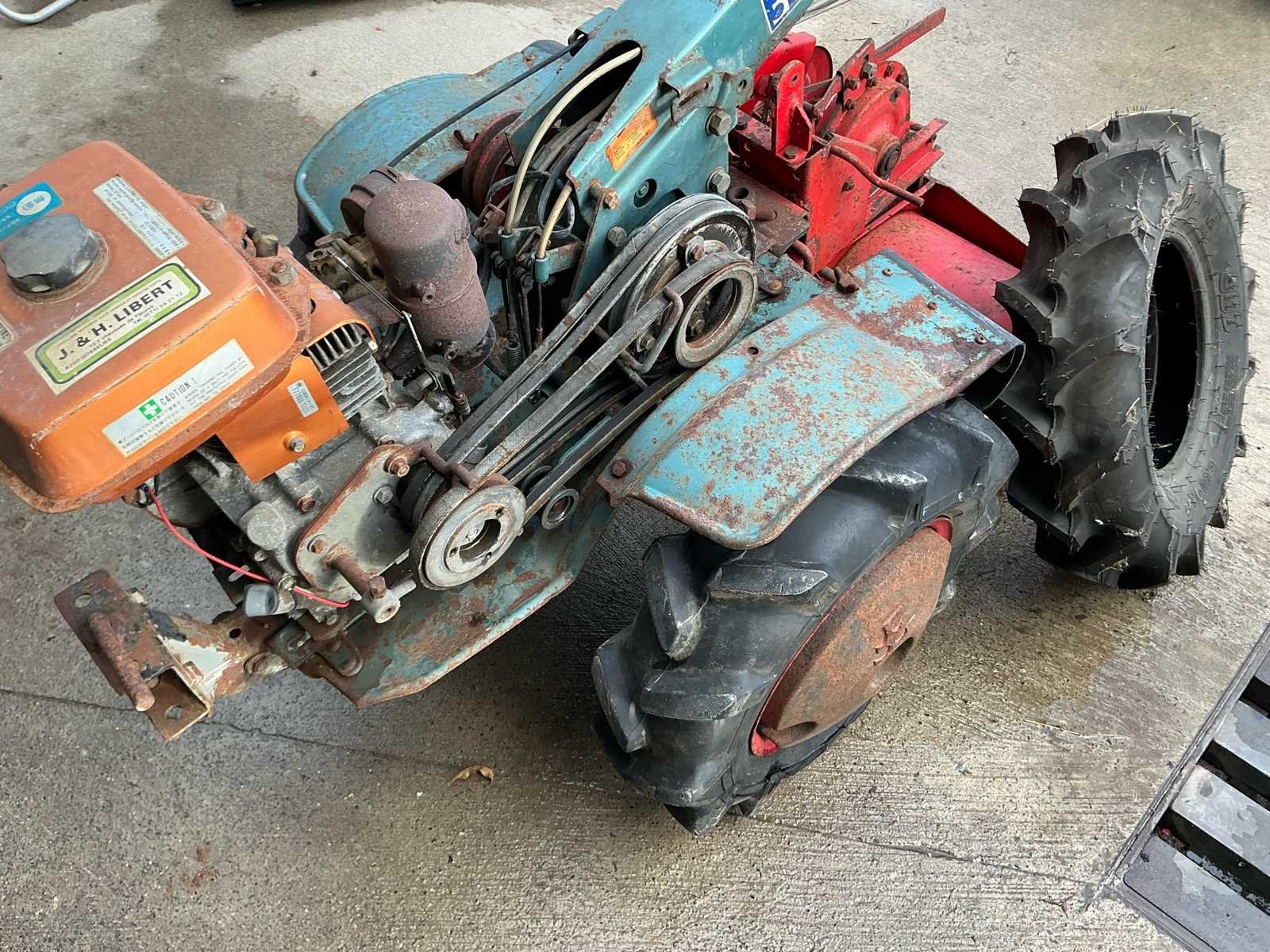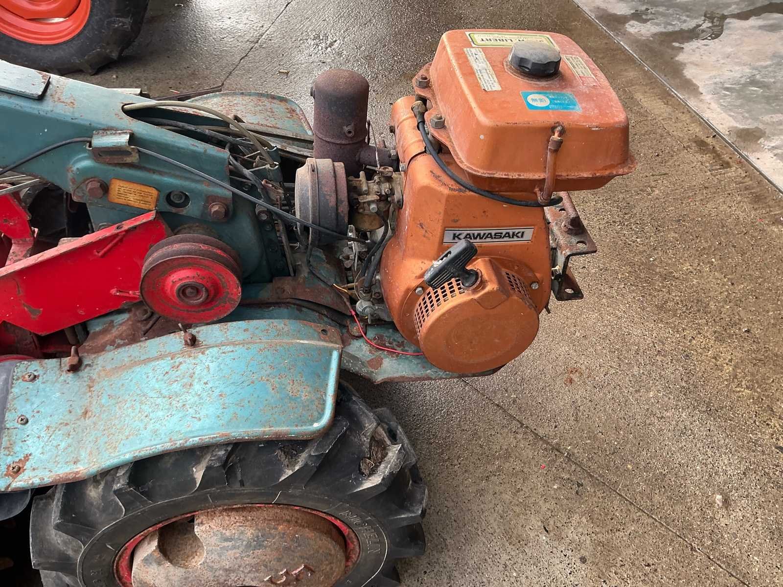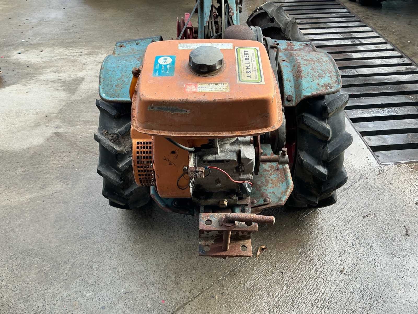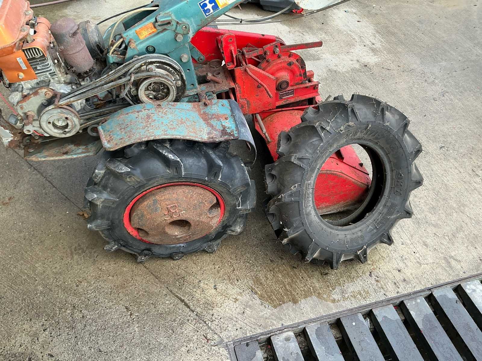 Robuuste éénassige motoculteur uitgerust met een Kawasaki benzinemotor en vooraan gemonteerde rotorfrees. Geschikt voor het frezen en bewerken van moestuinen en kleinere landbouwpercelen. Dankzij de brede landbouwbanden en mechanische aandrijving is deze machine geschikt voor zwaarder tuin- en grondwerk. Komt met reserve band. Kenmerken: • Kawasaki benzinemotor • Handbediening met versnellingen • Riem-/poelieaandrijving • Landbouwbanden met grof profiel Staat: Machine dient nagezien en gereviseerd te worden. Poelies te controleren. Riemen te vervangen. Momenteel niet werkend. No Type: motoculteur