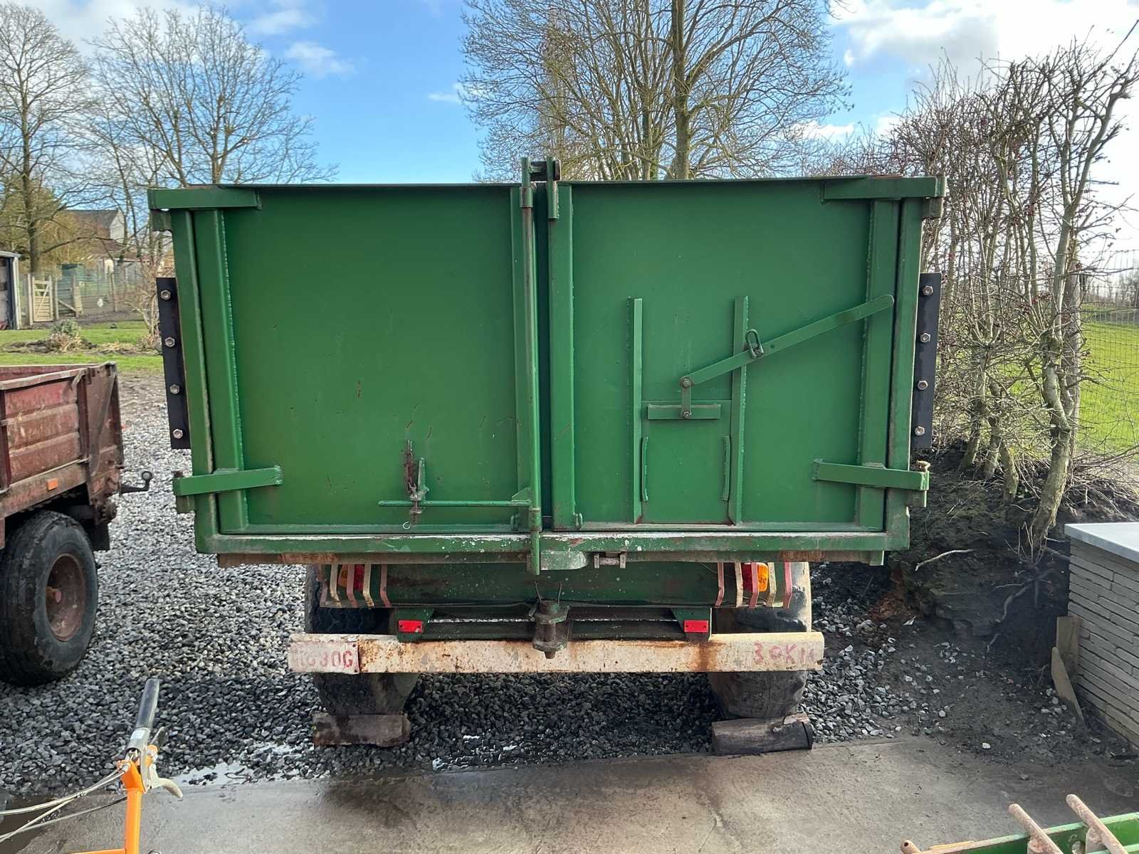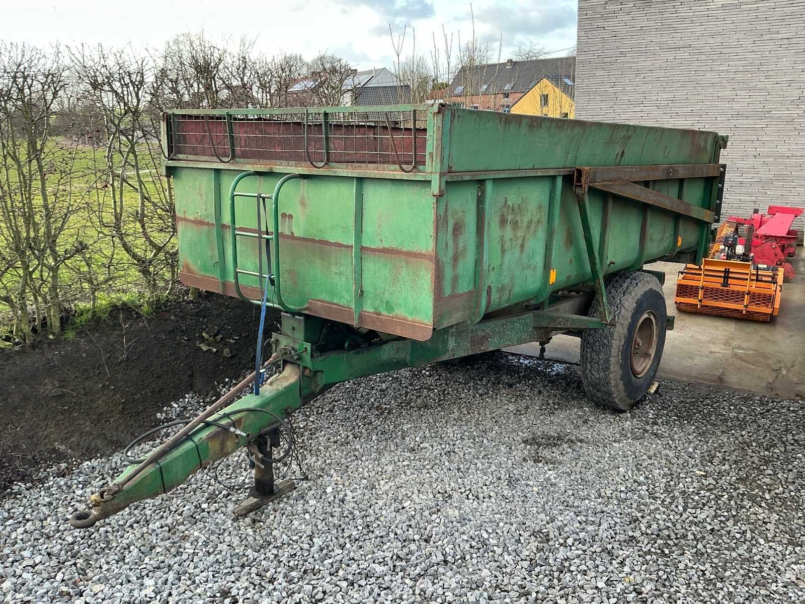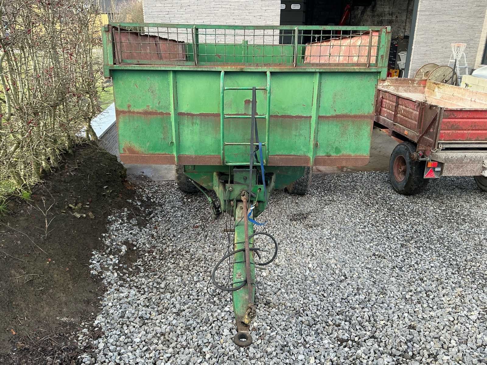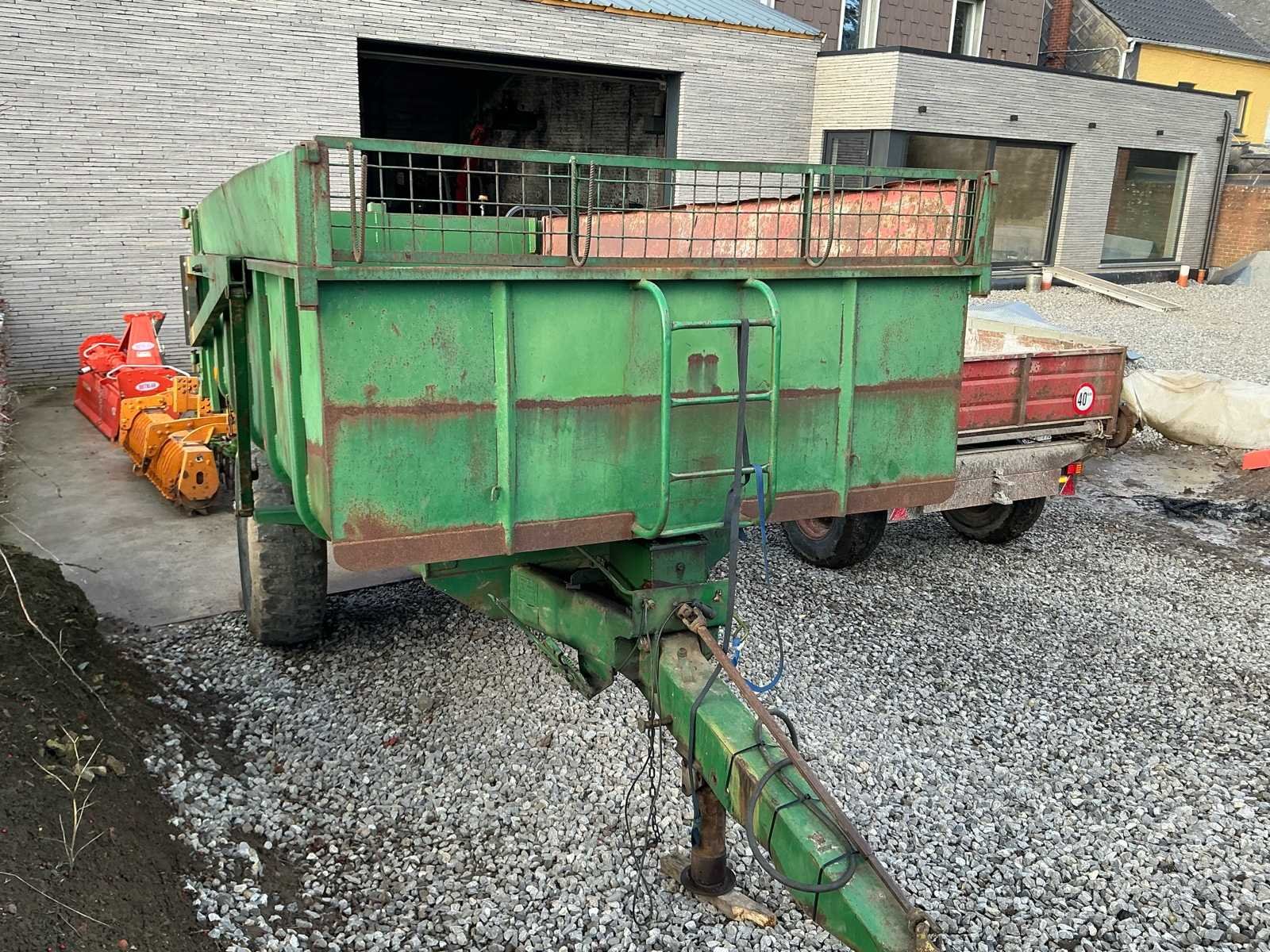 Robuuste landbouwkipwagen in degelijke uitvoering, geschikt voor transport van grond, mest, maïs, graan of andere landbouwproducten. De wagen is voorzien van een hydraulische kipinstallatie en een automatisch openende pendel-achterklep die opent bij het kippen. Uitgerust met stevige landbouwbanden en vaste dissel met trekhaakoog. Kenmerken: • Enkelas uitvoering • Hydraulisch achterover kippend • Automatische pendel-achterklep • Stevige stalen laadbak • Hoge zijborden • Vaste dissel • Verlichting aanwezig Laadruimte: Ruime laadbak met stalen bodem en hoge zijwanden. Staat: Gebruikte staat met normale gebruikssporen en oppervlakteroest passend bij leeftijd en gebruik. Constructief degelijke wagen. Documenten niet aanwezig, zwaai/valklep is gereviseerd. No Merk: Duchesne Type: Kipper met zwaai/valklep