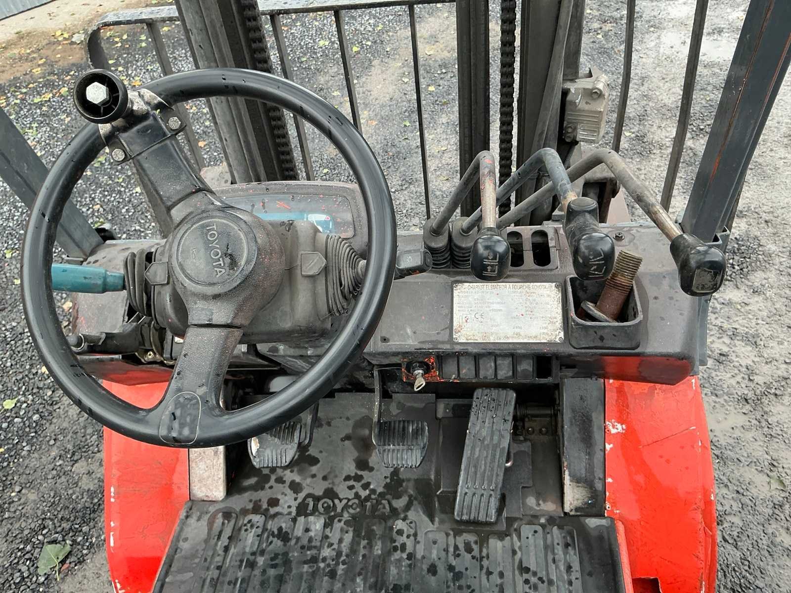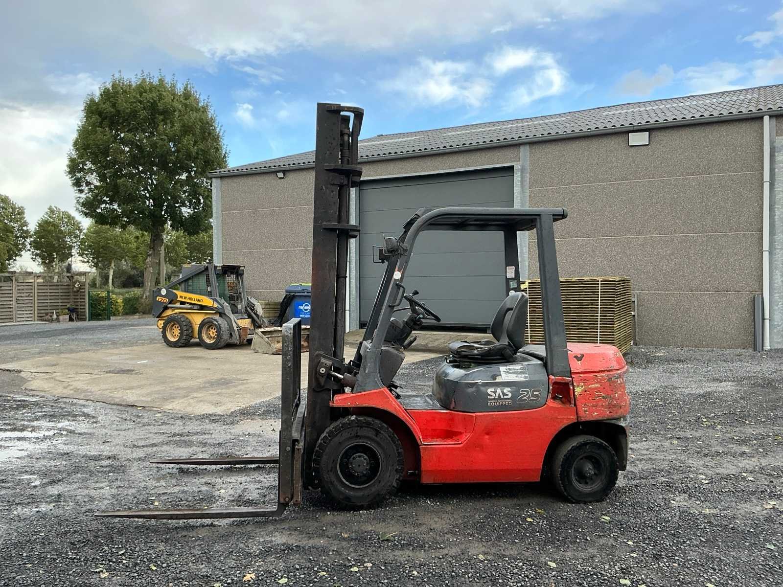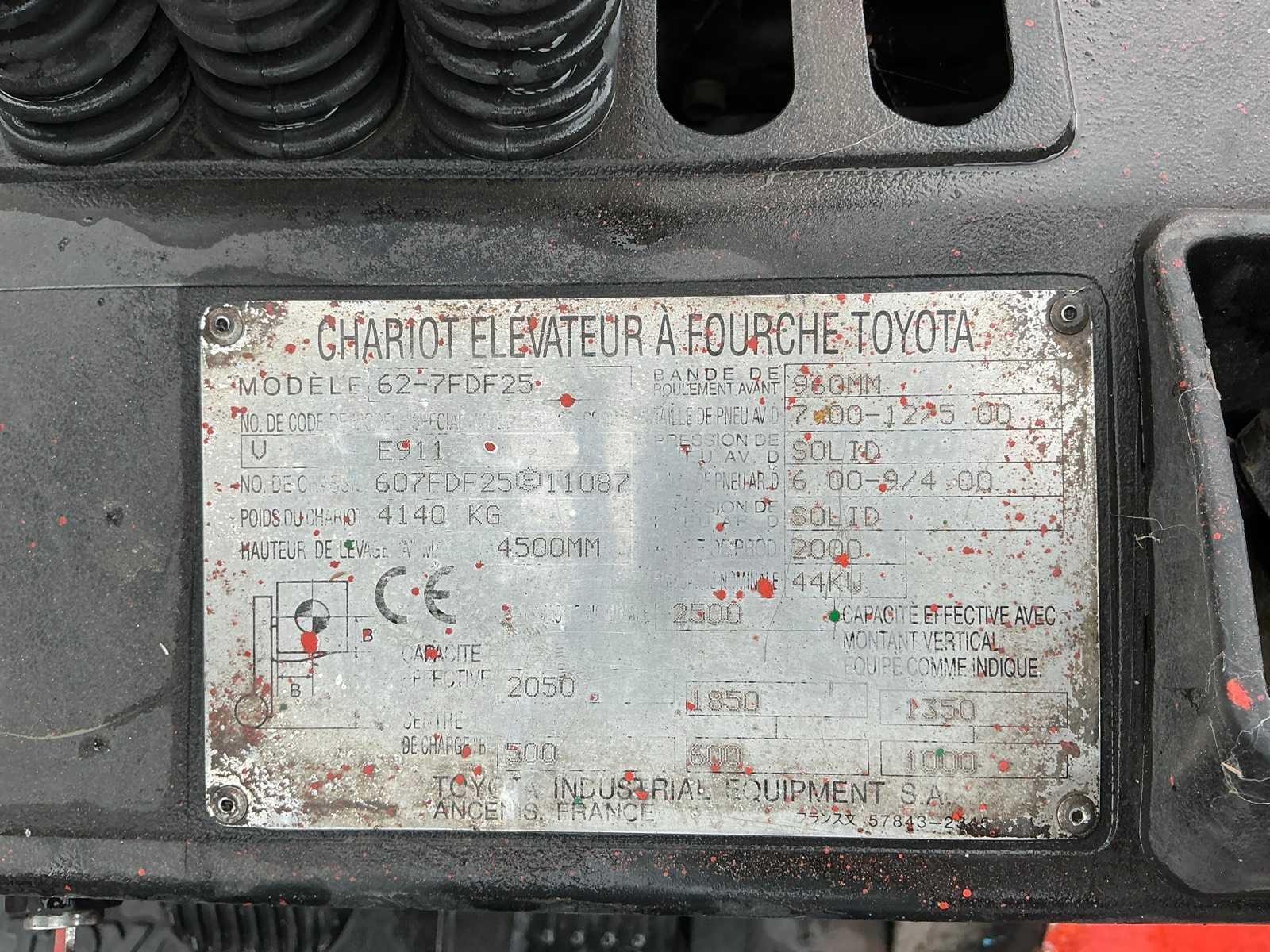 Maximale afstand tussen lepels: 1250mm , overmeten 1500mm Nee Merk: Toyota Type: 62-7FDF25 Bouwjaar: 2000 Brandstof: Diesel Mast: Duplex Soort band: Volrubber banden Aantal wielen: 4 Side-shift: true Duplex mast: true Hefvermogen: 2050kg Lepellengte: 1150mm Max. hefhoogte: 4600mm Vol rubber banden: true Minimale doorrijhoogte: 2800mm Diesel: true