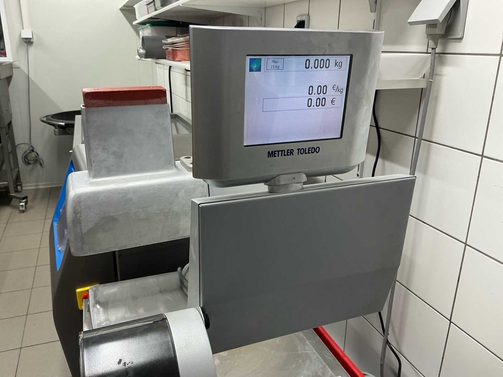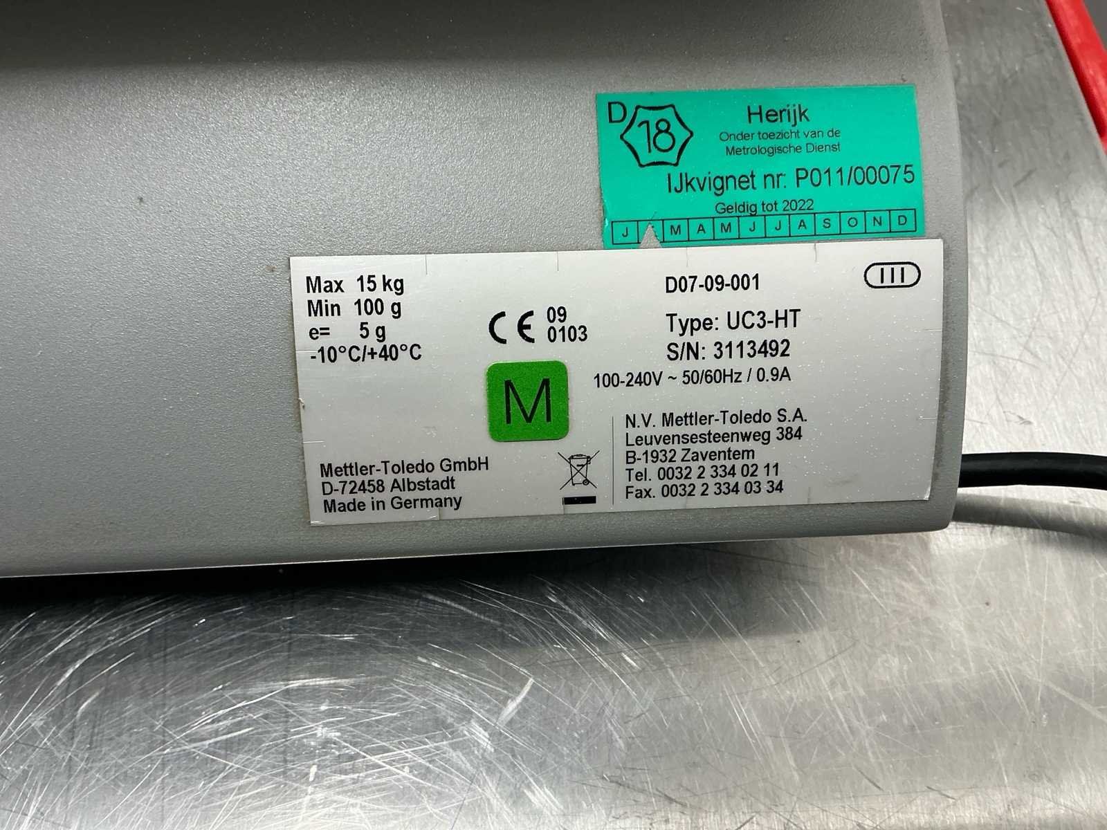 Te koop aangeboden: Mettler Toledo UC3-HT commerciële weegschaal met touchscreen en geïntegreerde bonprinter. Deze professionele winkelweegschaal is geschikt voor gebruik in slagerijen, voedingswinkels en retailomgevingen waar nauwkeurige weging en prijsberekening vereist zijn. De weegschaal beschikt over een duidelijk touchscreen waarop gewicht, prijs per kilogram en totaalprijs overzichtelijk worden weergegeven. Het systeem laat toe om PLU’s, artikelen en prijzen te beheren en ondersteunt diverse functies zoals tarra, nulstelling, tweede prijs en bonkopie. De geïntegreerde thermische printer maakt het mogelijk om direct etiketten of kassabonnen af te drukken. Technische gegevens volgens typeplaatje: maximale capaciteit 15 kg, minimale weging 100 g, schaalverdeling 5 g. De weegschaal werkt op 100–240 V, 50/60 Hz en heeft een nominale stroom van 0,9 A. Het temperatuurbereik bedraagt -10°C tot +40°C. Type: UC3-HT, serienummer: 3113492. Geproduceerd door Mettler-Toledo GmbH (Duitsland). CE-gekeurd. De constructie is robuust en geschikt voor professioneel gebruik. Het weegplateau is uitgevoerd in roestvrij staal en eenvoudig te reinigen. De machine is voorzien van een display aan de voorzijde en printermodule aan de zijkant. De weegschaal verkeert in gebruikte maar verzorgde staat met normale gebruikssporen passend bij professioneel gebruik. Een interessante opportuniteit voor ondernemers die op zoek zijn naar een betrouwbare en nauwkeurige winkelweegschaal van een gerenommeerd merk. No Merk: Mettler Toledo Type: UC3-HT