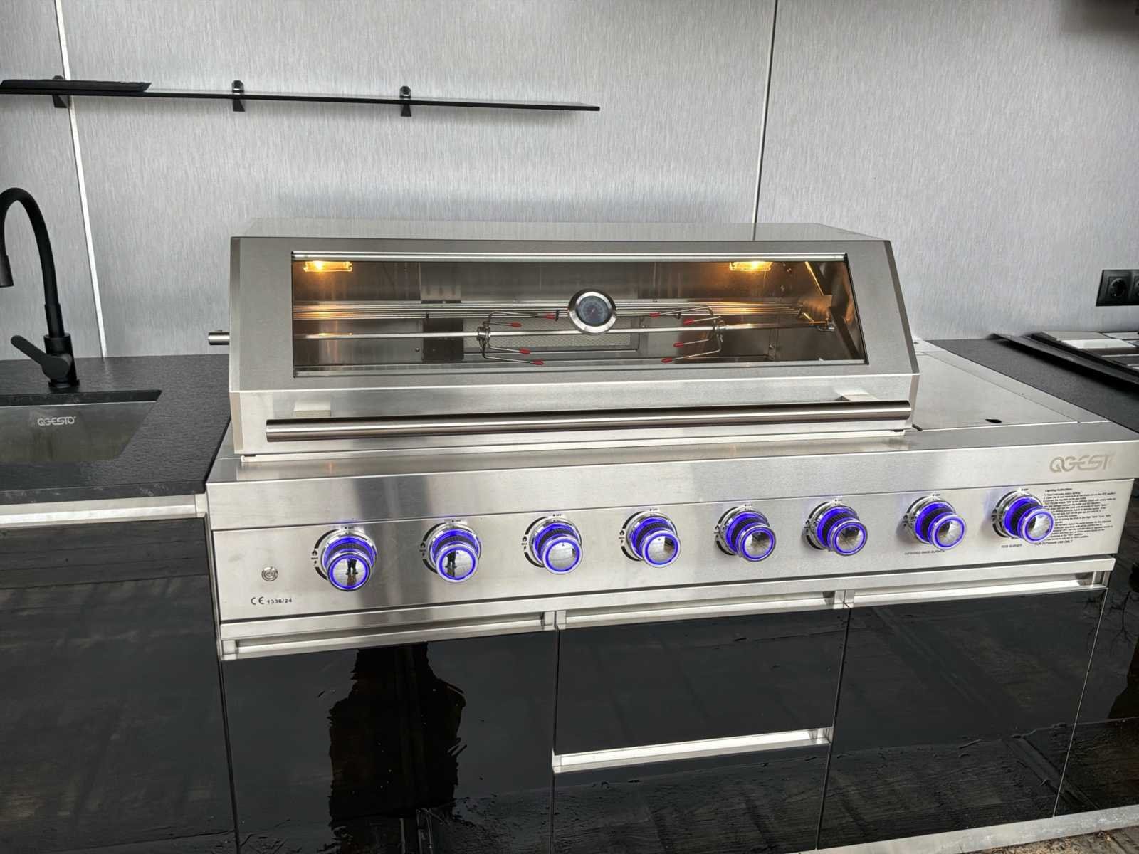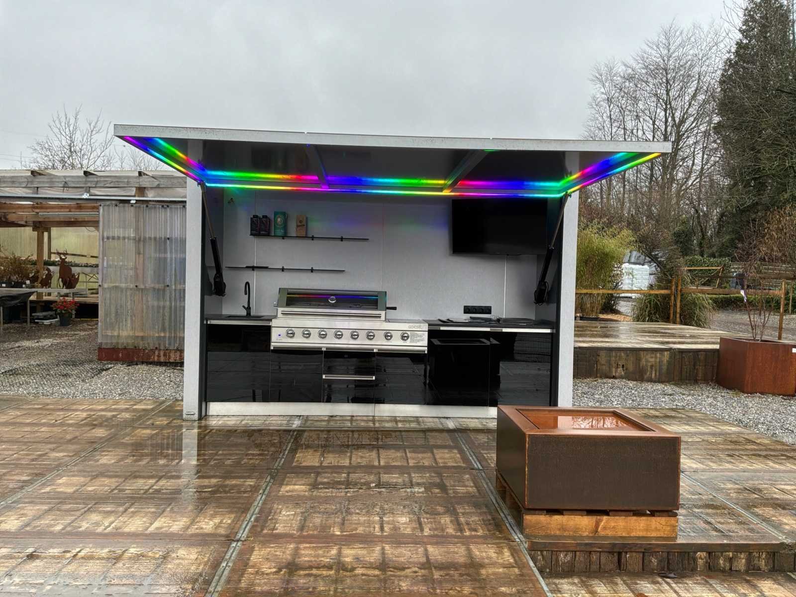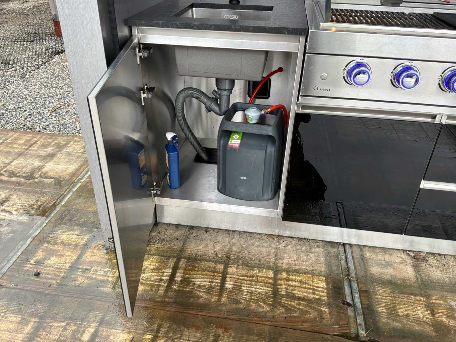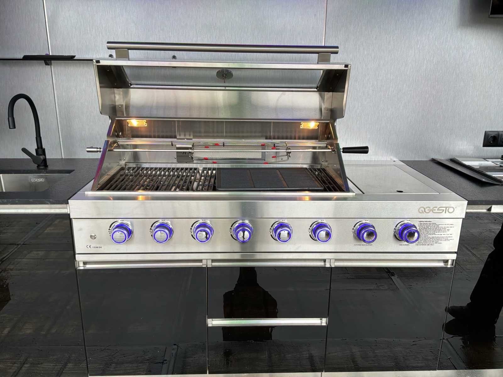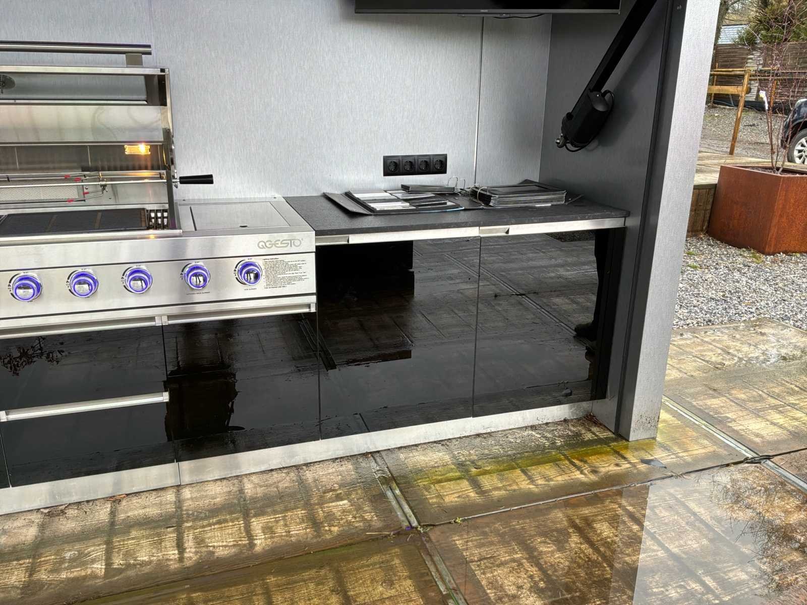 Complete buitenkeuken, displaymodel, volledig nieuw en nooit gebruikt. Uitgerust met een XXL gasbarbecue (147 cm), gootsteen met kraan, krik met afstandsbediening en openend systeem. LED-verlichting. Het omvat ook twee ingebouwde koelkasten en verschillende opslagunits. Vooruitrusting voor installatie van een geïntegreerd audiosysteem. TV inbegrepen in het perspectief. Binnenstopcontacten zijn aanwezig, waaronder de toevoeging van een bierpomp of ijsmaker. Let op: Verwijdering volledig op kosten van de koper. De constructie kan niet worden afgebroken. U moet een geschikte oplegger voor transport en een kraan voor het verplaatsen verzorgen. De verkoper kan echter helpen met de logistieke procedures als u dat wilt. (diensten niet inbegrepen bij de aankoop) No Merk: Qgesto Model: Port xxl Kleur: Grijs en zwart Gewicht: 670kg Lengte: 366cm Breedte: 98cm Hoogte: 234cm Materiaal: Roestvrij stalen stacbondglas en steen